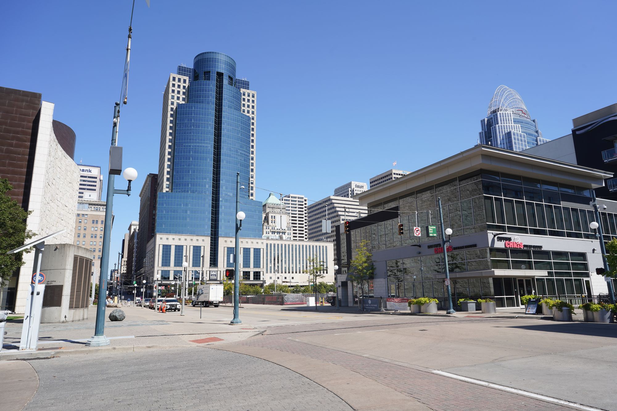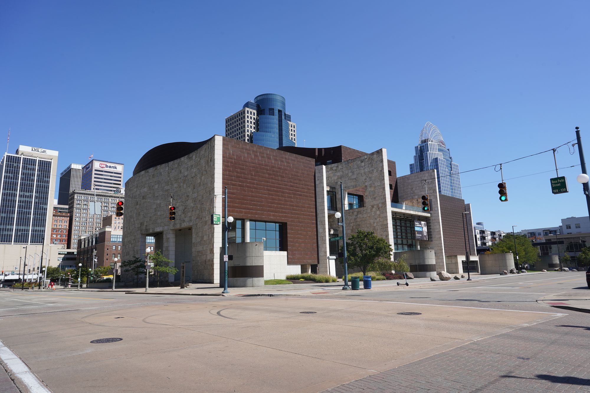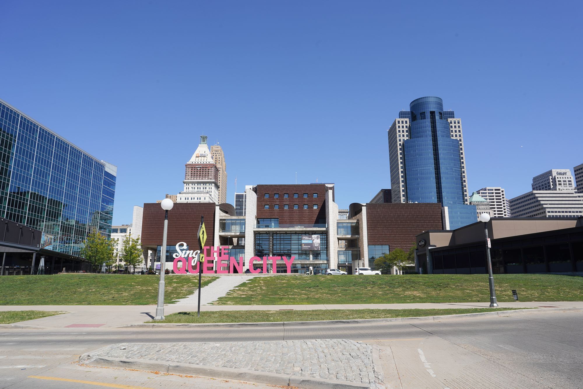 The left brown building is the National Underground Railroad Freedom Center