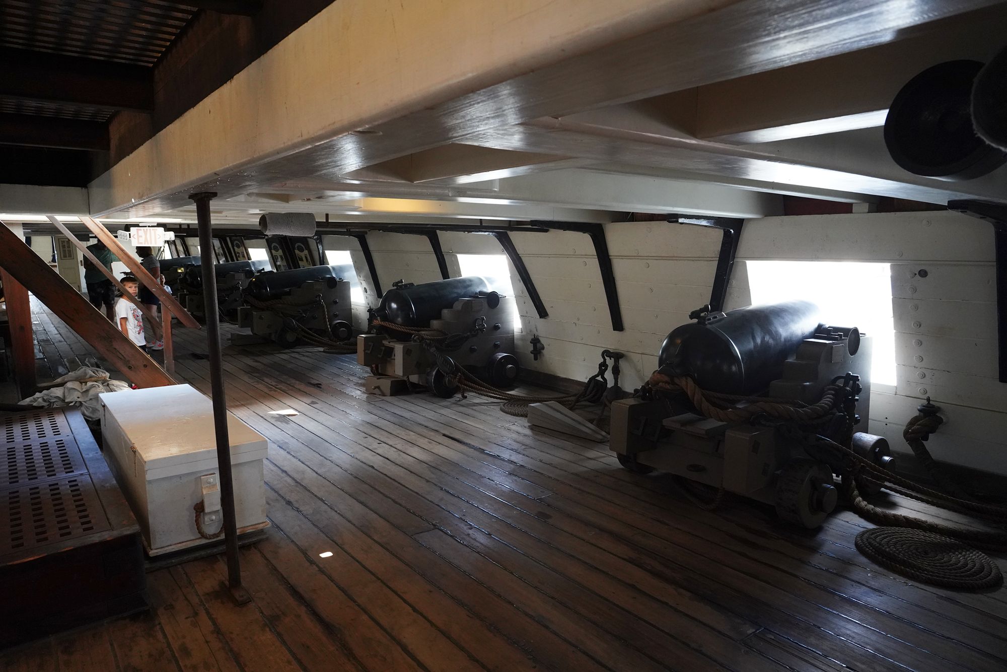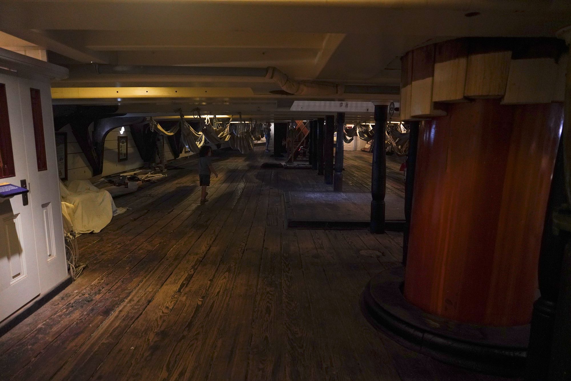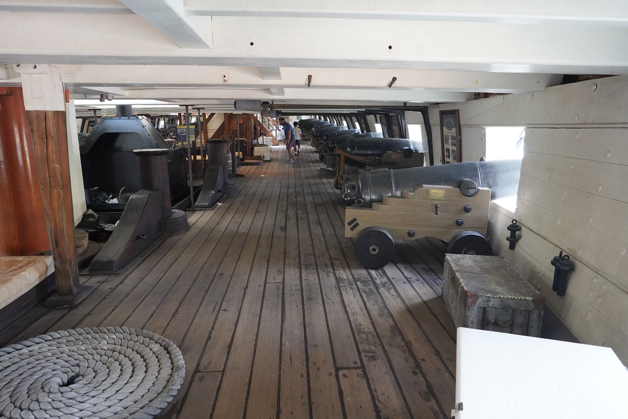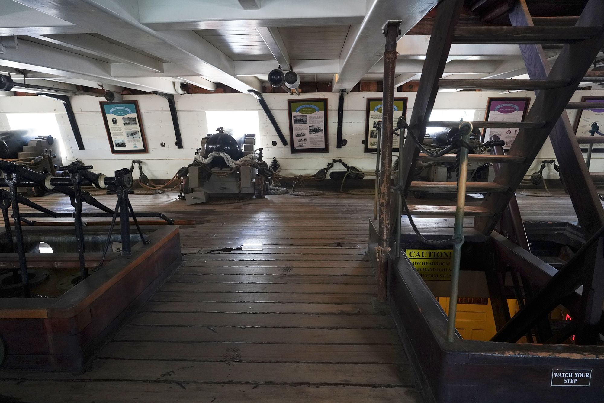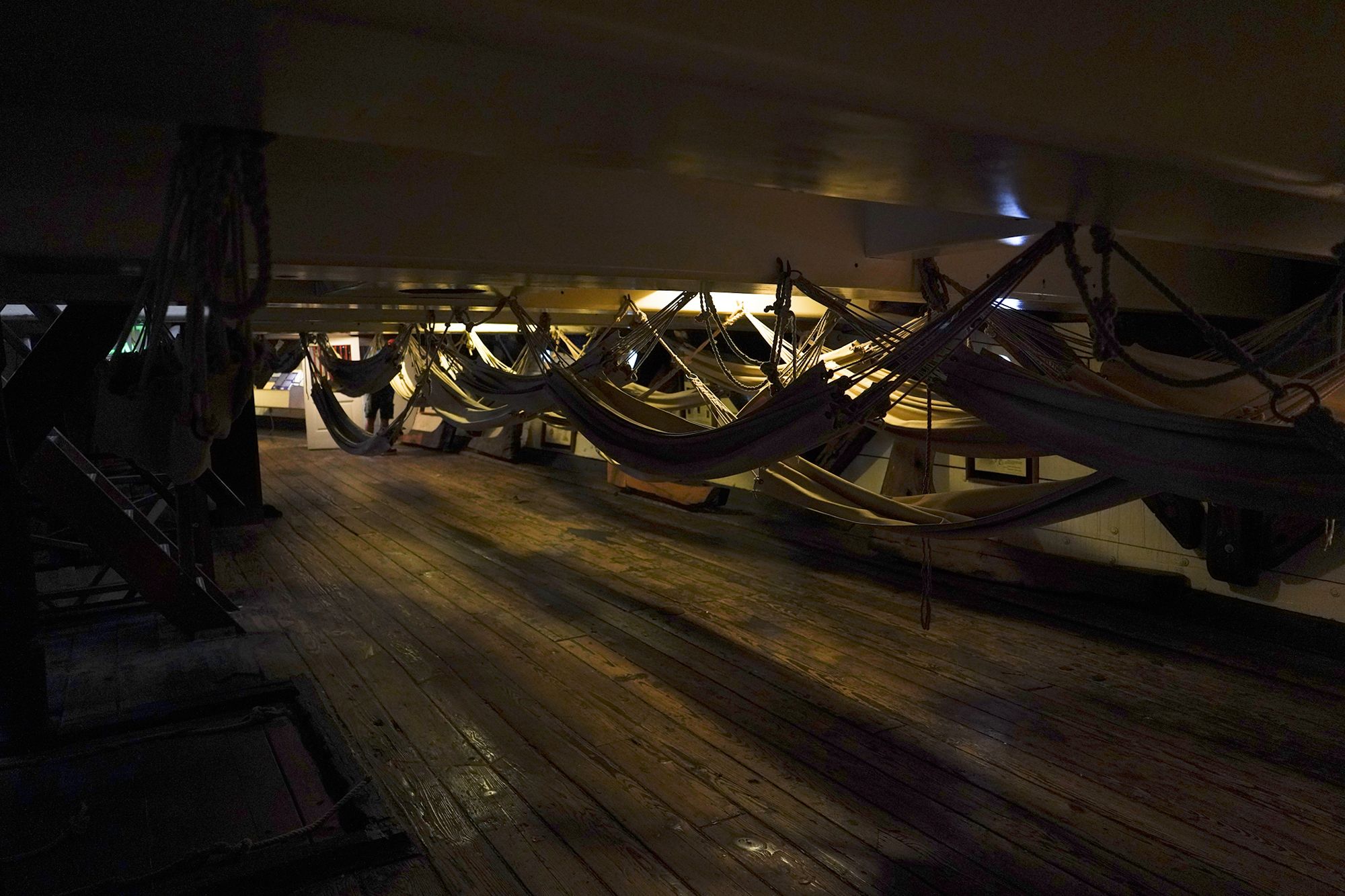 The ship features multiple decks — including the spar deck, gun deck, berth deck, and hold — connected by steep wooden ladders and lined with heavy rope rigging. Below deck, the space is tight and low-ceilinged, with hammocks hung side by side where sailors lived, slept, and worked.
