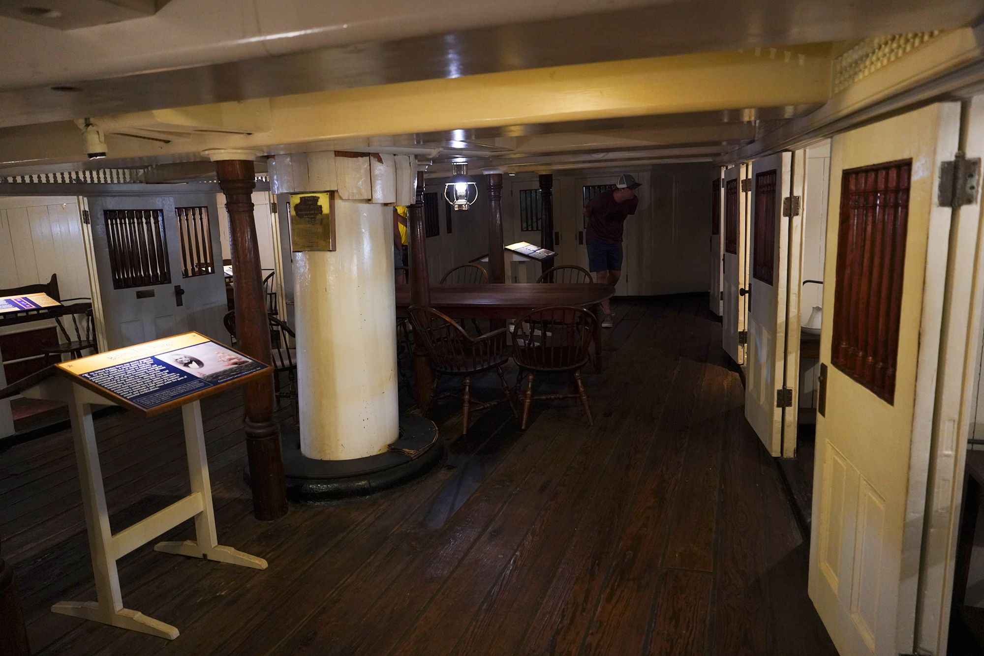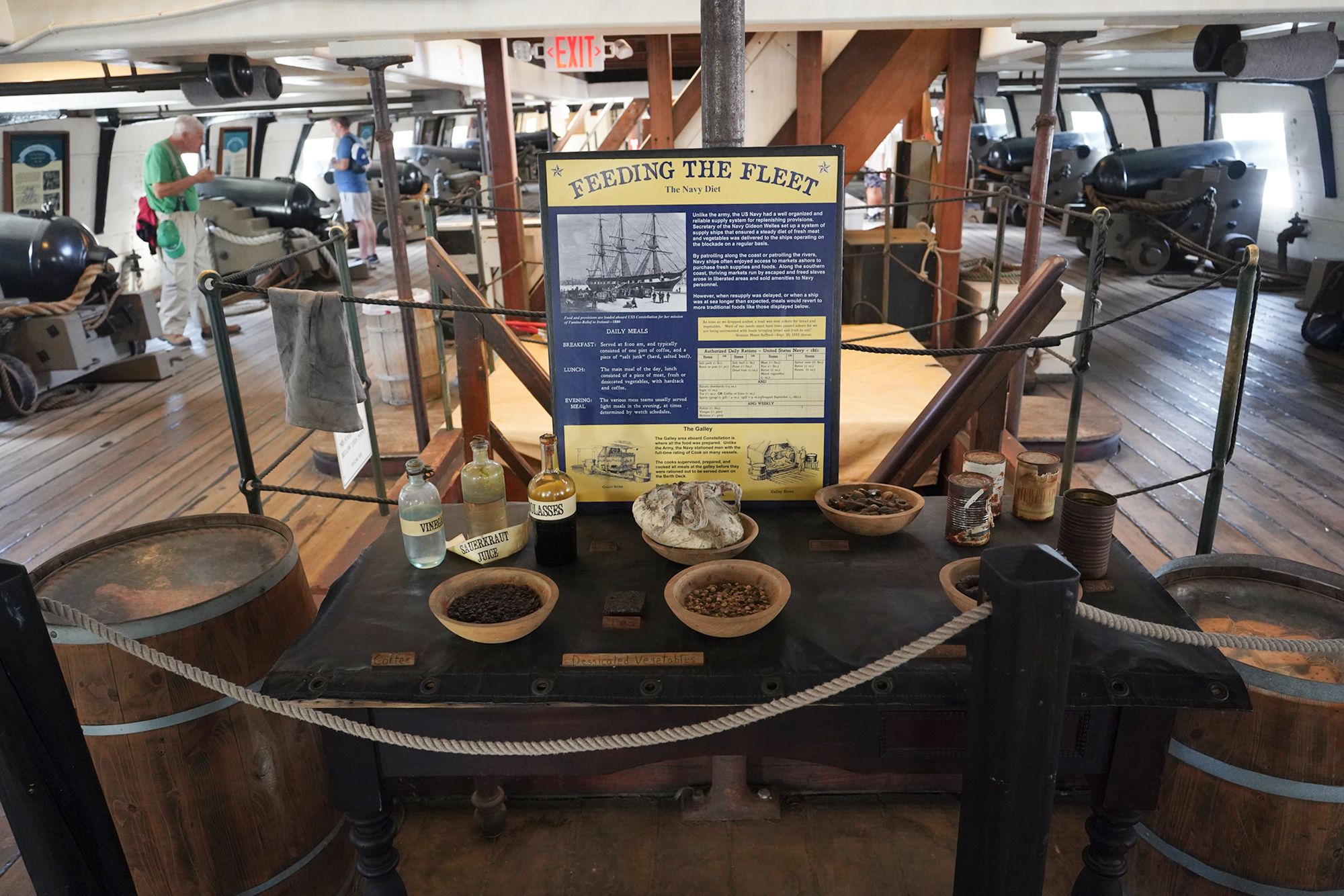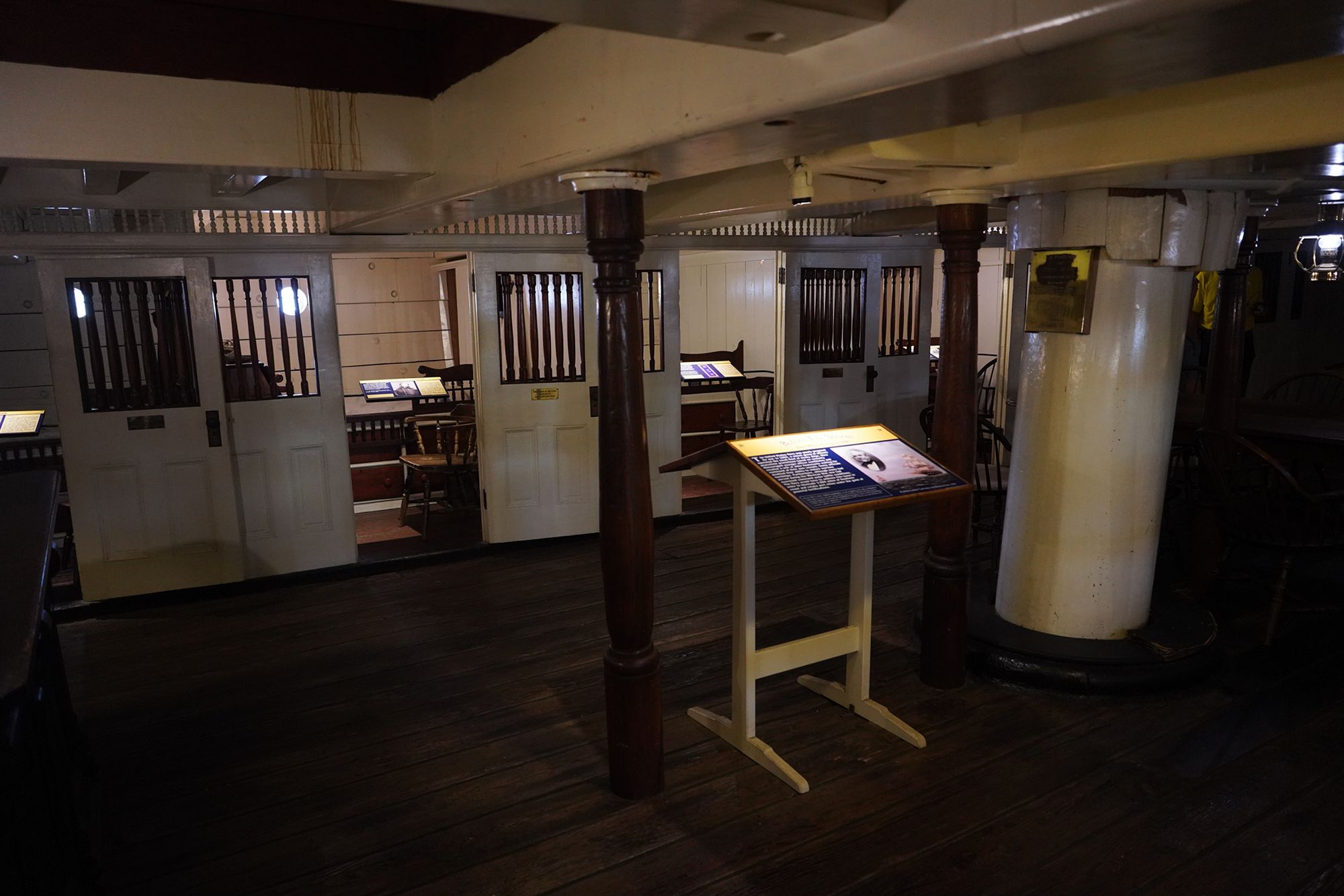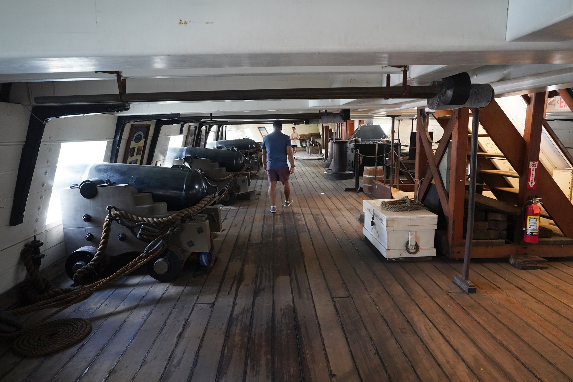 The ship features multiple decks — including the spar deck, gun deck, berth deck, and hold — connected by steep wooden ladders and lined with heavy rope rigging. Below deck, the space is tight and low-ceilinged, with hammocks hung side by side where sailors lived, slept, and worked.