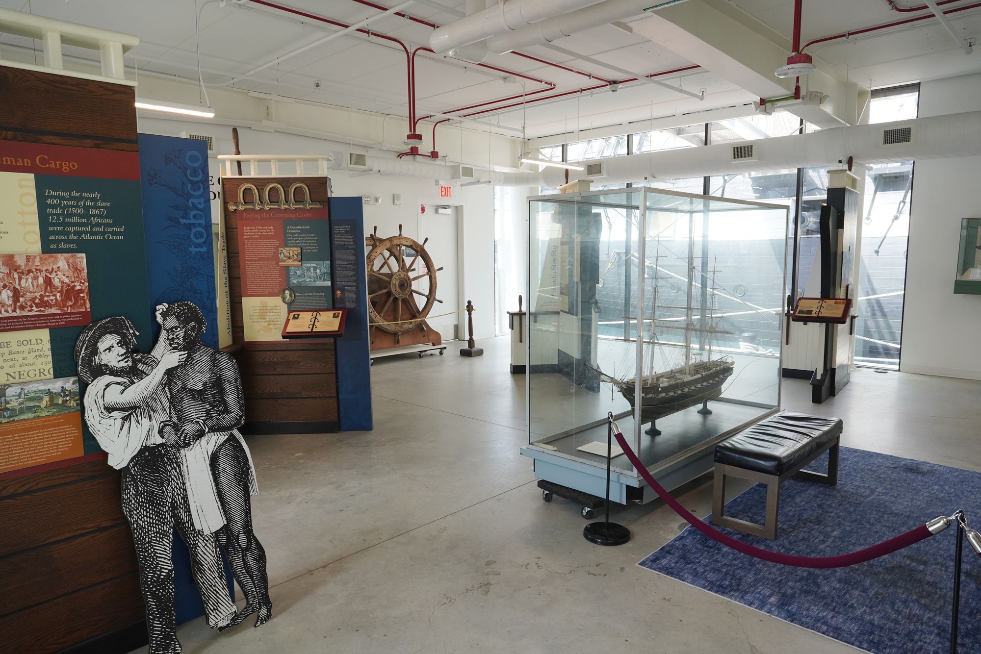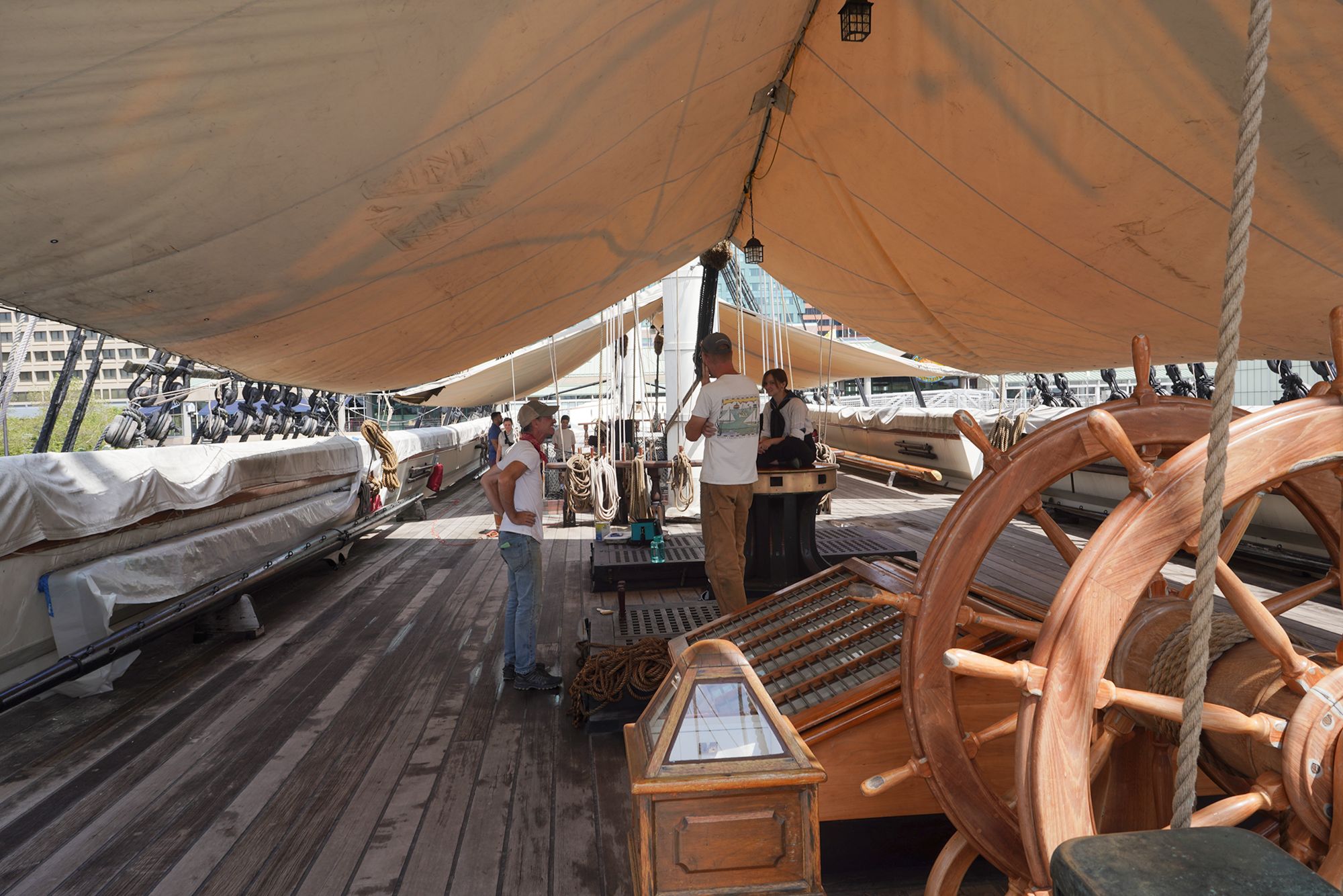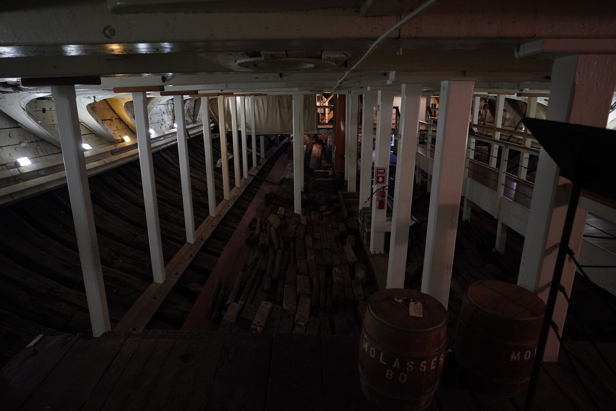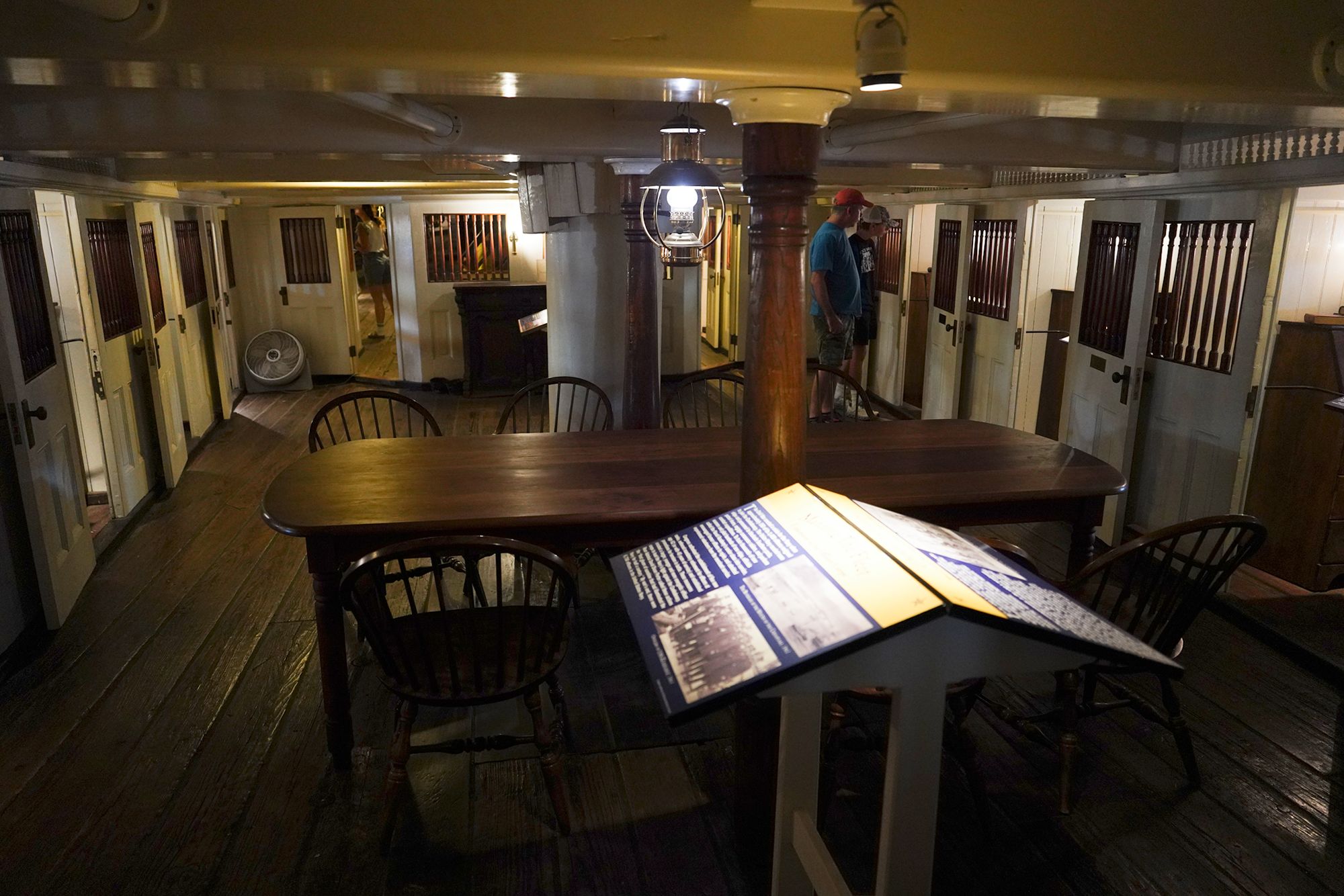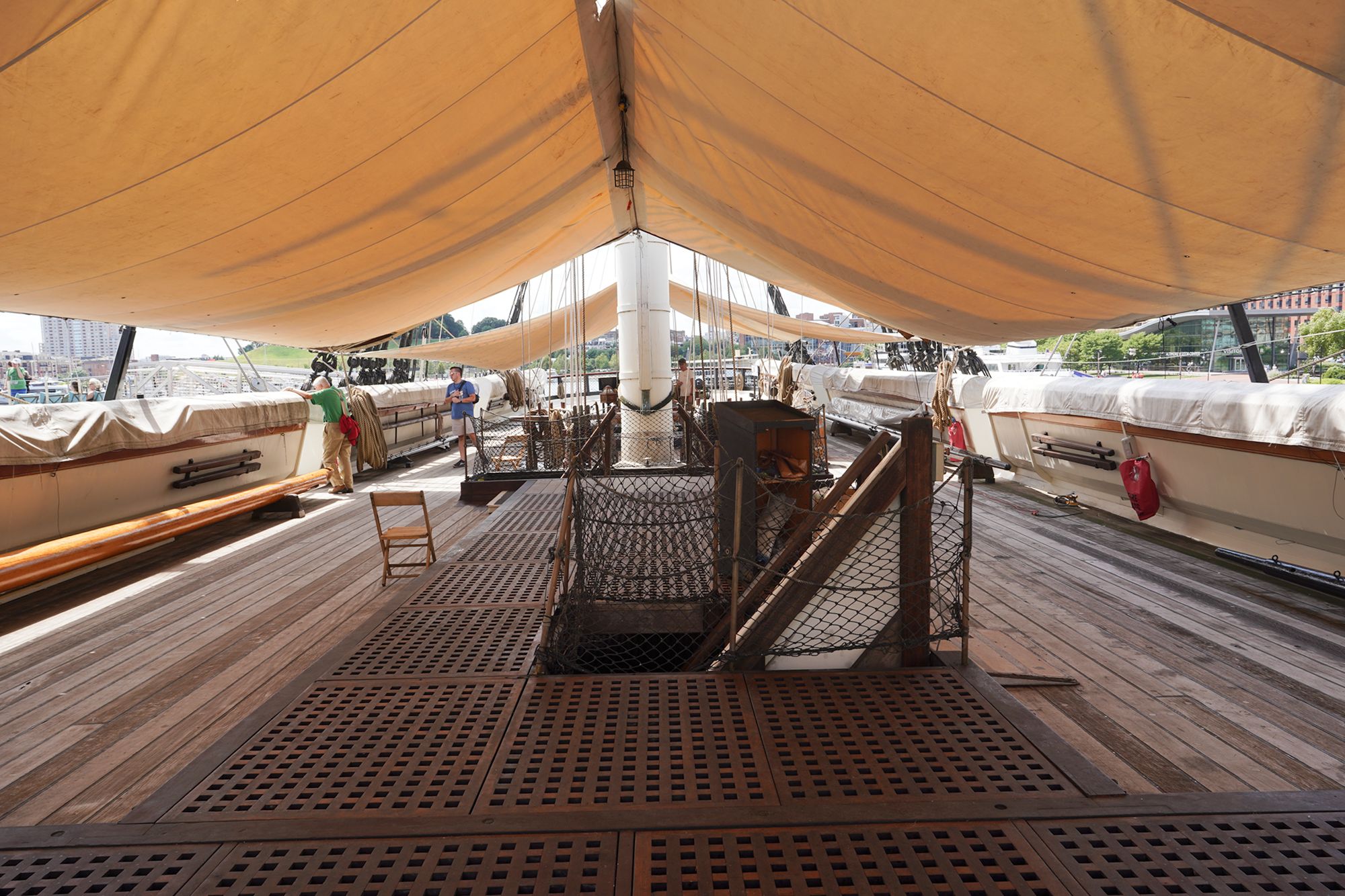 The ship features multiple decks — including the spar deck, gun deck, berth deck, and hold — connected by steep wooden ladders and lined with heavy rope rigging. Below deck, the space is tight and low-ceilinged, with hammocks hung side by side where sailors lived, slept, and worked.