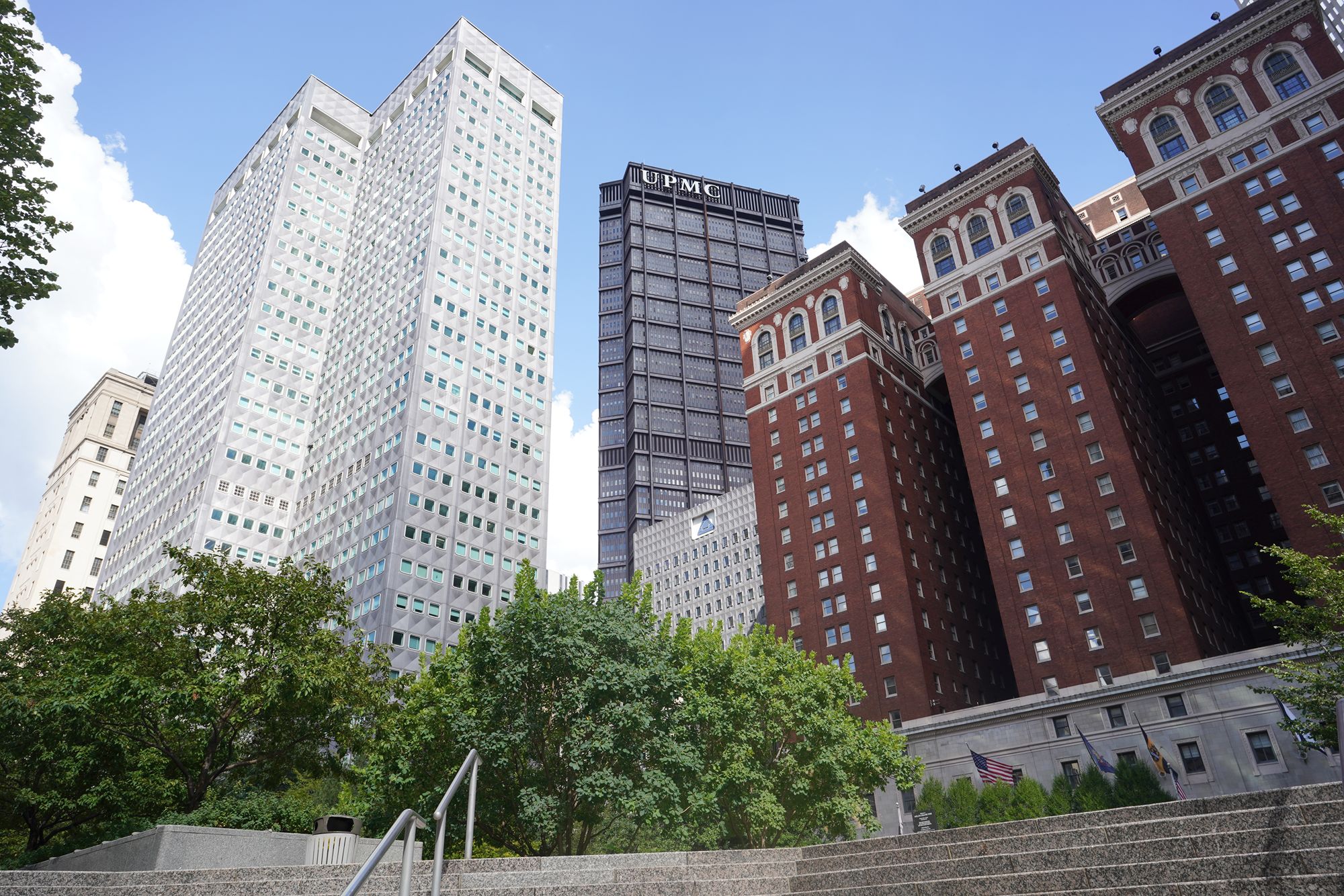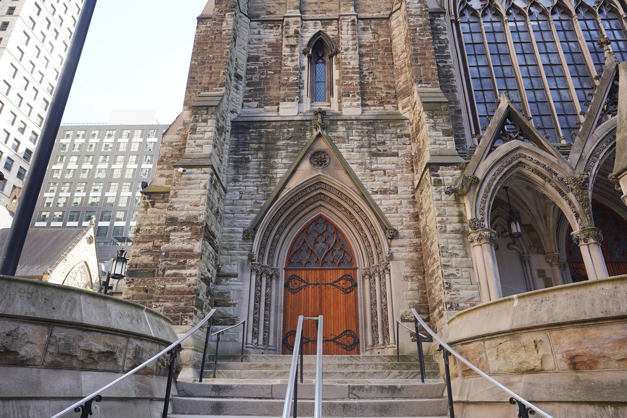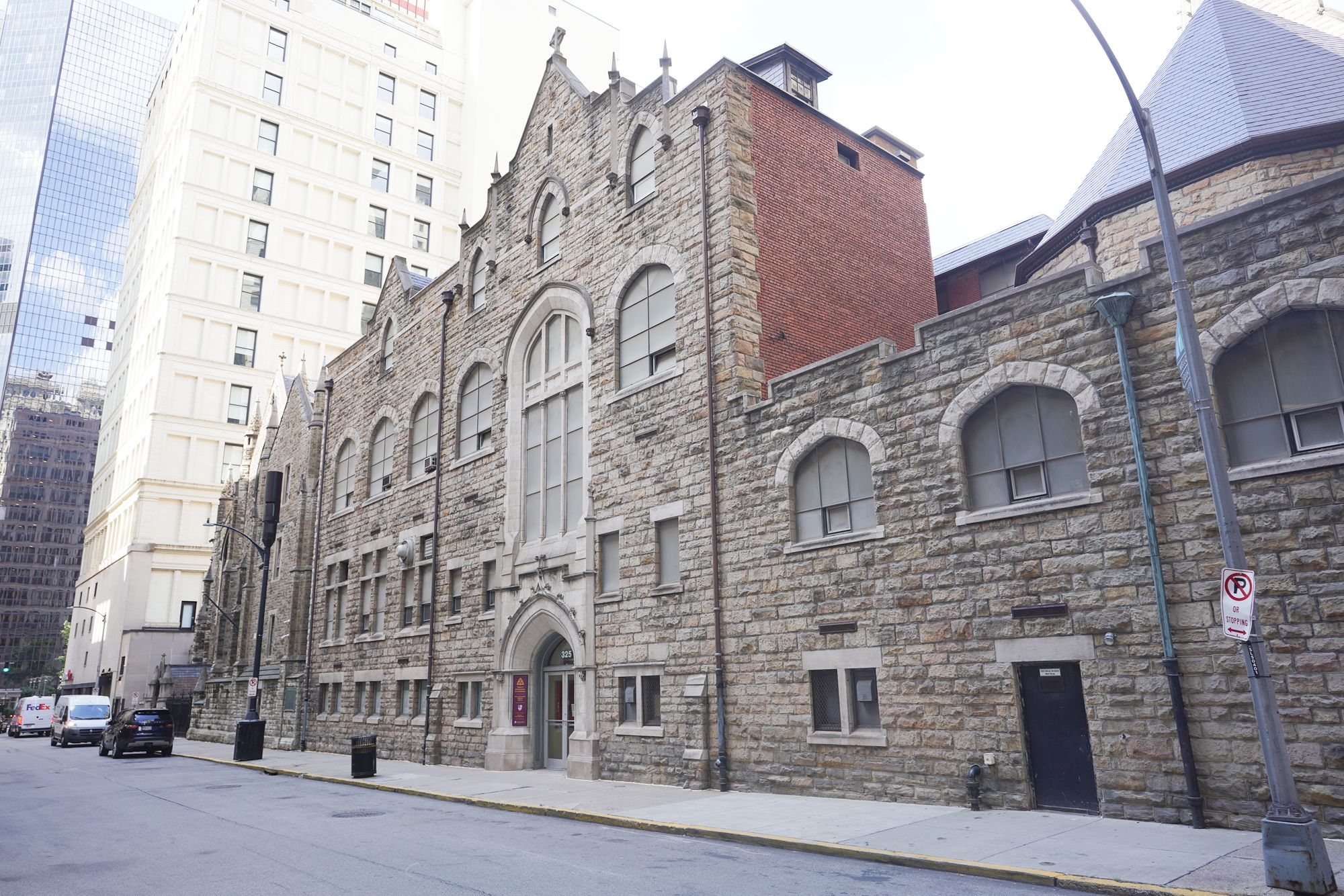 A view of the back side of the First Presbyterian Church of Pittsburgh alongside the Episcopal Diocese of Pittsburgh buildings.