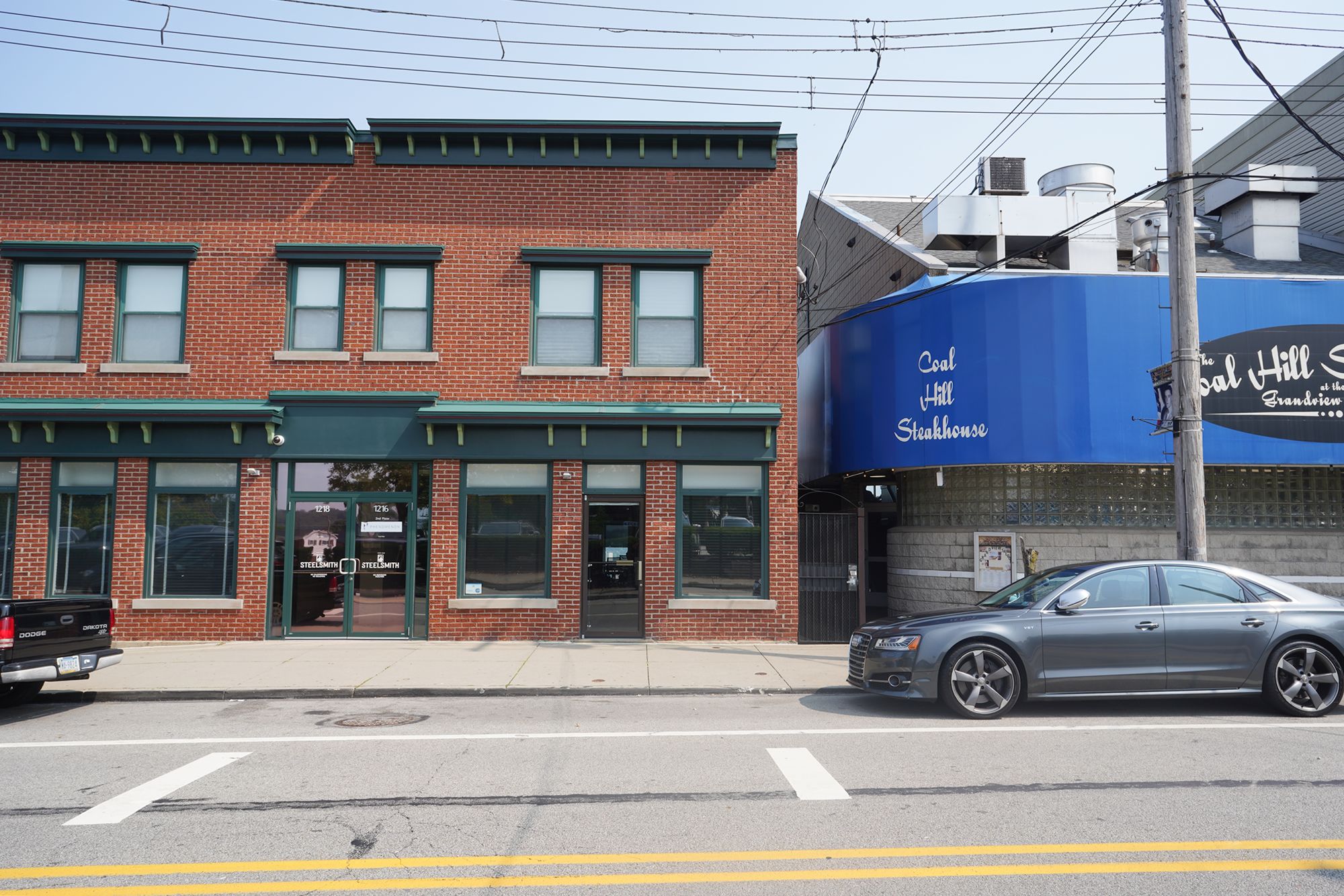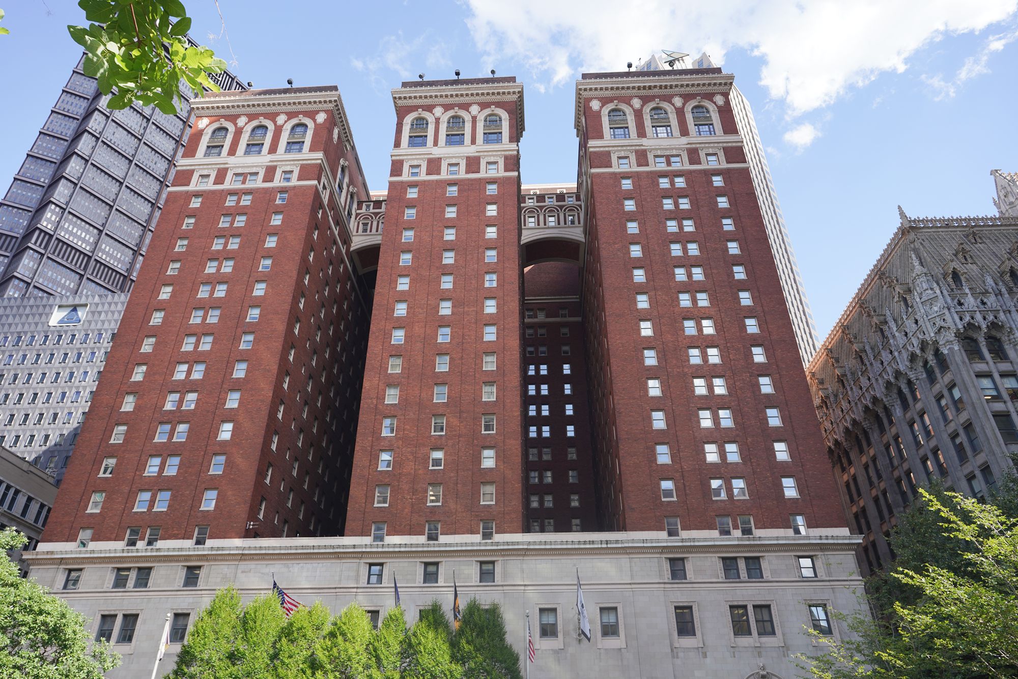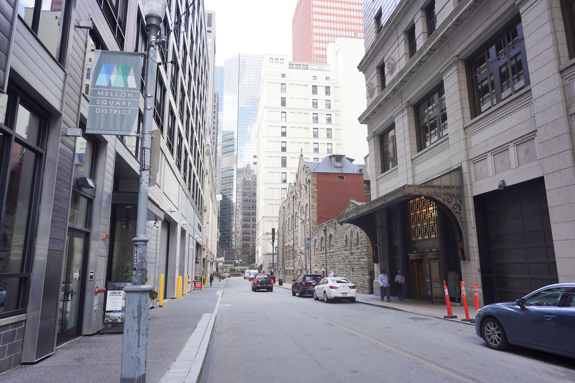 A view of the back side of the First Presbyterian Church of Pittsburgh alongside the Episcopal Diocese of Pittsburgh buildings.