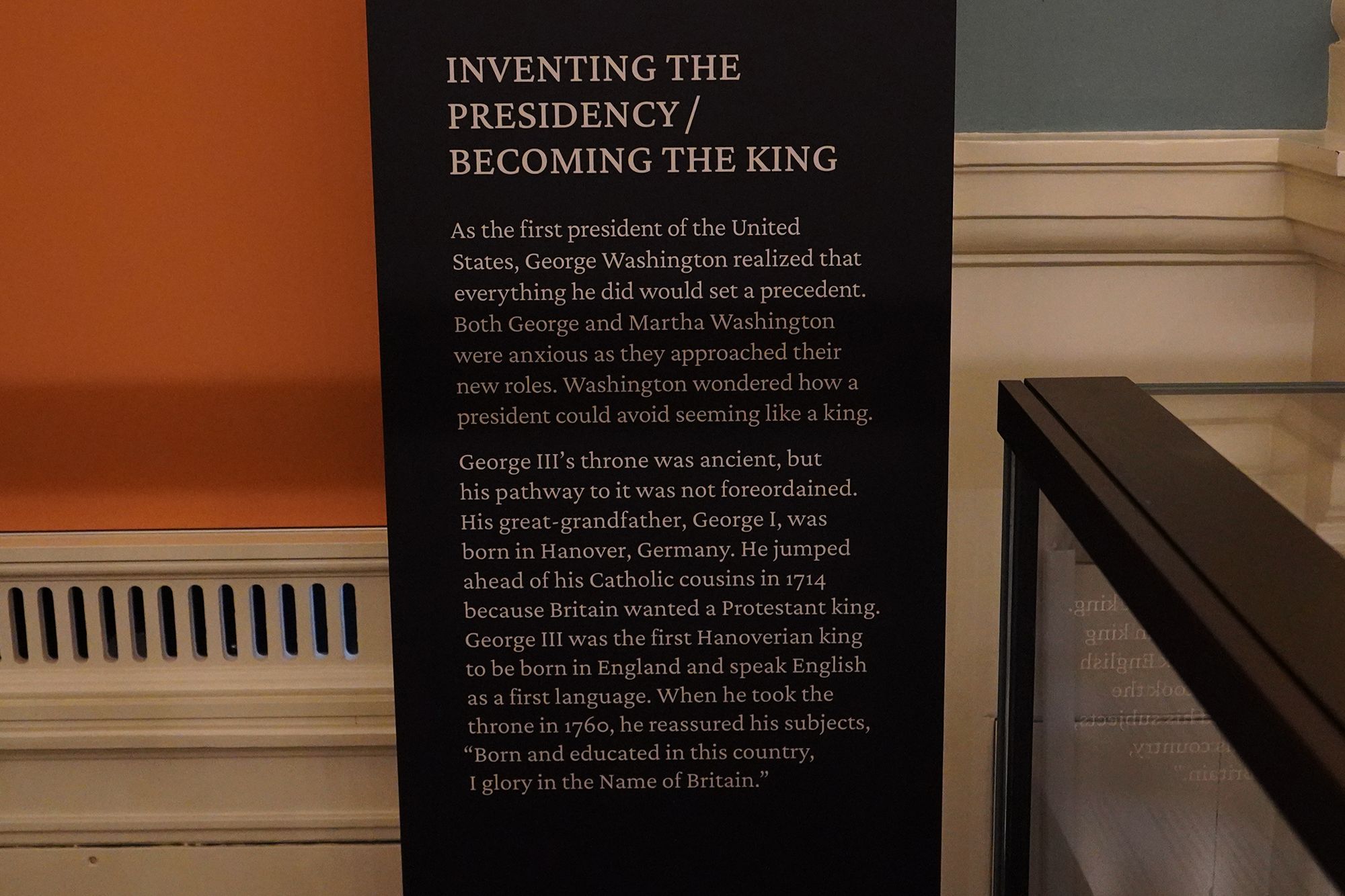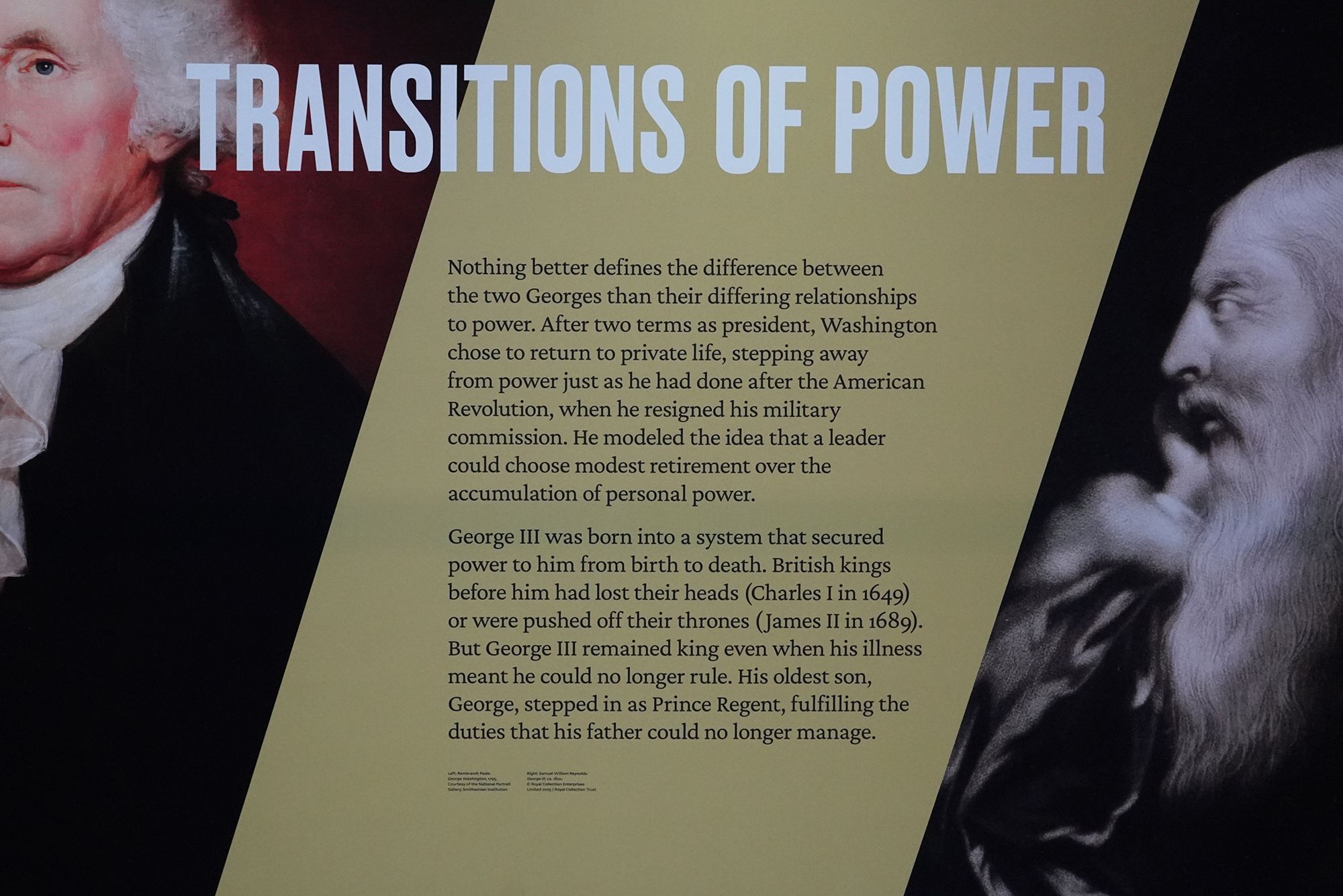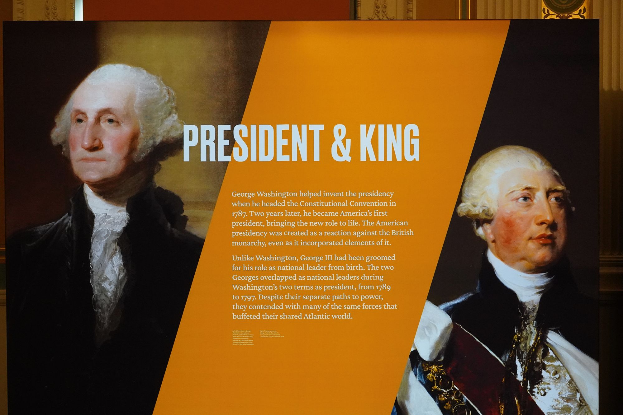 The theme “Inventing the Presidency / Becoming the King” contrasts the very different paths of George Washington and King George III after the American Revolution.
