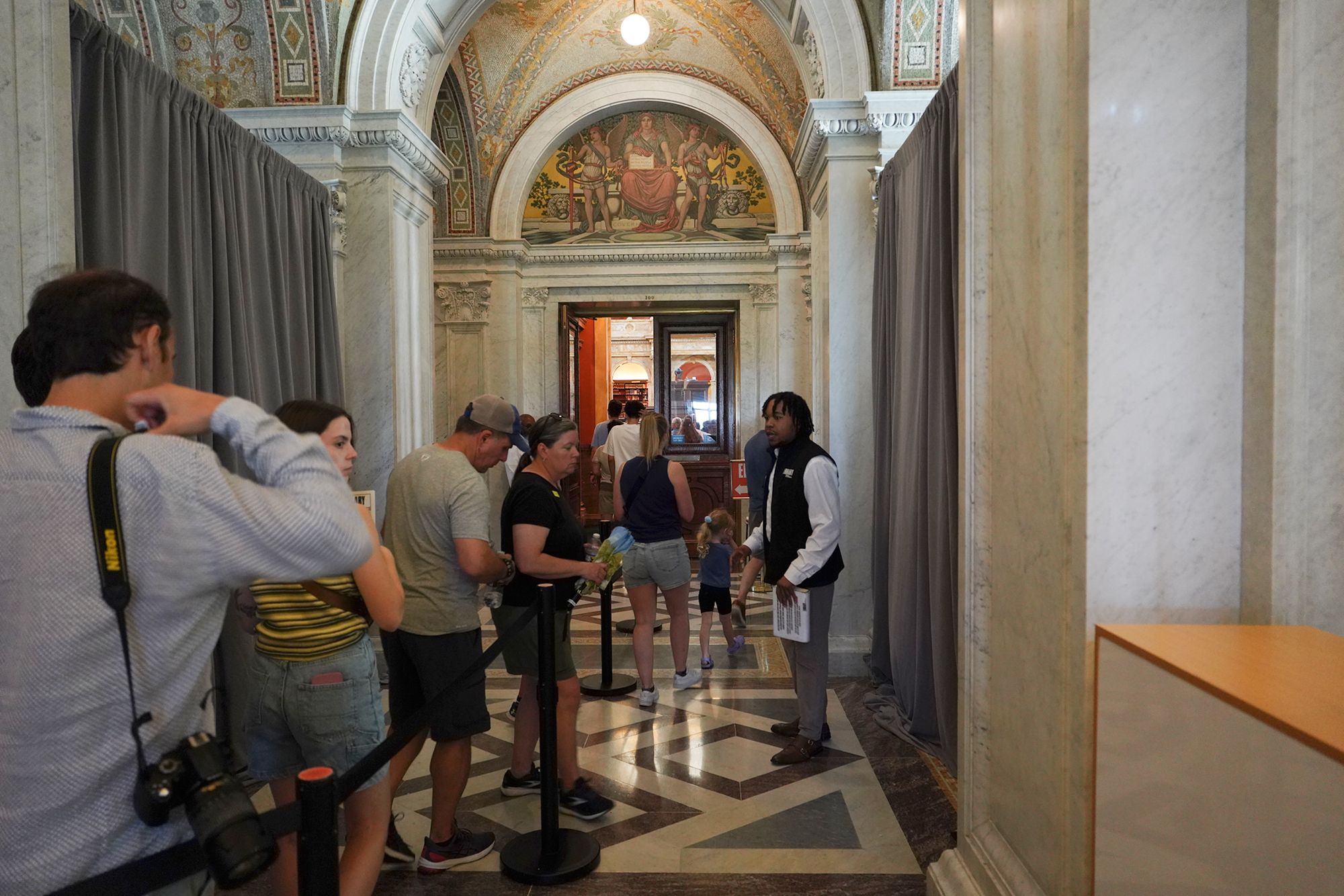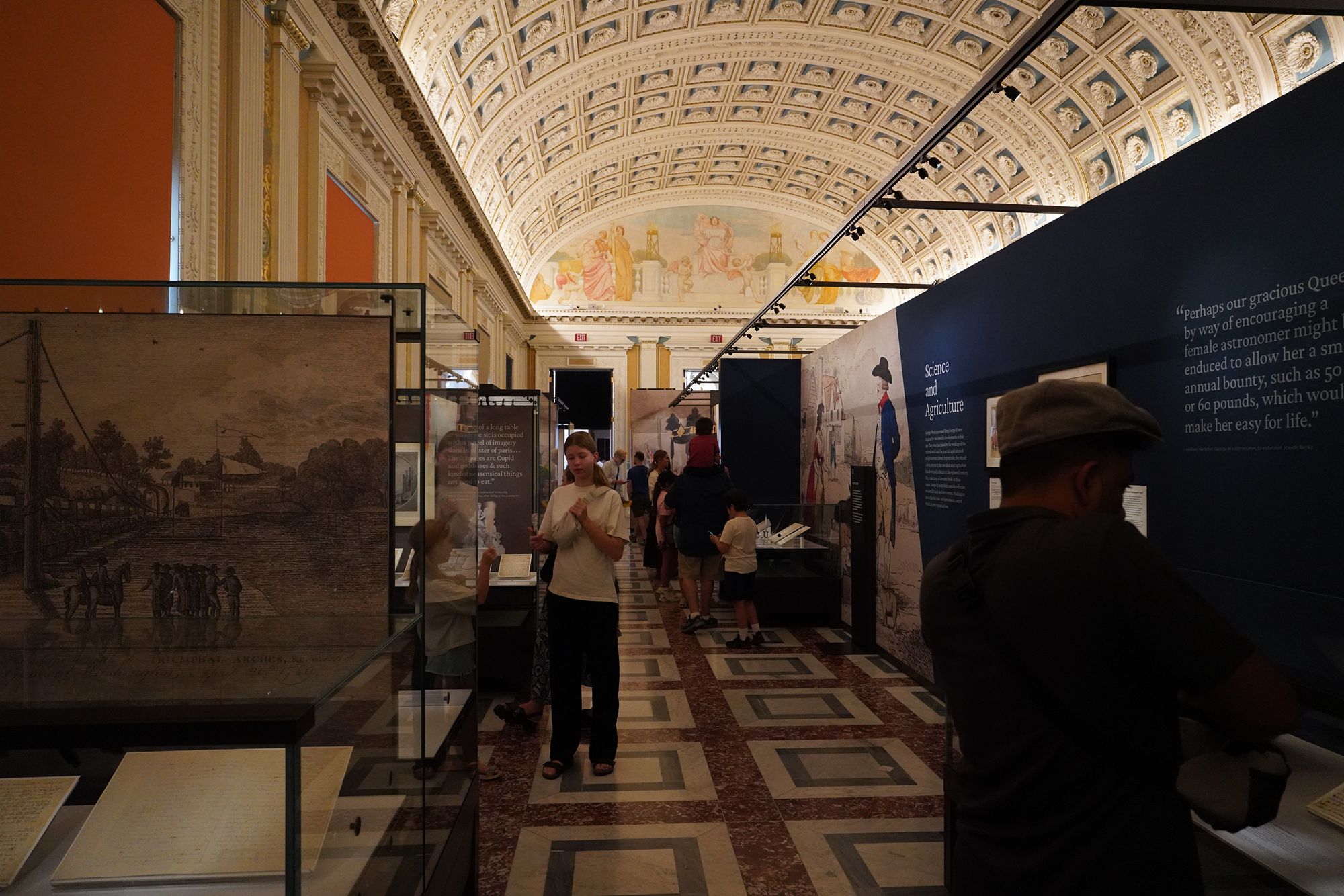 The first floor of the Library of Congress’s Thomas Jefferson Building is both grand and symbolic, serving as an introduction to the nation’s cultural and intellectual heritage. Visitors enter through the Great Hall, a beautiful space filled with marble staircases, mosaics, stained glass, and sculptures that celebrate knowledge, wisdom, and creativity.