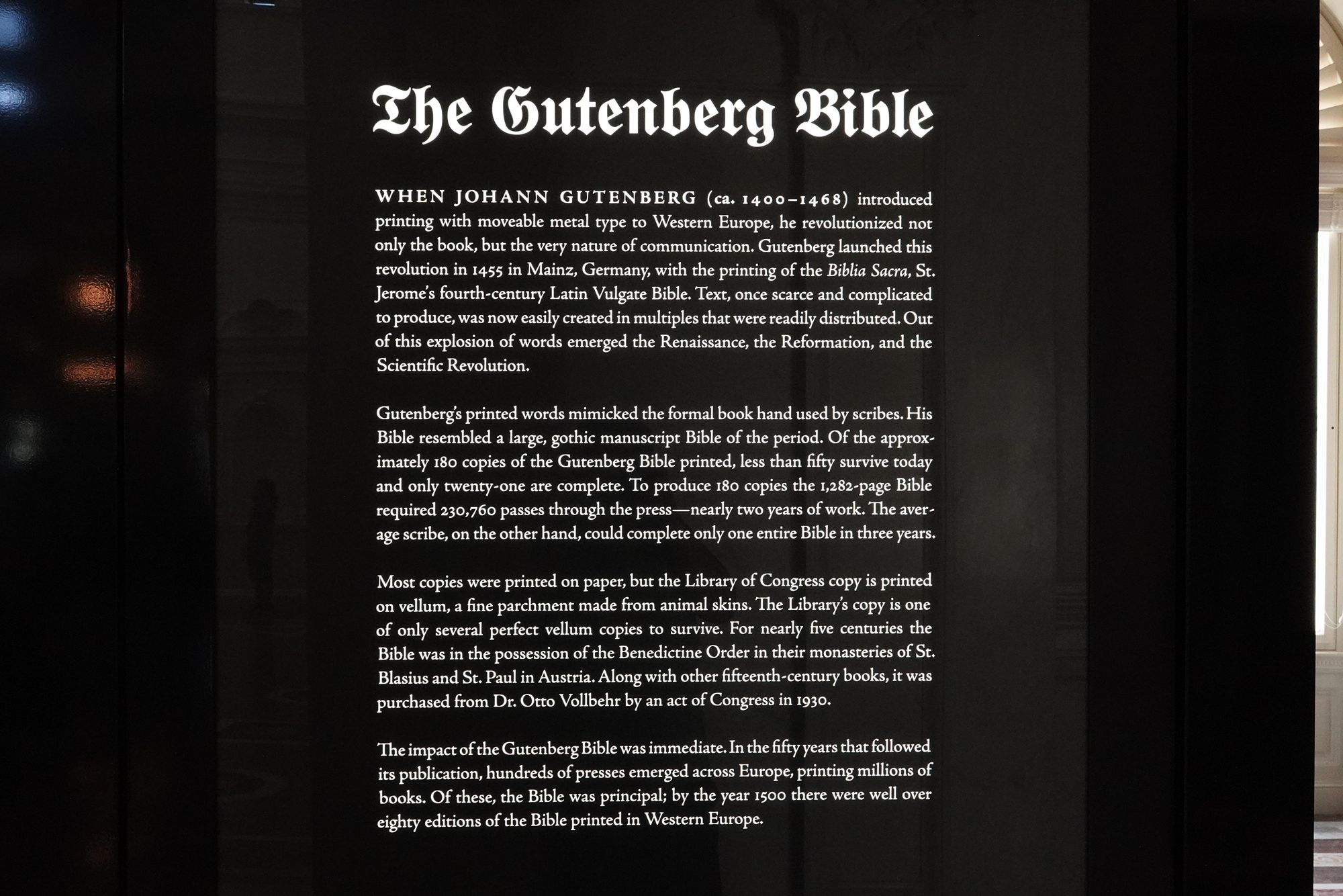 The Gutenberg Bible on display at the Library of Congress is one of the most treasured books in the world and a masterpiece of printing history. Created around 1455 by Johannes Gutenberg in Mainz, Germany, it was the first major book printed with movable metal type, marking the beginning of the age of mass communication and the spread of knowledge across Europe.