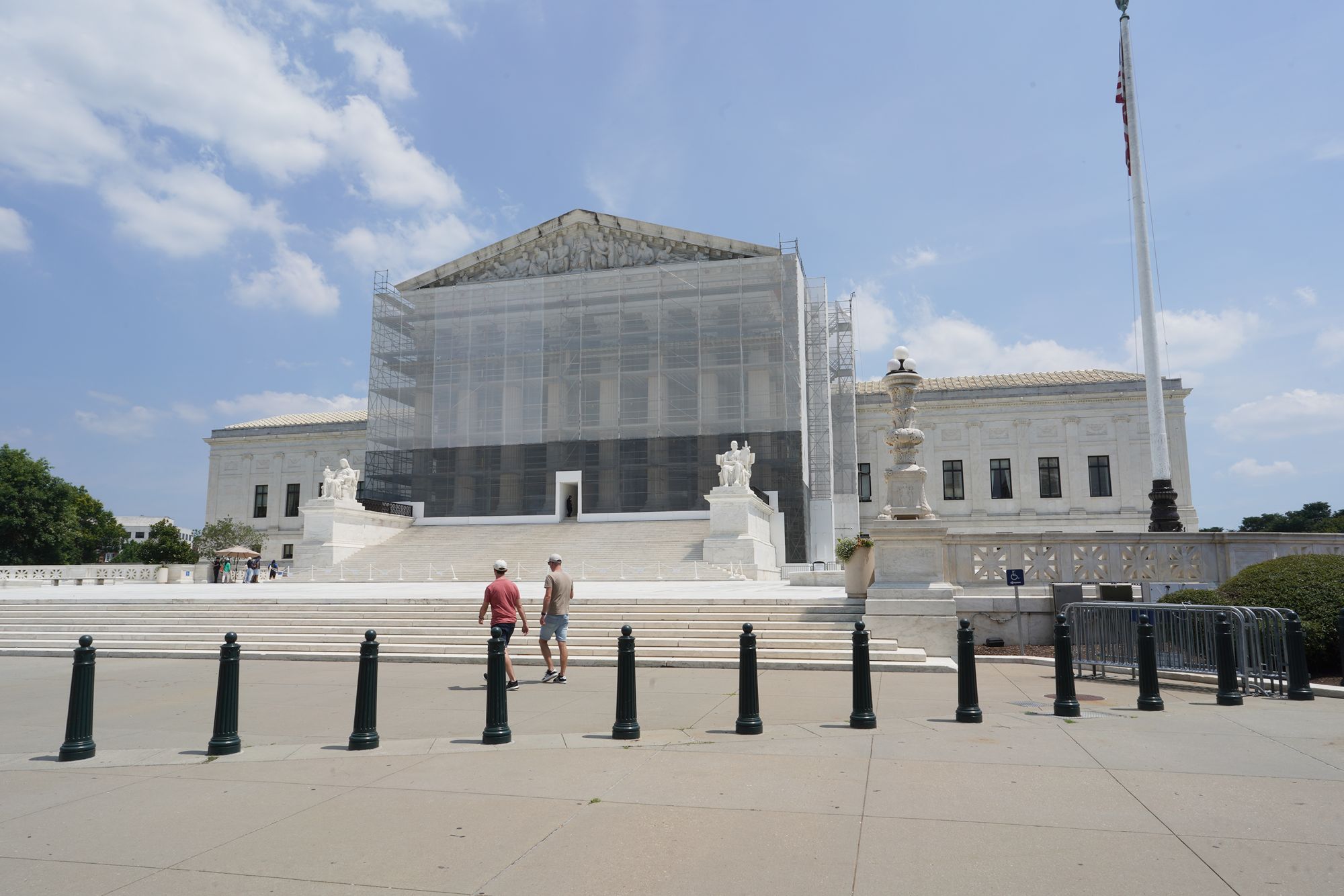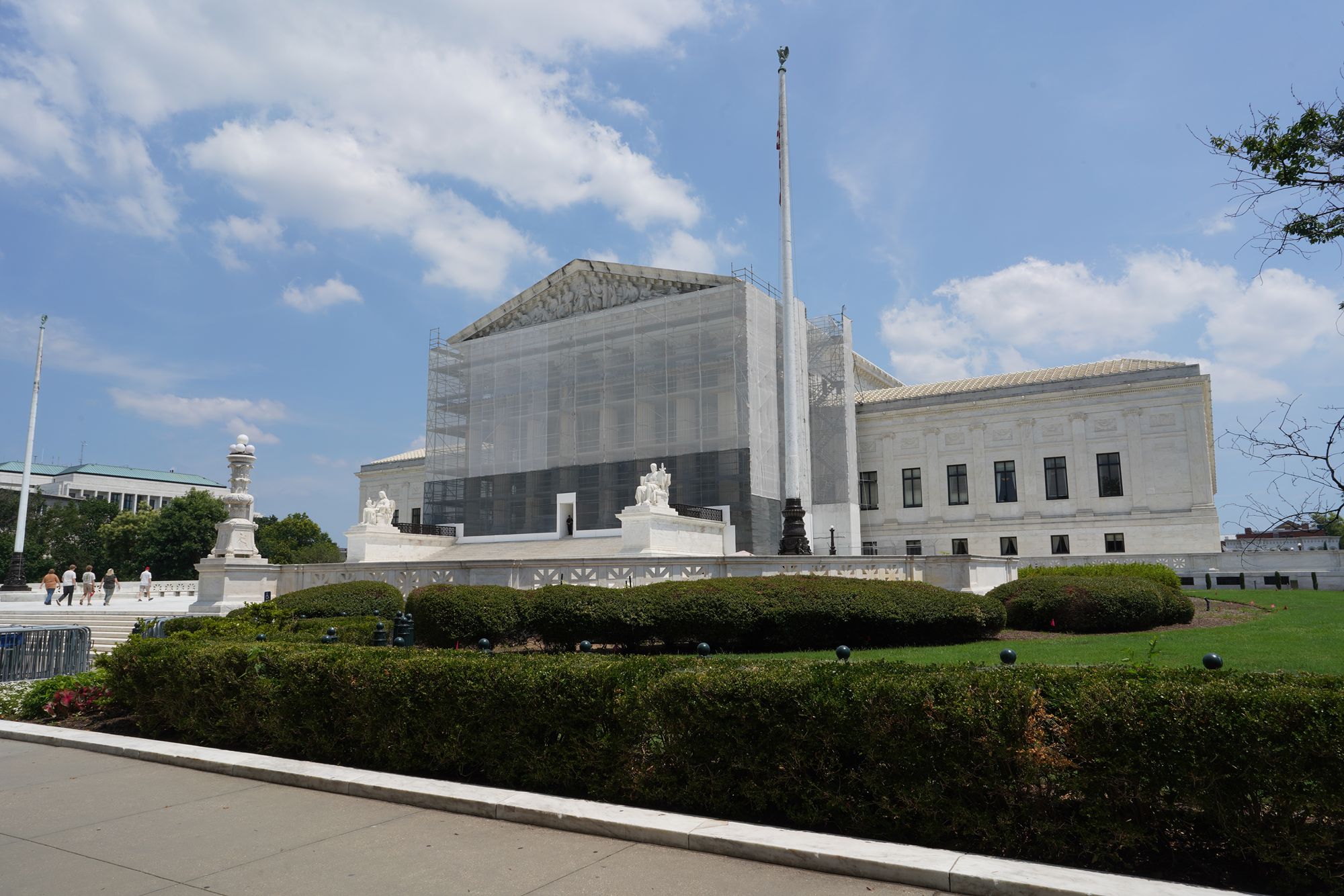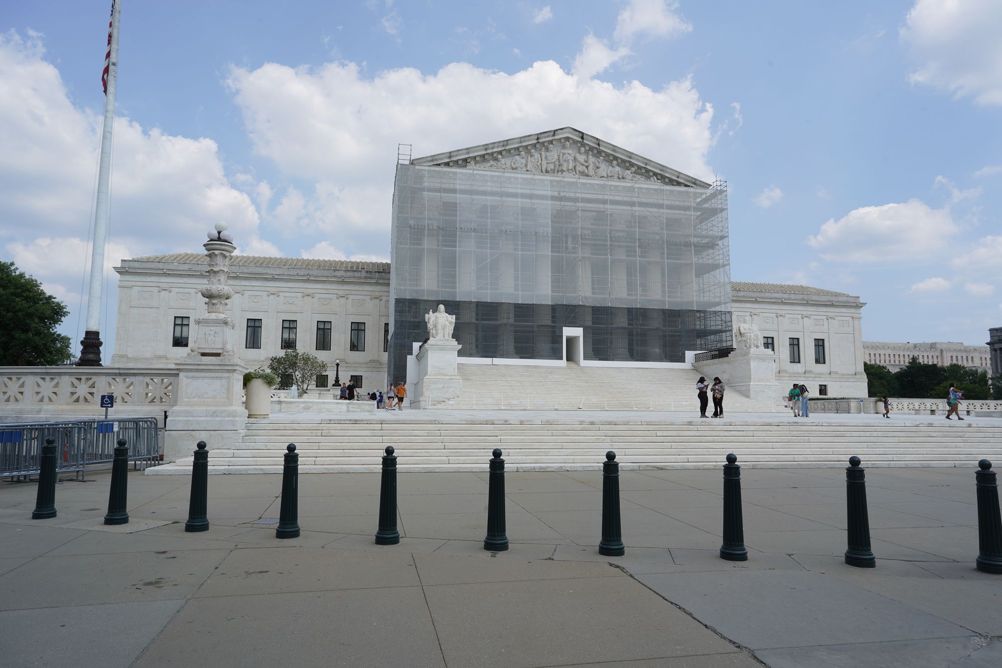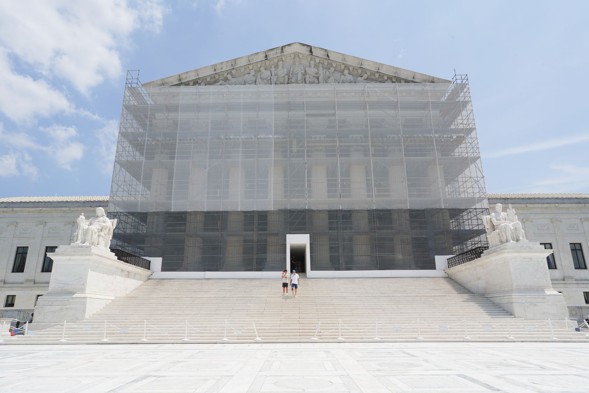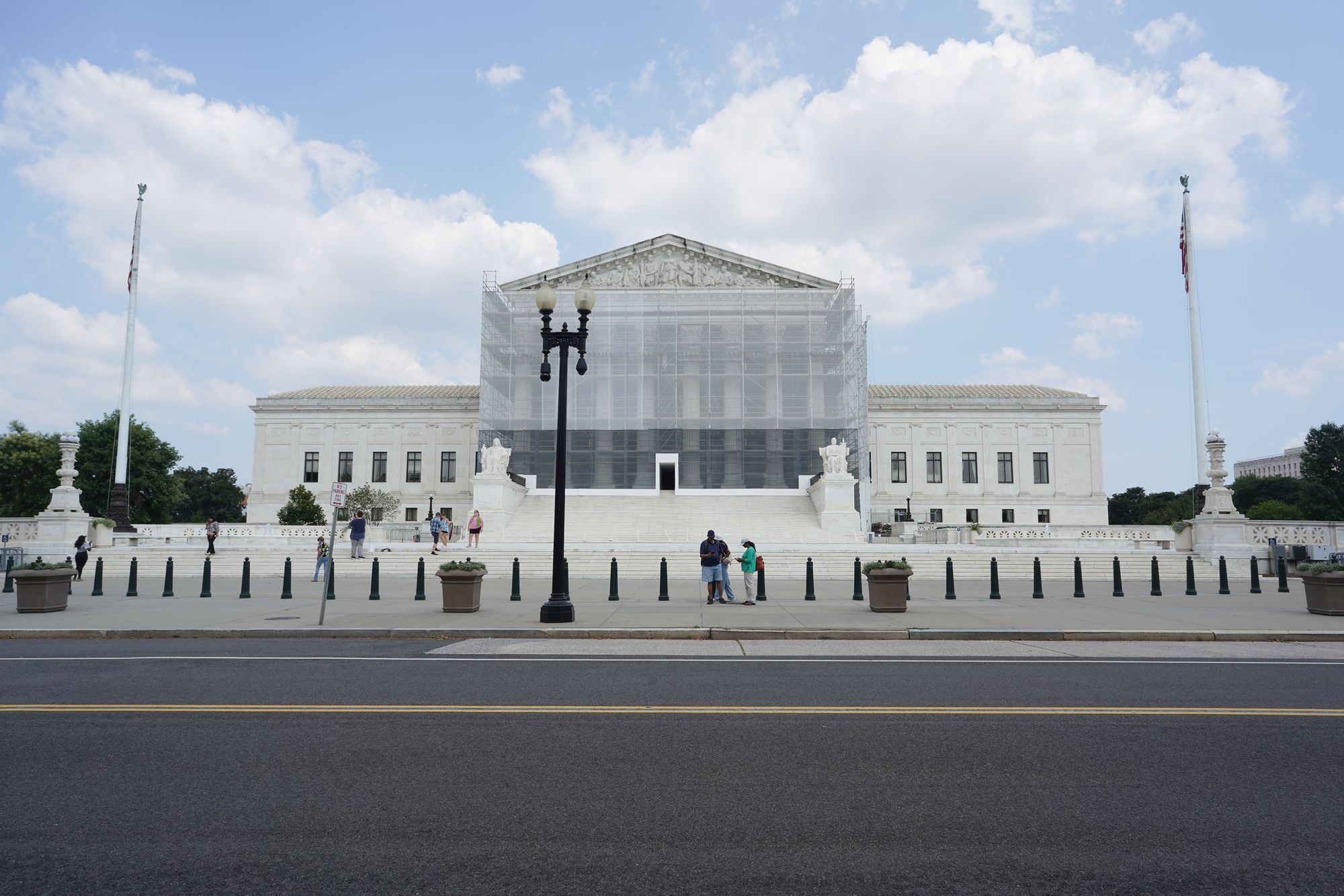 In front of the Supreme Court, across the street, stands the U.S. Capitol.