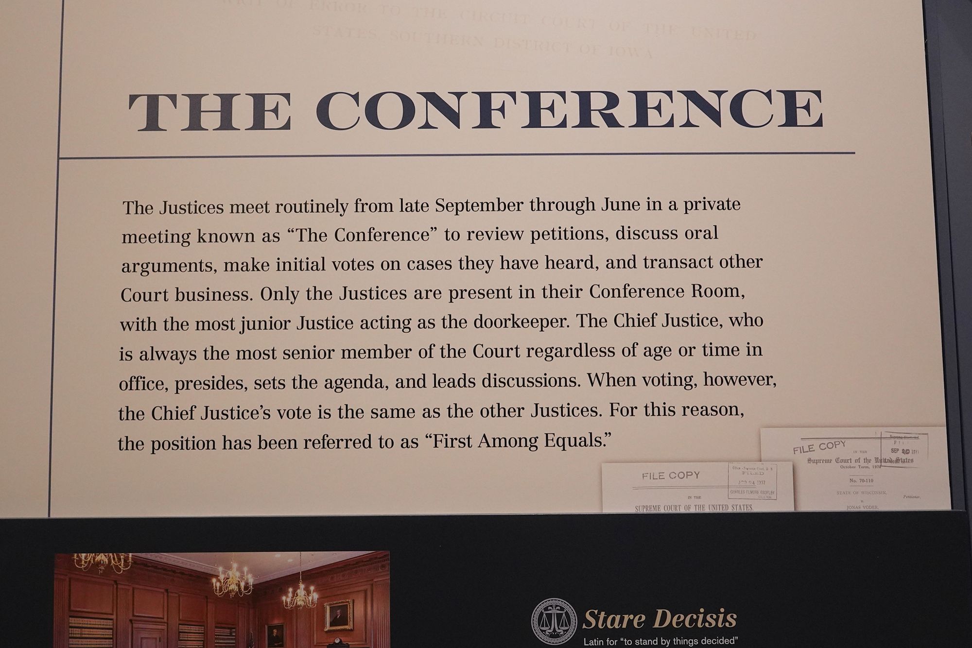 In the Supreme Court, the Conference is a private meeting where the justices discuss and decide cases. No one else is allowed to attend—no clerks, assistants, or reporters—ensuring complete confidentiality.