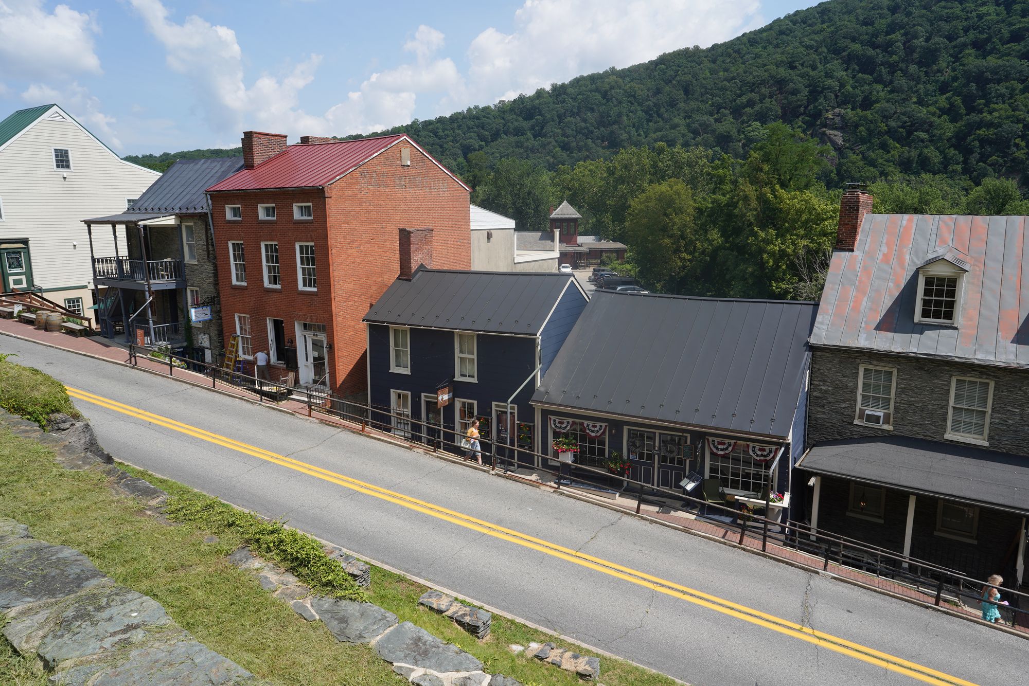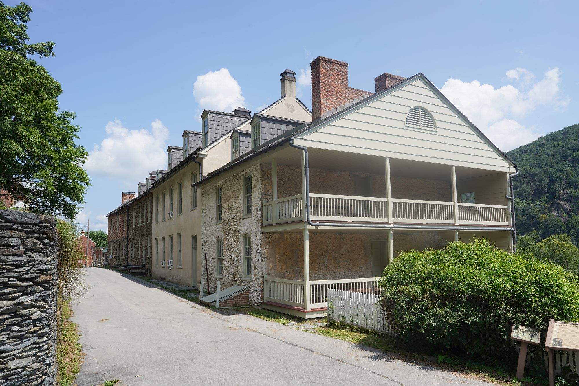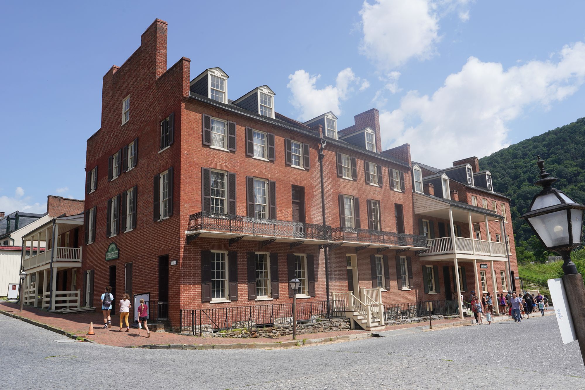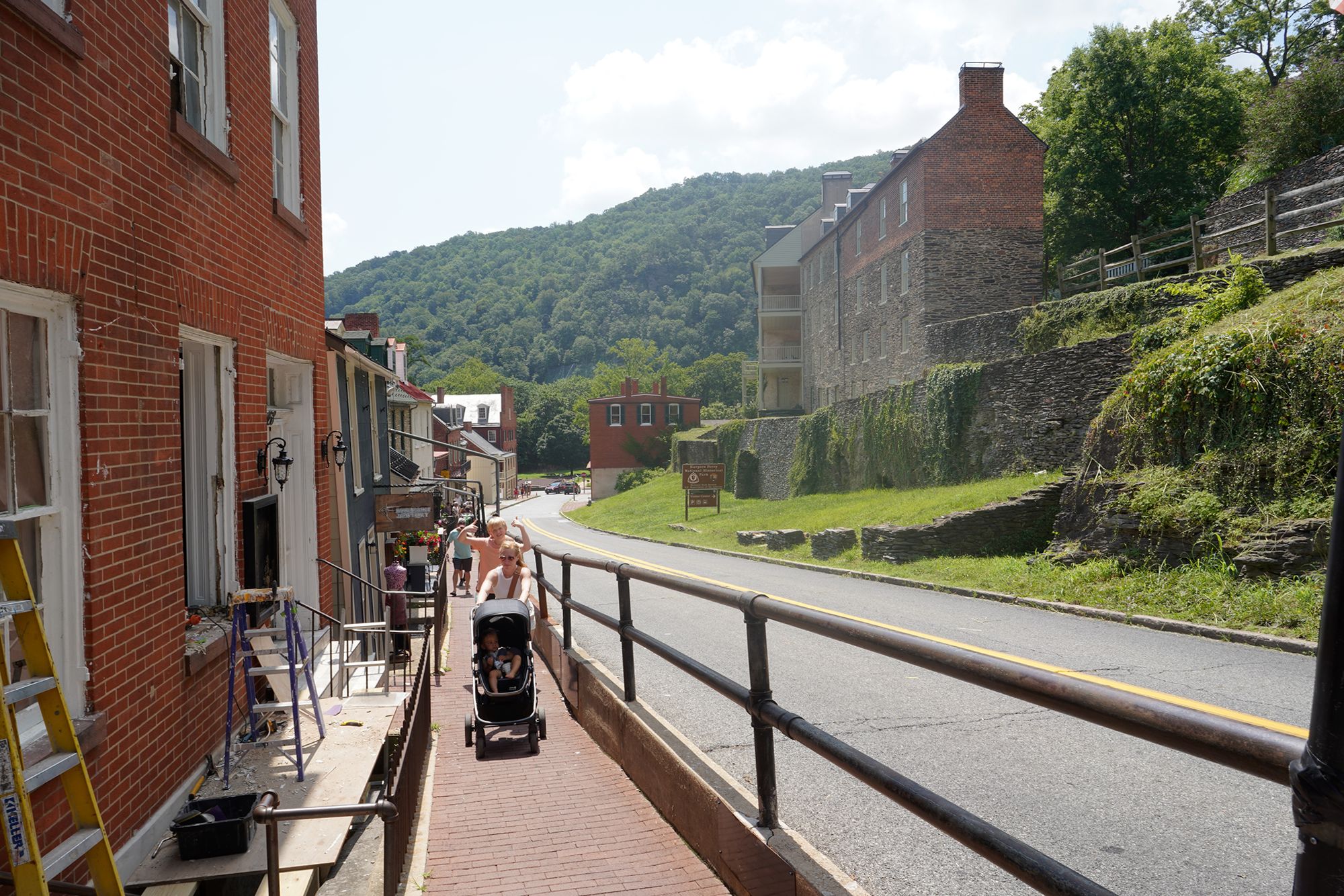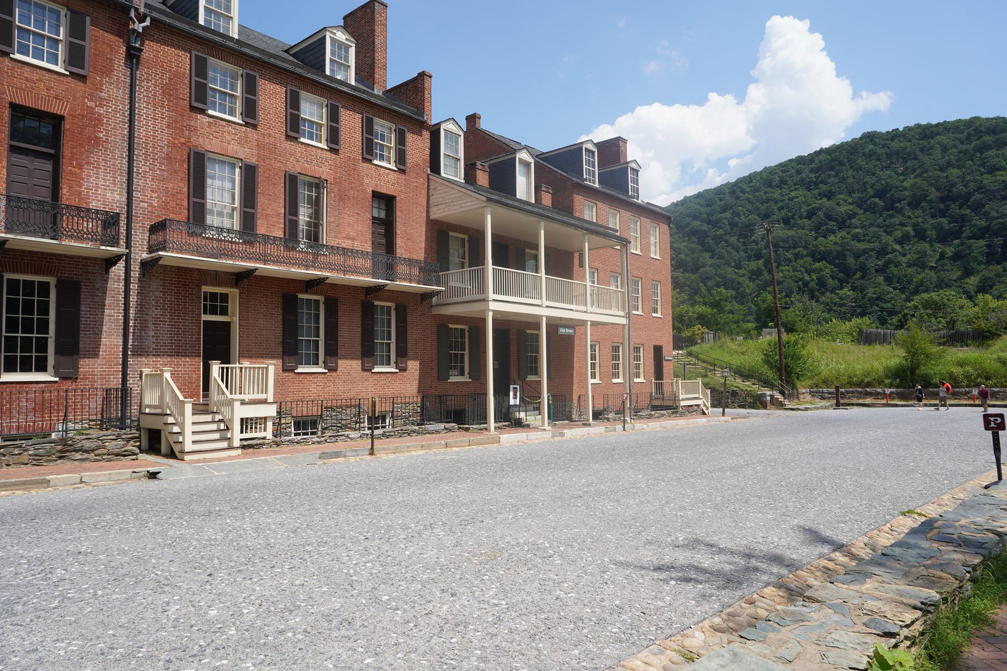 Harpers Ferry’s preserved historic town features 19th-century buildings, narrow streets, and exhibits related to John Brown’s raid, Civil War occupations, and early industry, set at the scenic confluence of two rivers and surrounded by steep, forested hills. There is no resident here. The houses are part of the preserved park.