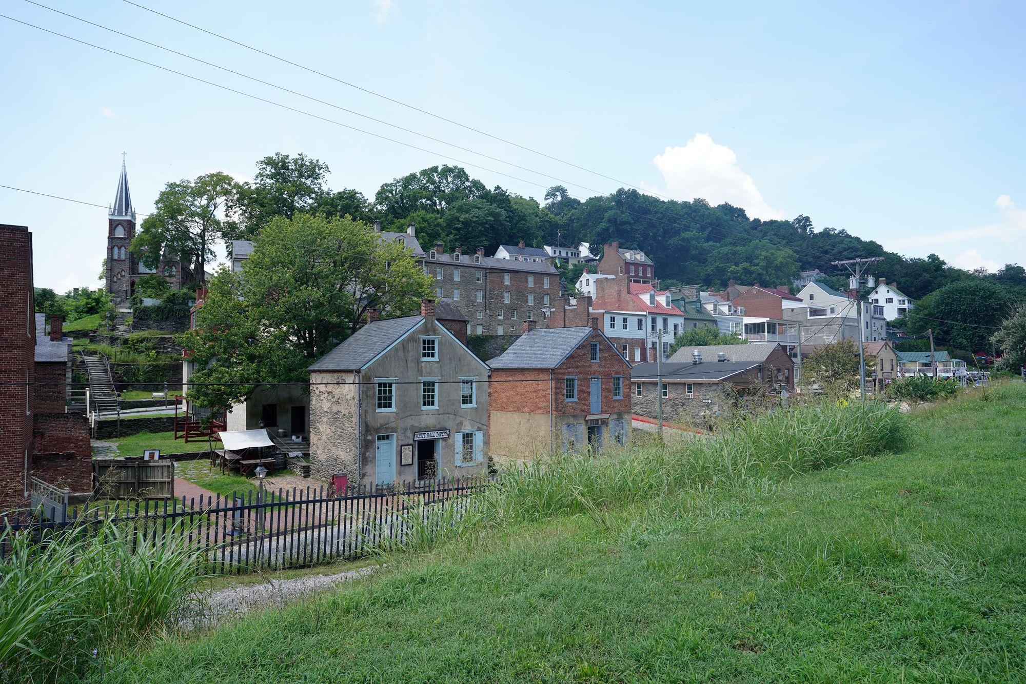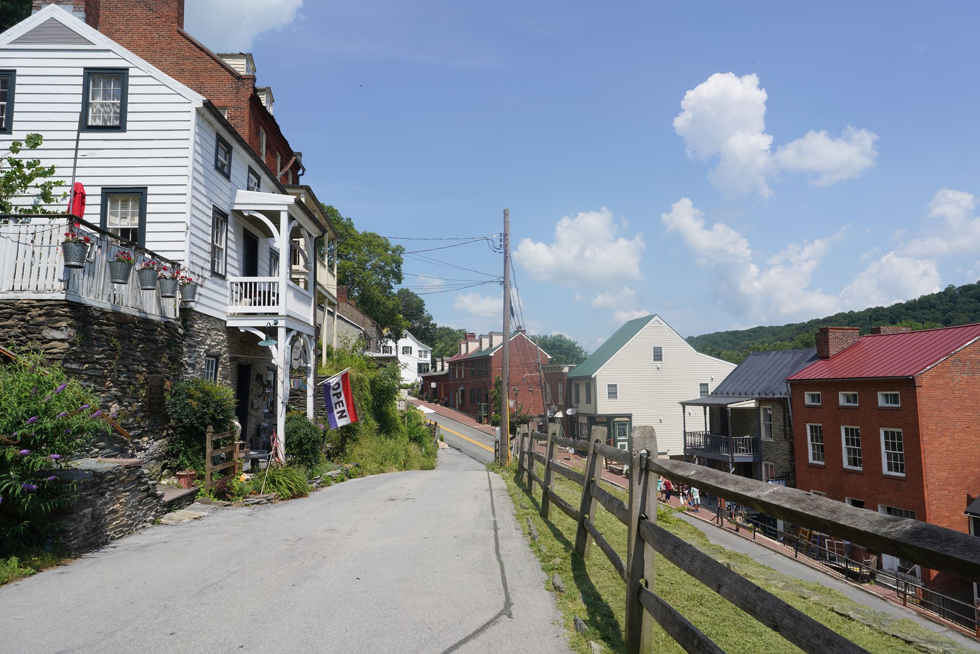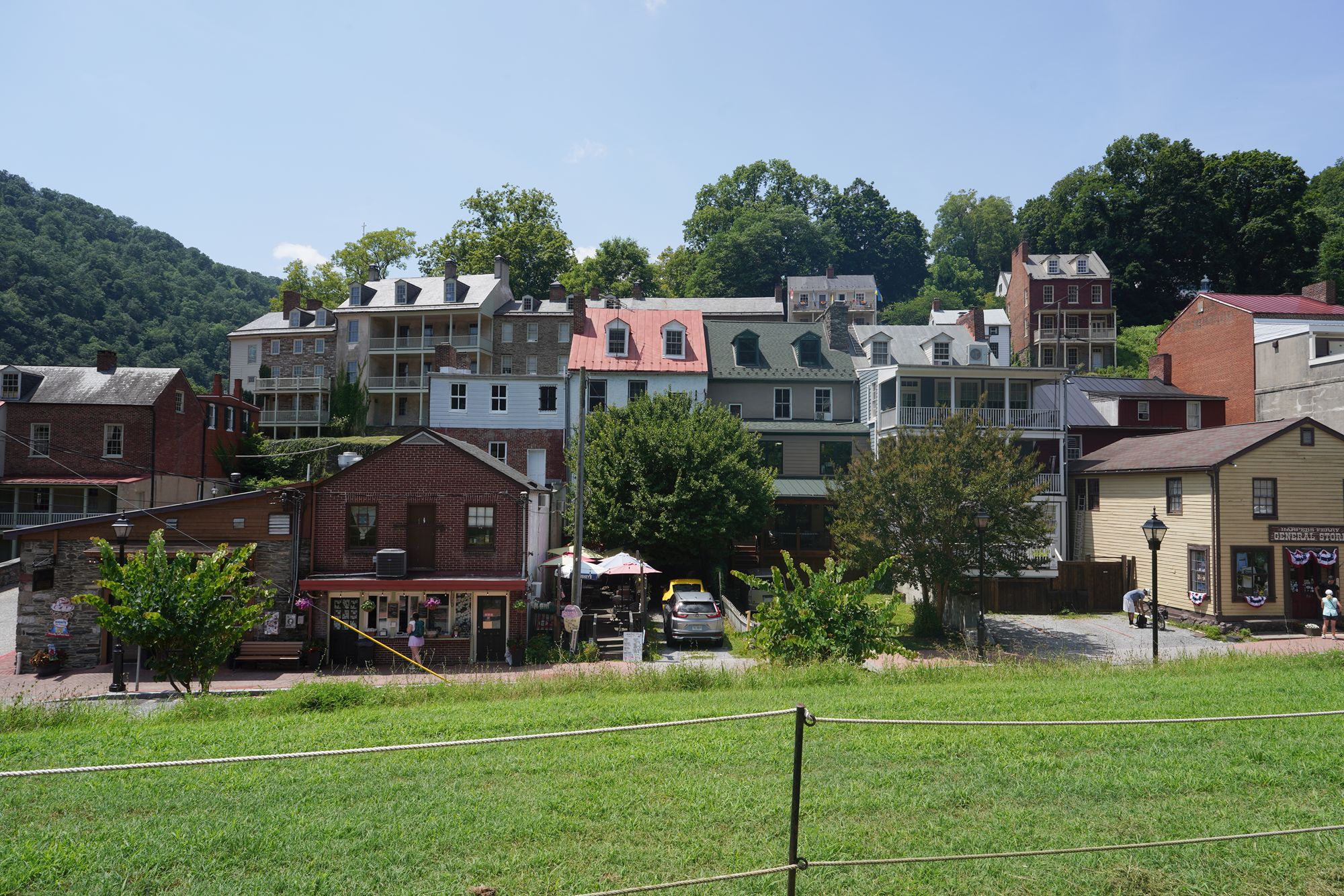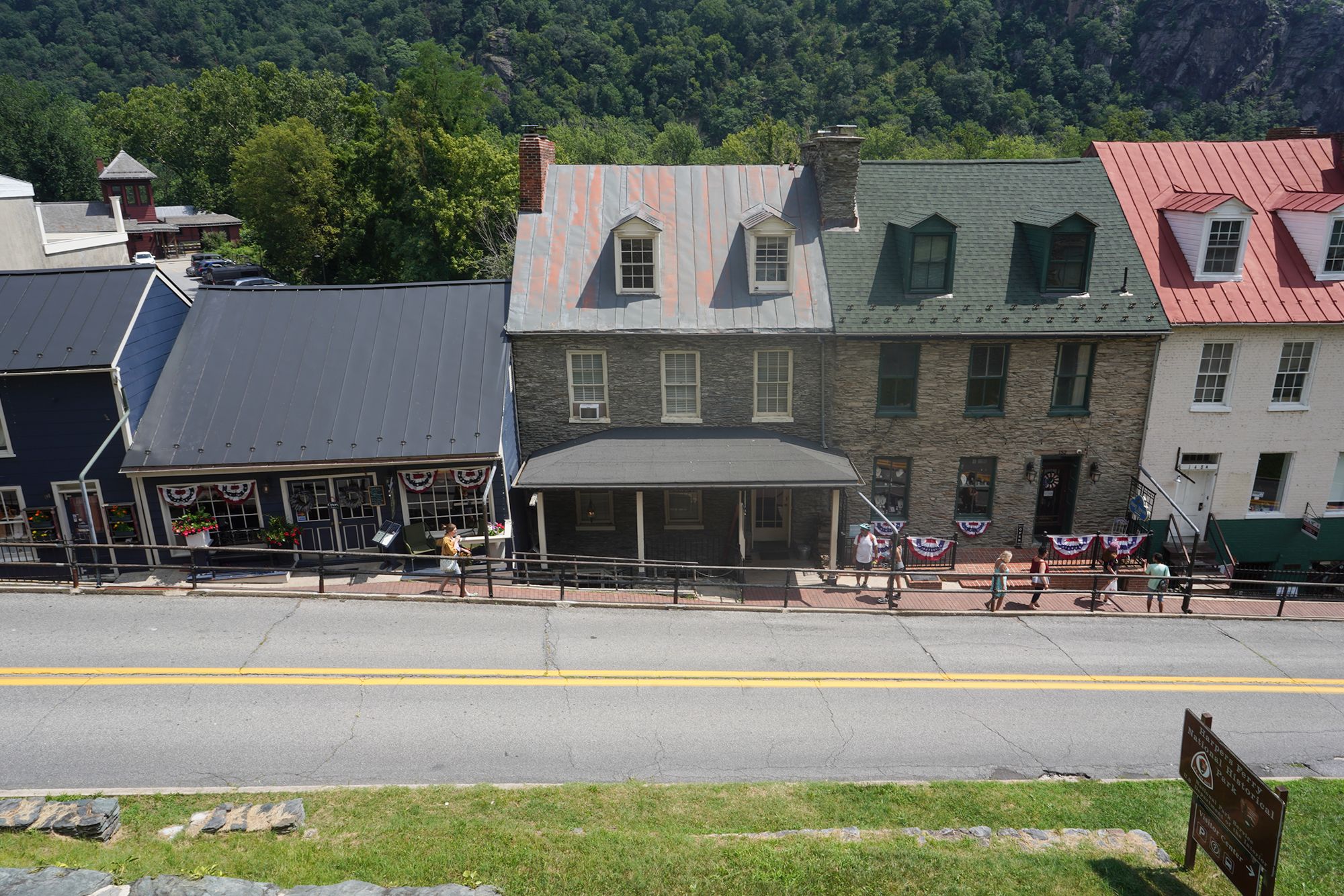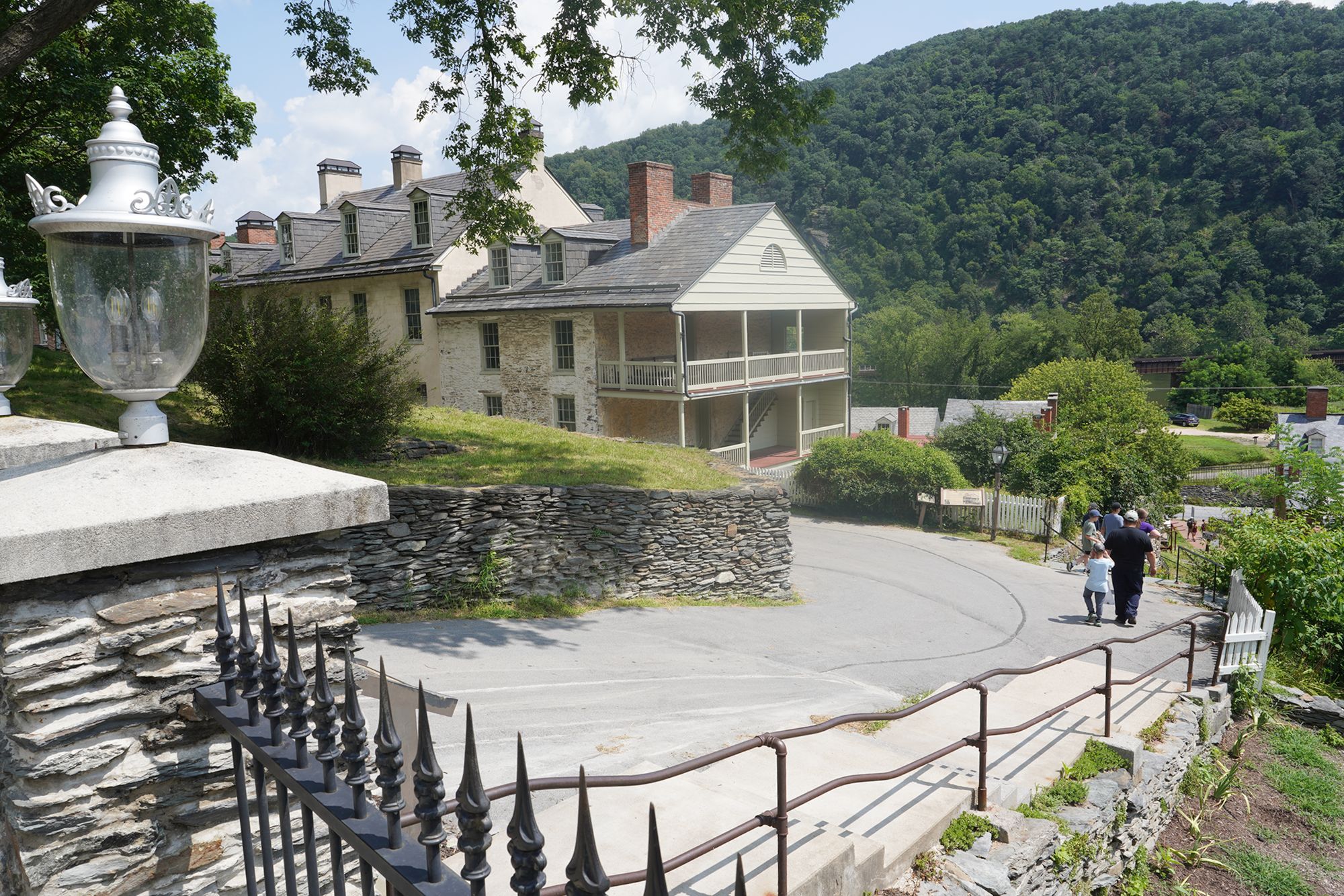 Harpers Ferry’s preserved historic town features 19th-century buildings, narrow streets, and exhibits related to John Brown’s raid, Civil War occupations, and early industry, set at the scenic confluence of two rivers and surrounded by steep, forested hills. There is no resident here. The houses are part of the preserved park.