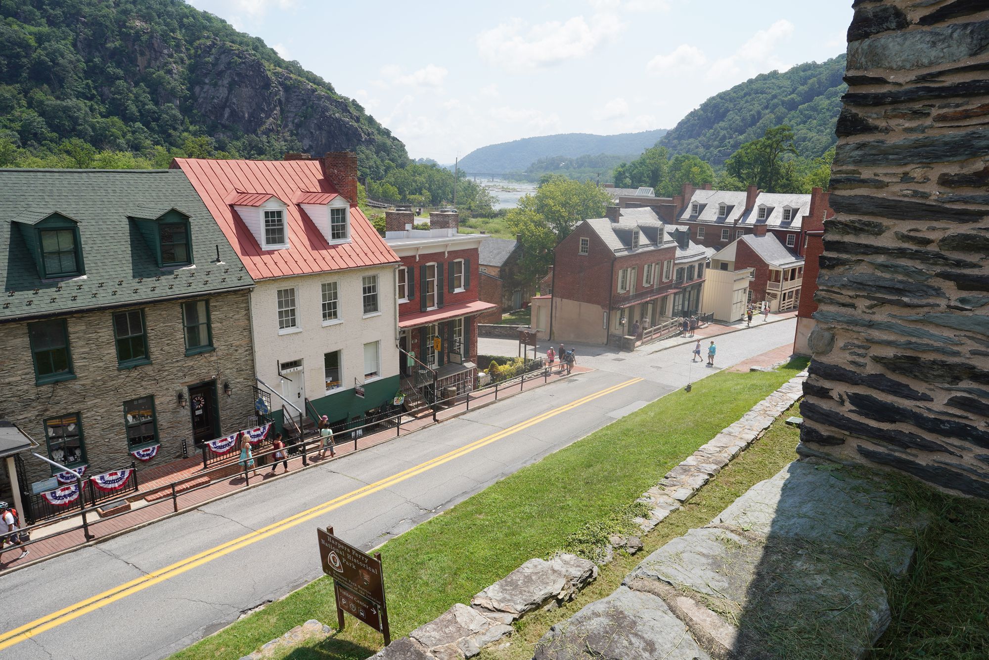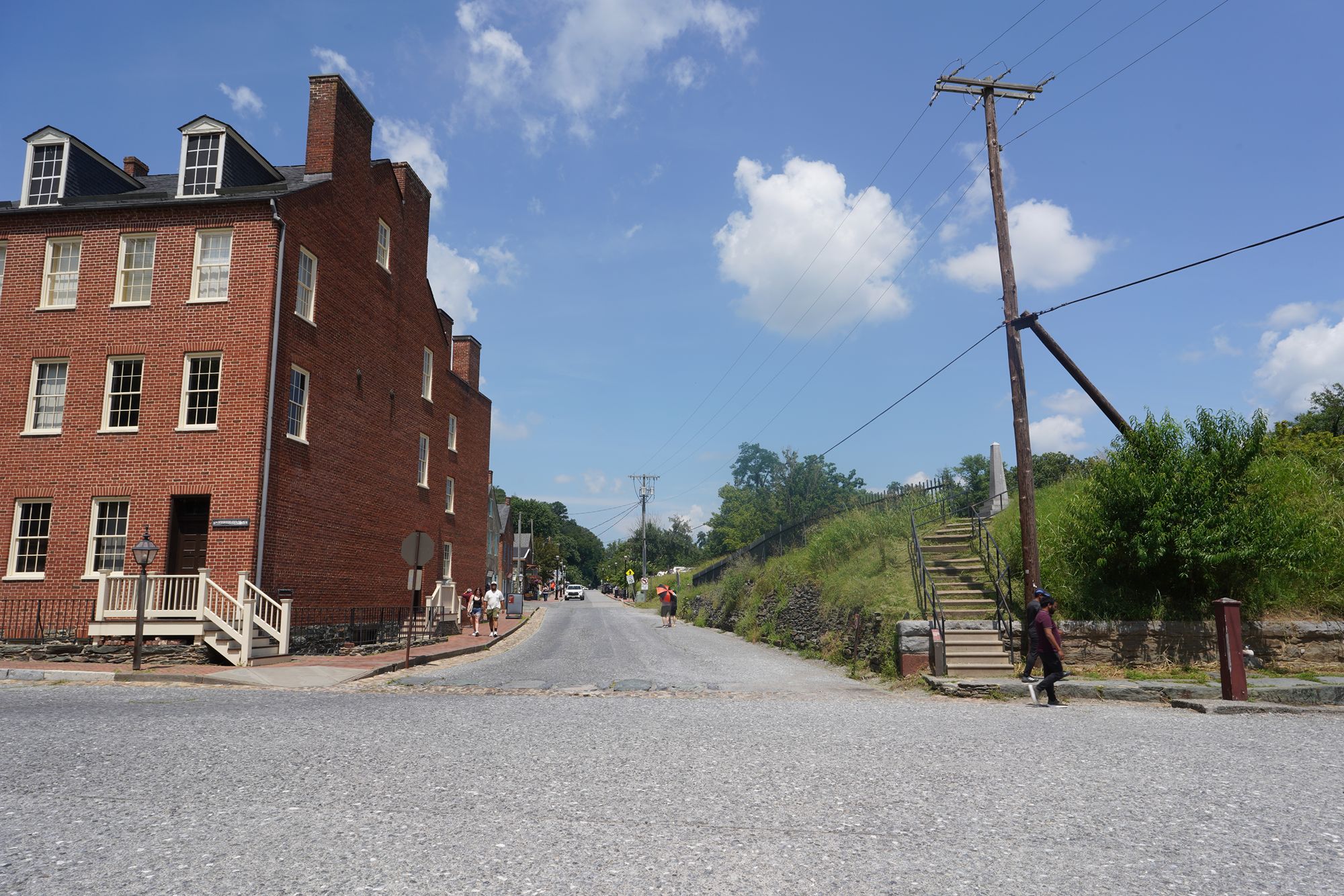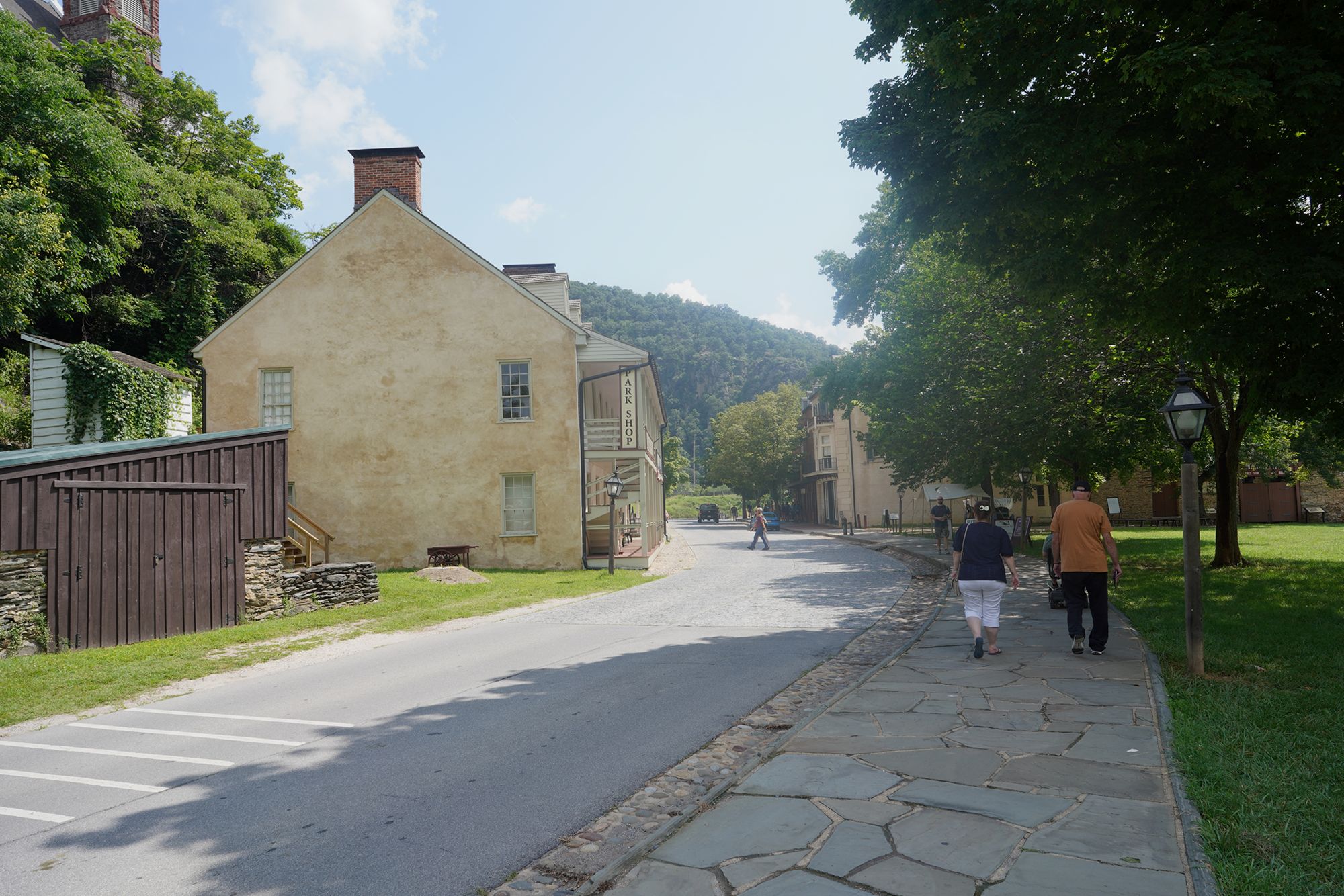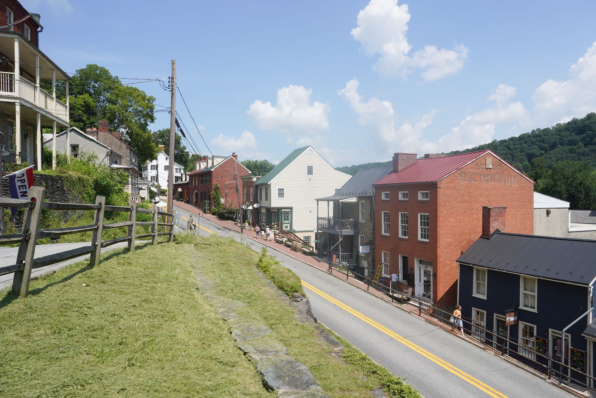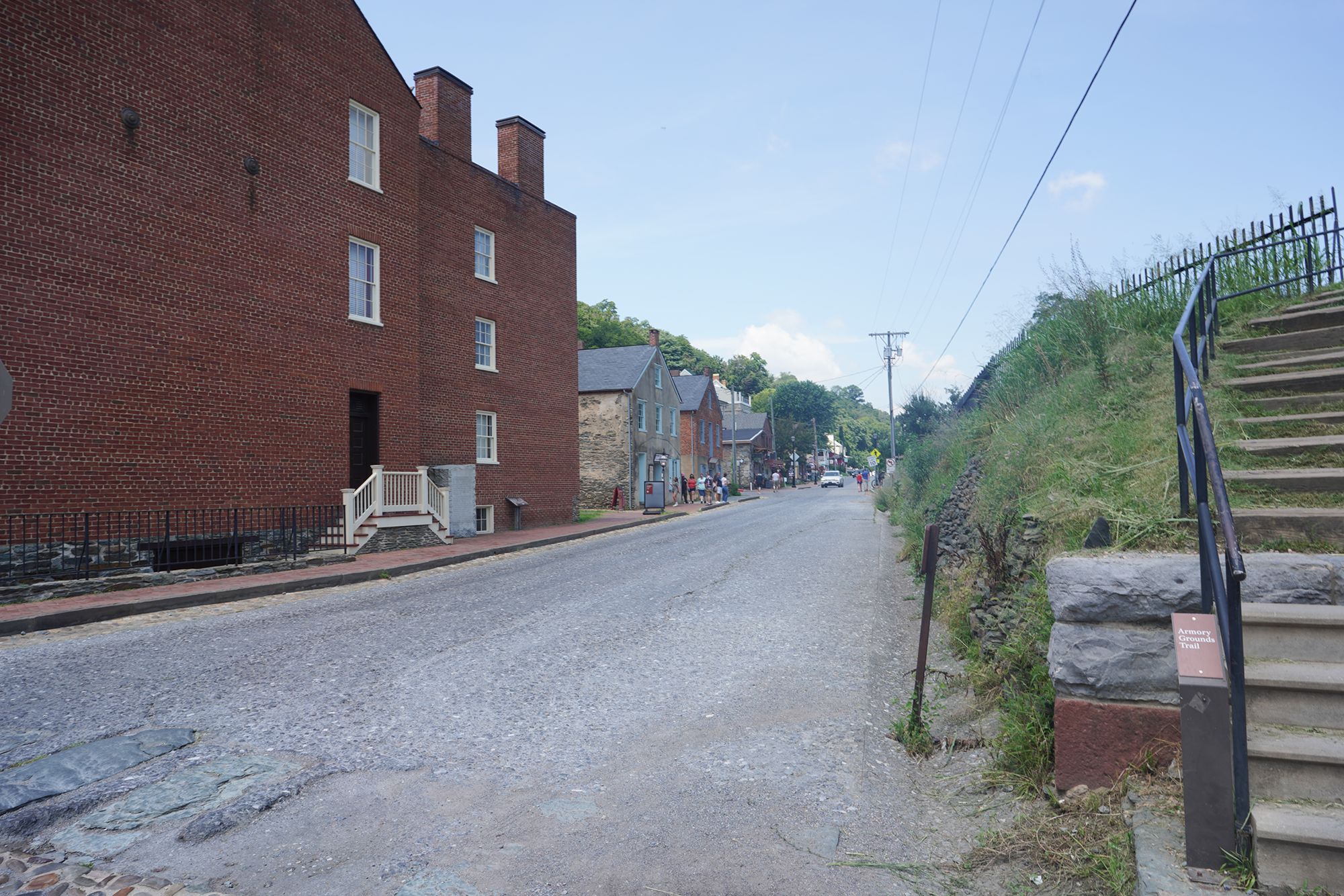 Harpers Ferry’s preserved historic town features 19th-century buildings, narrow streets, and exhibits related to John Brown’s raid, Civil War occupations, and early industry, set at the scenic confluence of two rivers and surrounded by steep, forested hills. There is no resident here. The houses are part of the preserved park.
