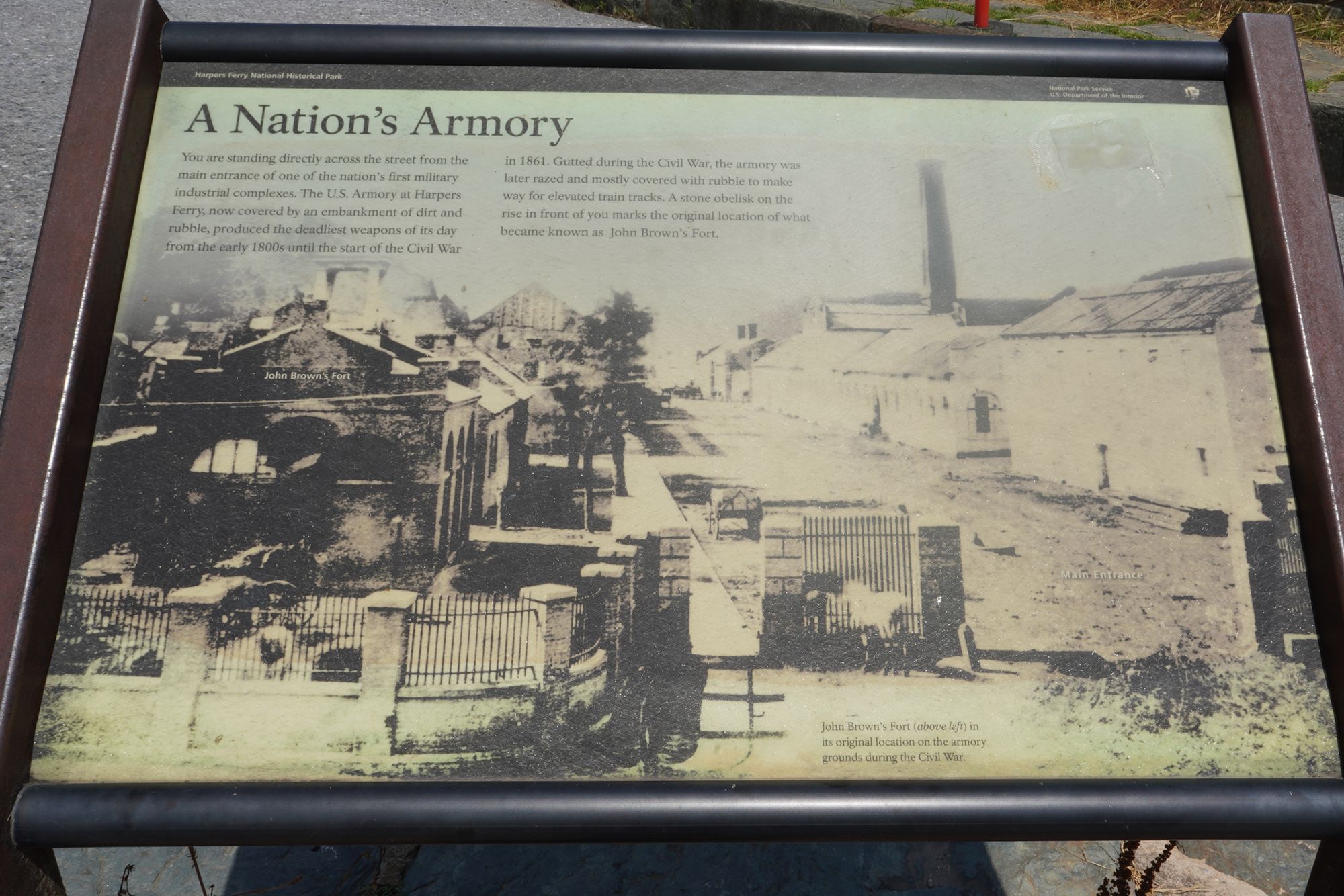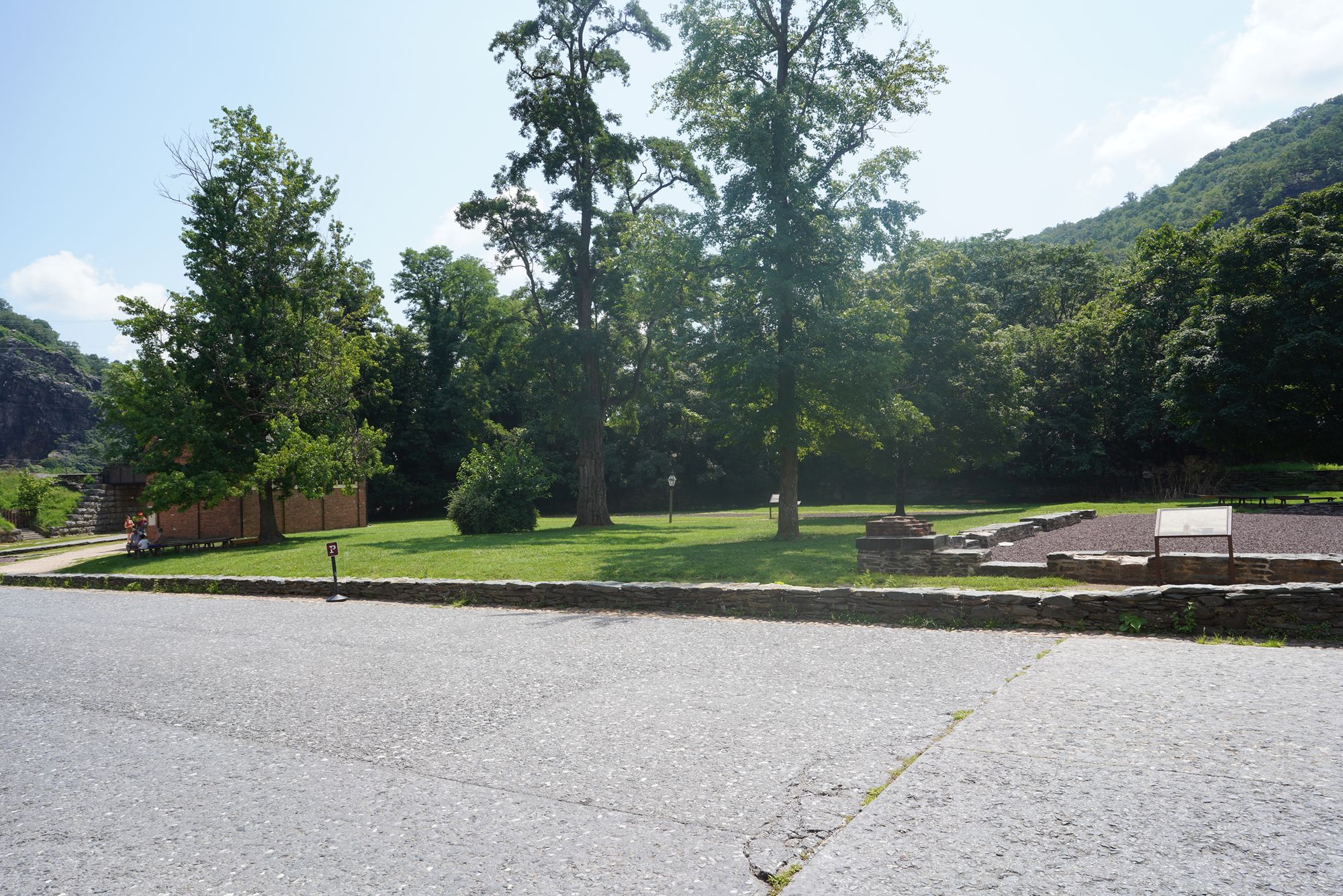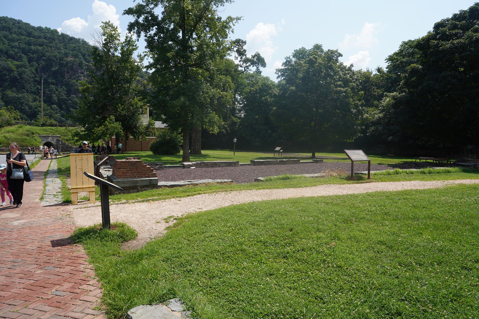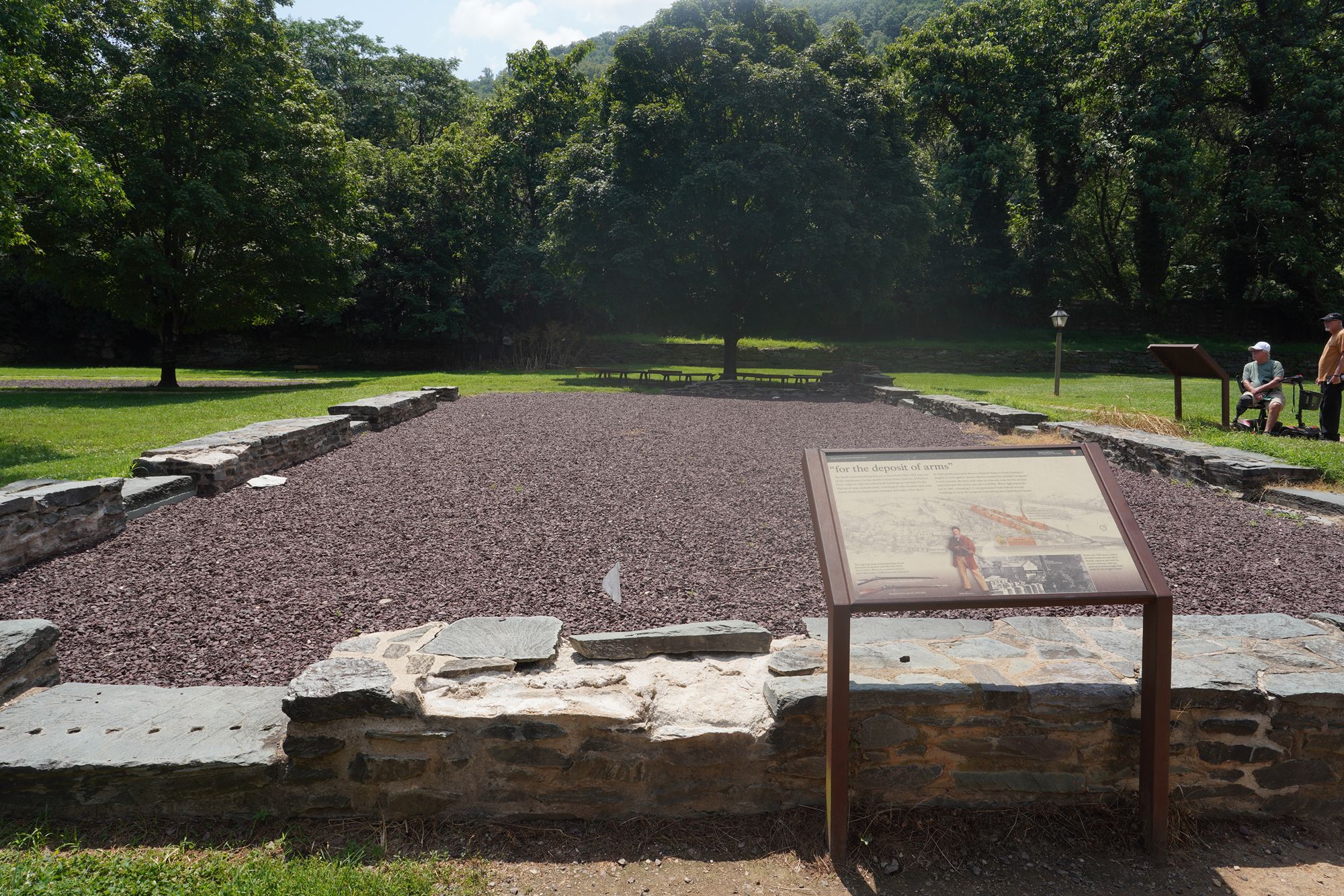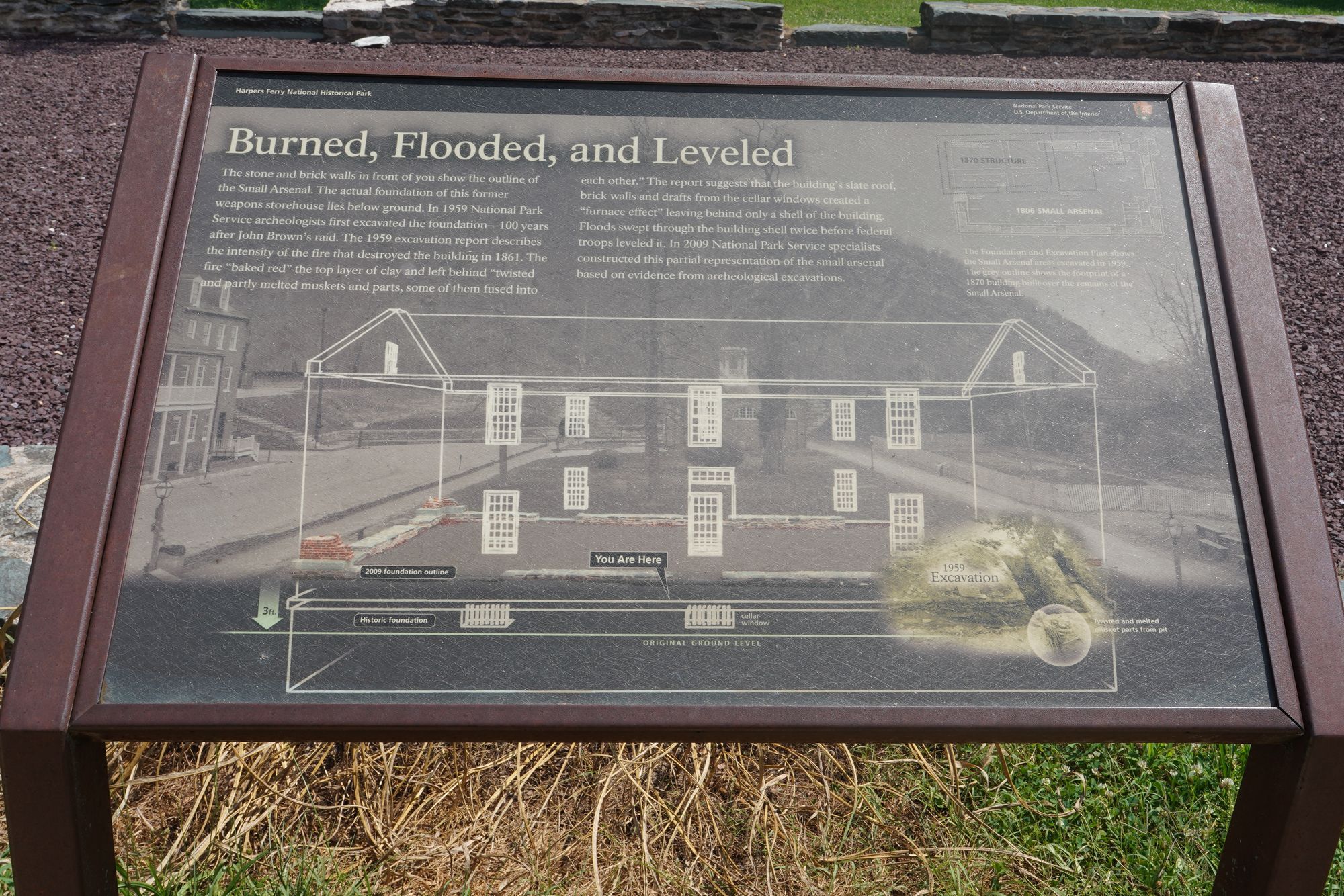 One of the Armory buildings, which was destroyed during the Civil War and by later floods, leaving only foundations and interpretive signage.