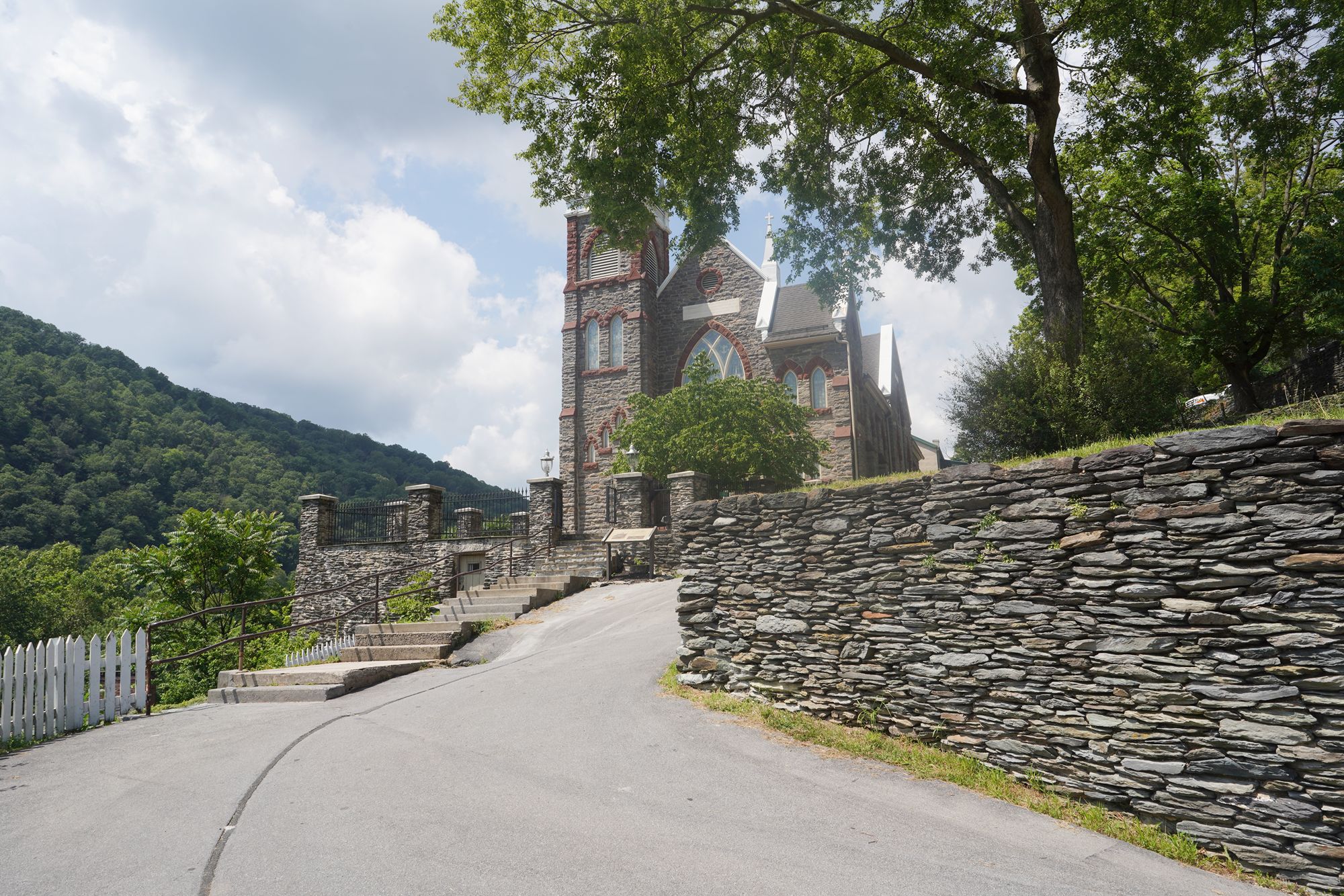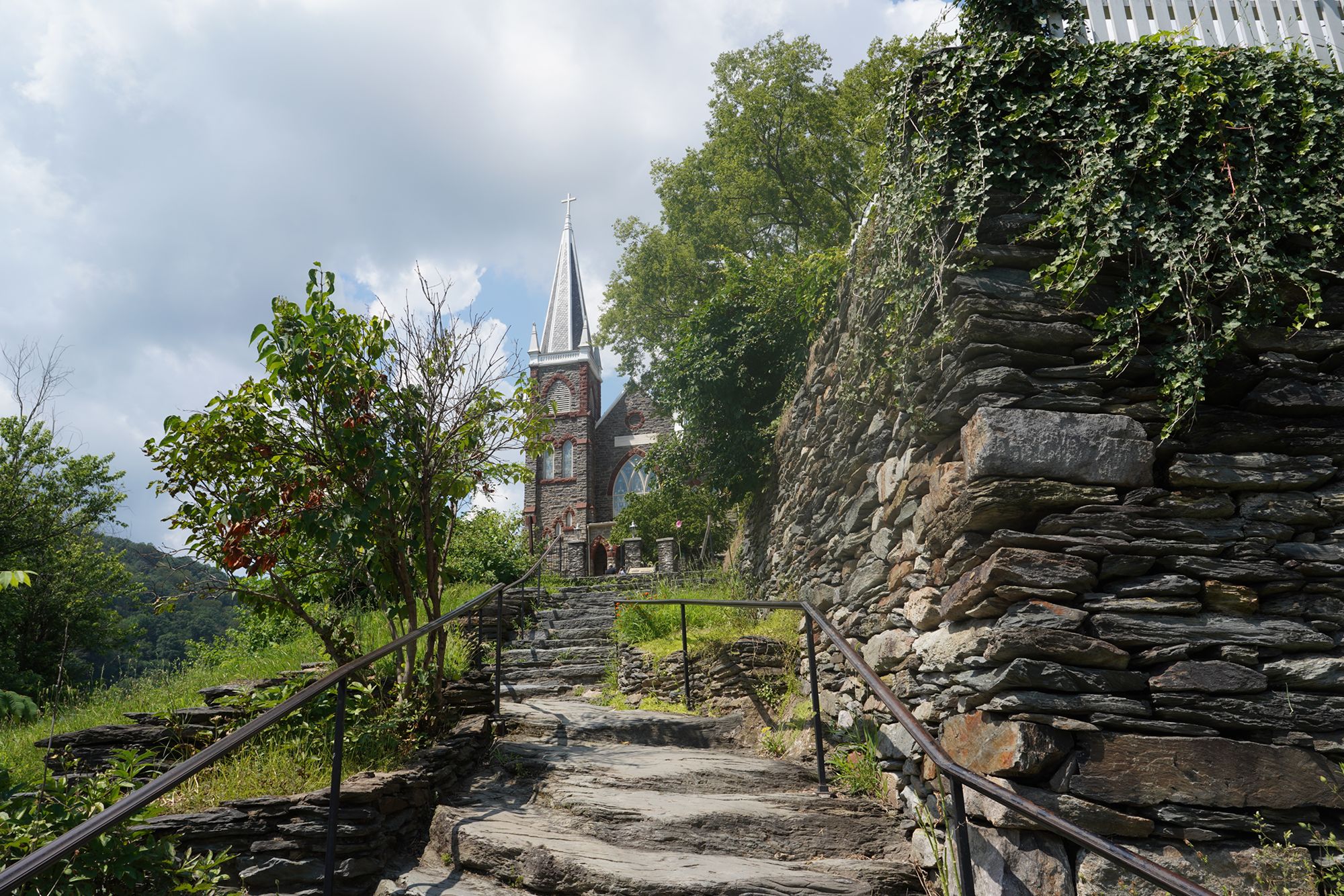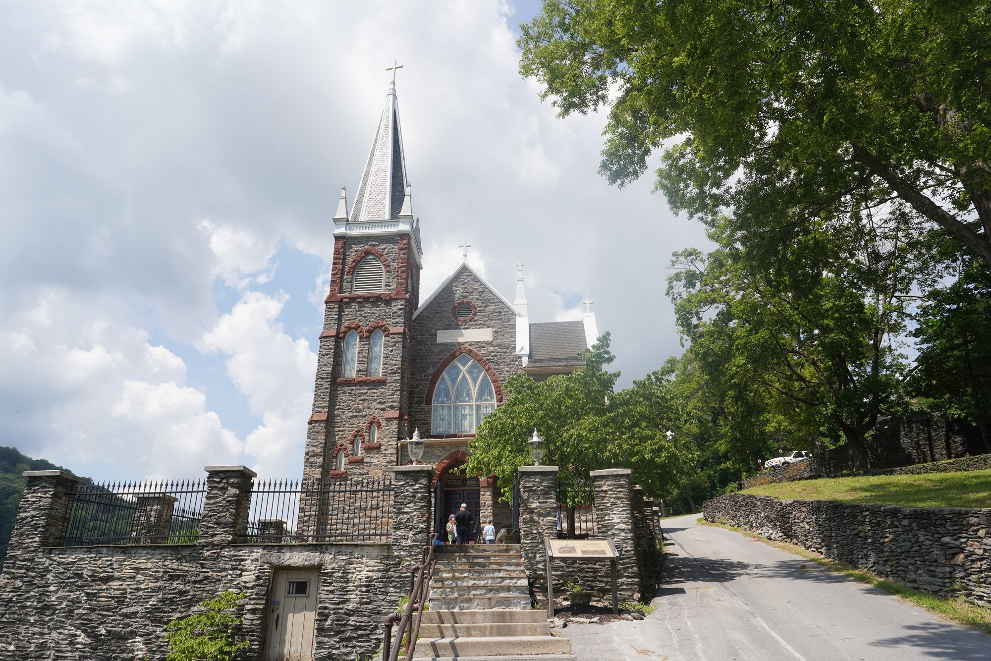 St. Peter’s Catholic Church, built for armory workers in 1833, stands on the hill above Harpers Ferry and survived the Civil War, offering a prominent Gothic Revival landmark with scenic views.