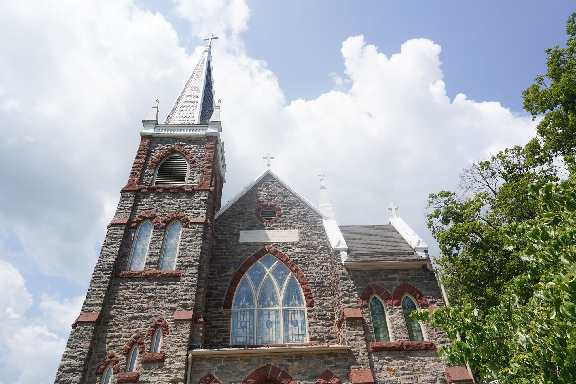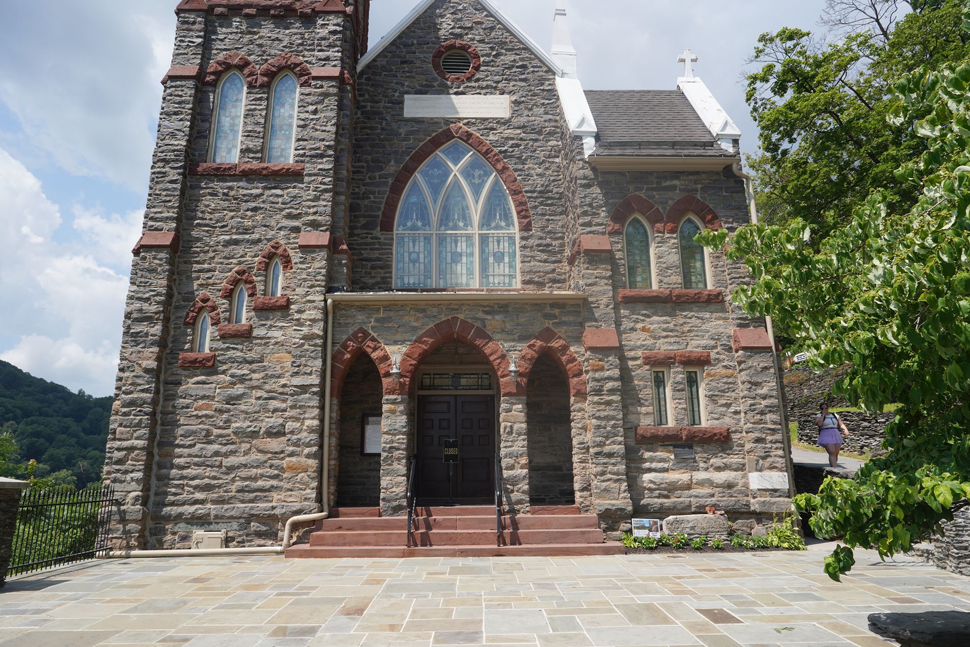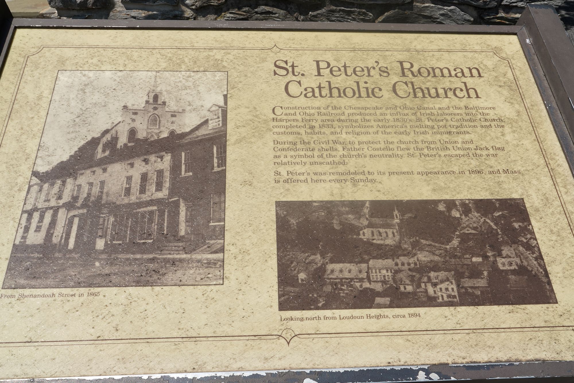 St. Peter’s Catholic Church, built for armory workers in 1833, stands on the hill above Harpers Ferry and survived the Civil War, offering a prominent Gothic Revival landmark with scenic views.