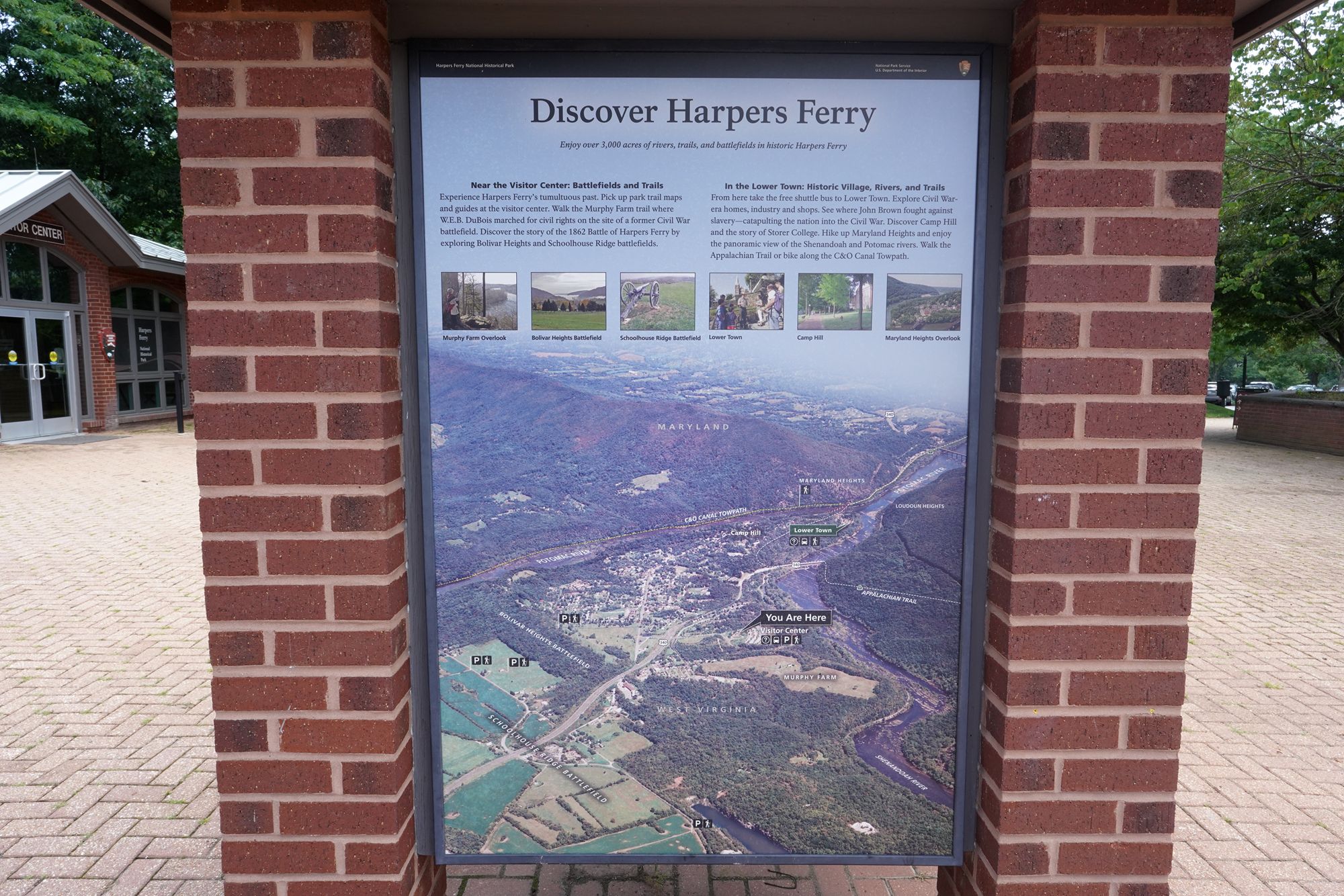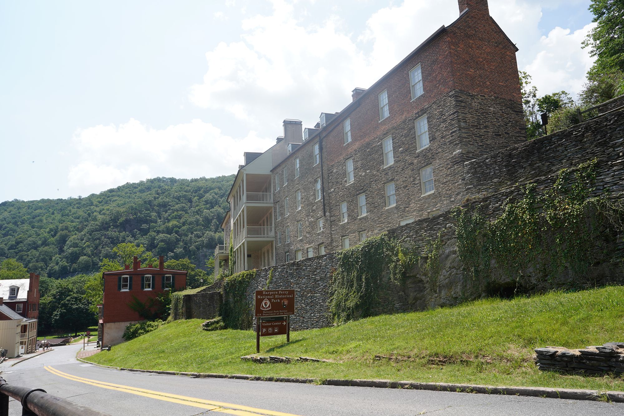 Harpers Ferry is a historic town at the junction of the Potomac and Shenandoah Rivers, known for John Brown’s 1859 raid on the federal armory, its strategic importance during the Civil War, and its preserved 19th-century landscape within Harpers Ferry National Historical Park. The visitor center of the park.