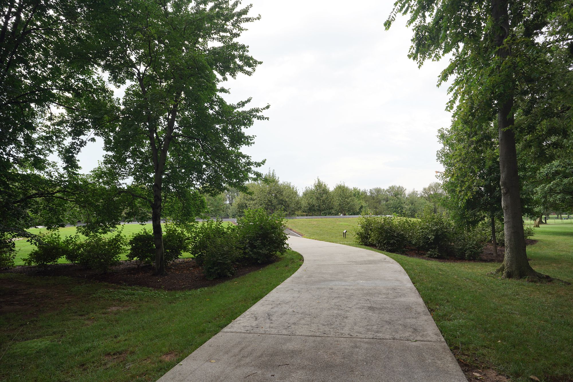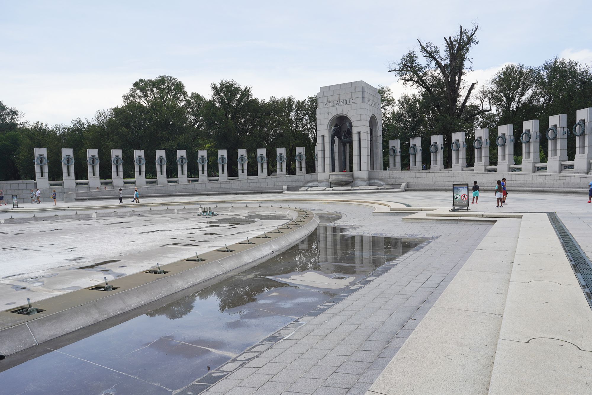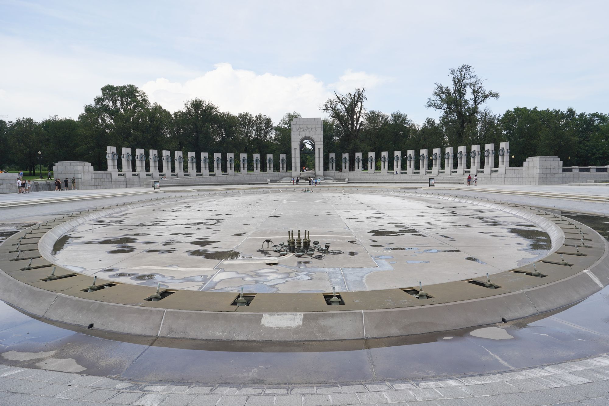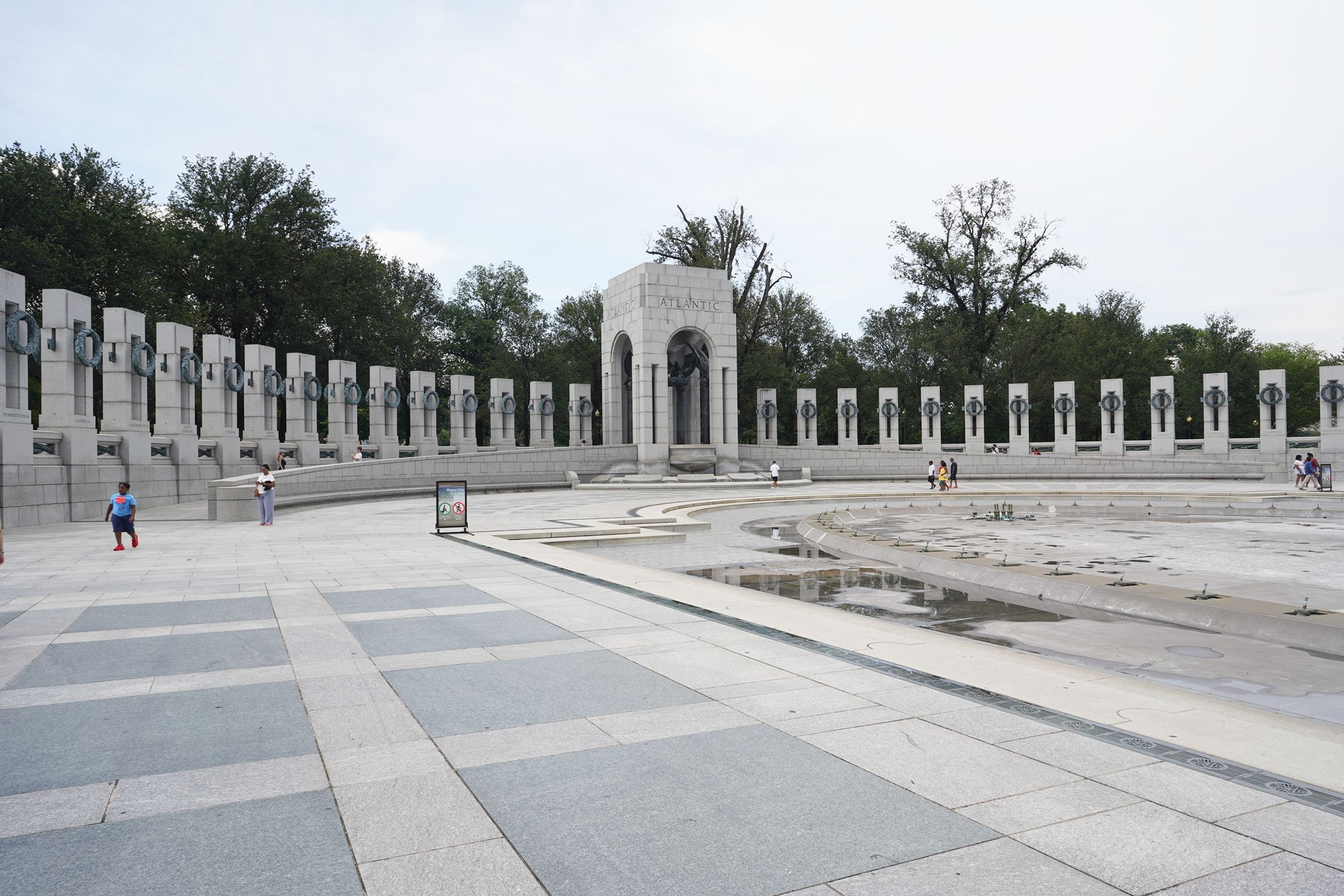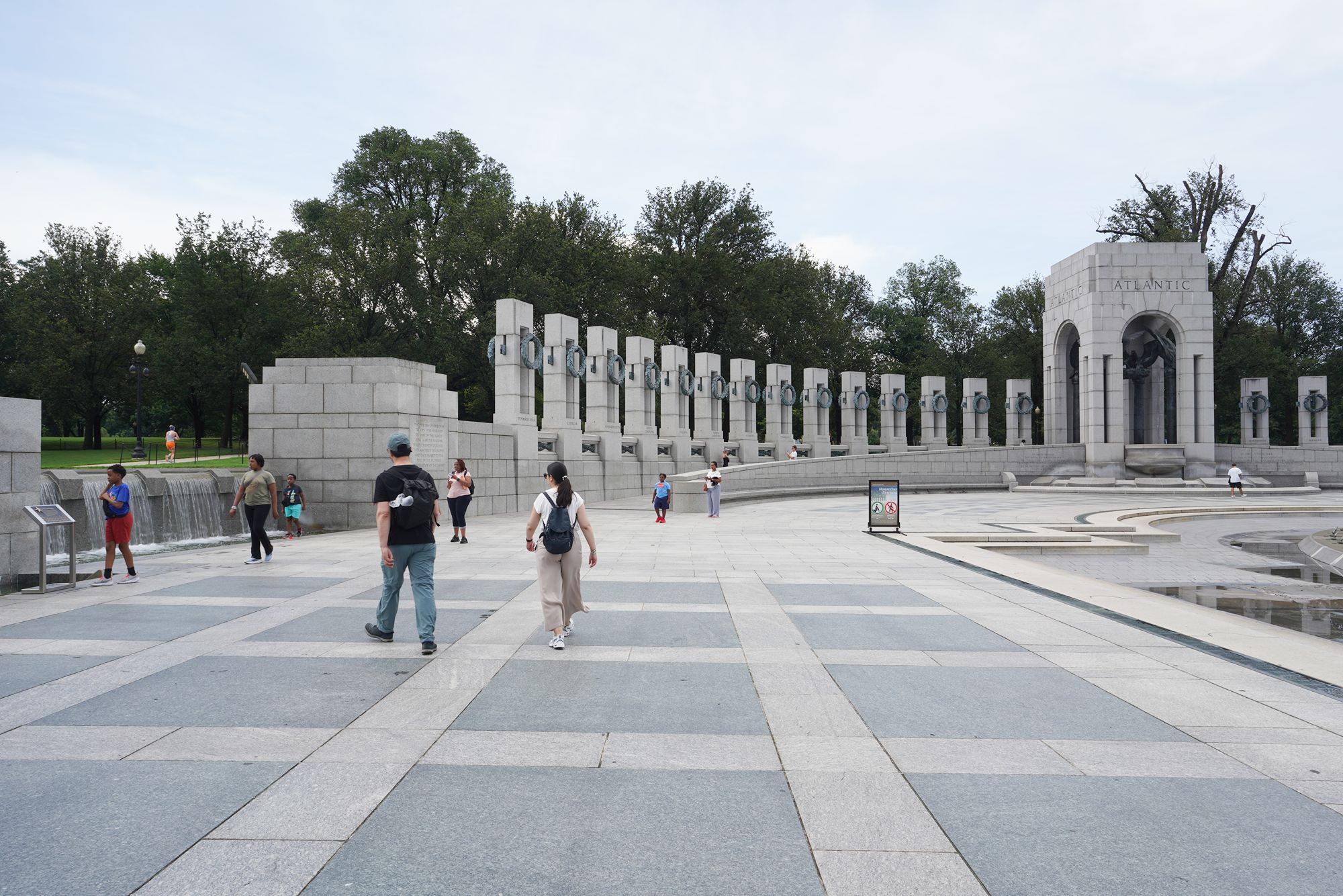 The memorial’s design features a large oval plaza with a central fountain, surrounded by 56 granite pillars representing the U.S. states and territories of the time, symbolizing national unity. Two tall arches, labeled “Atlantic” and “Pacific,” commemorate the major theaters of the war.