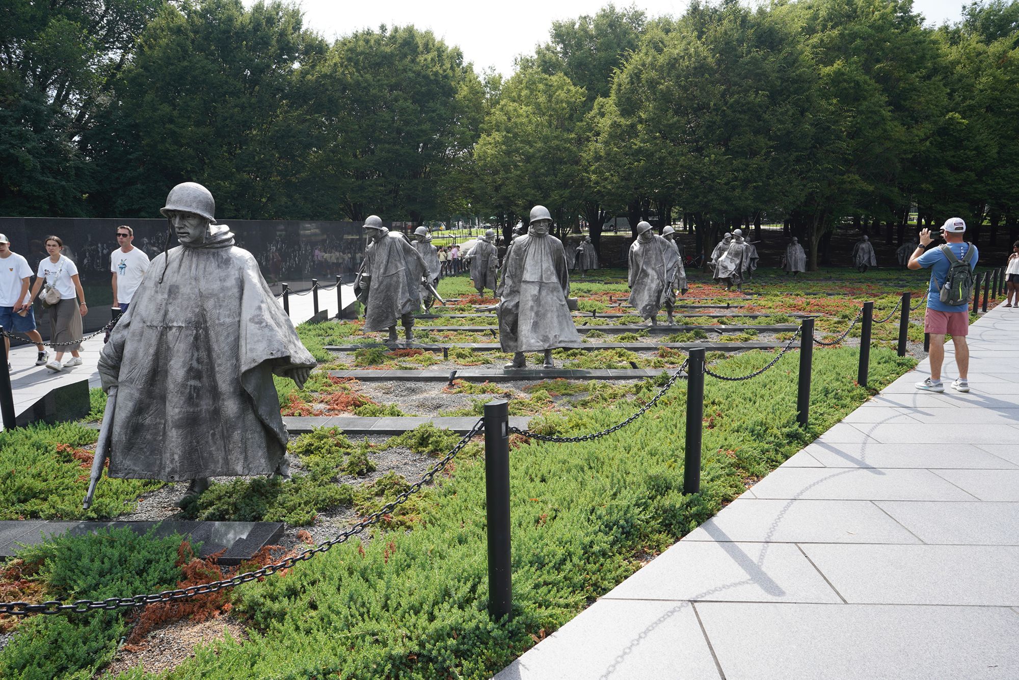 The memorial’s centerpiece features 19 stainless steel statues of soldiers—representing the Army, Navy, Air Force, and Marines—walking through low juniper bushes and granite strips that suggest the rugged terrain of Korea. Their life-size figures, dressed in ponchos and helmets, appear to move forward together, symbolizing unity and determination.