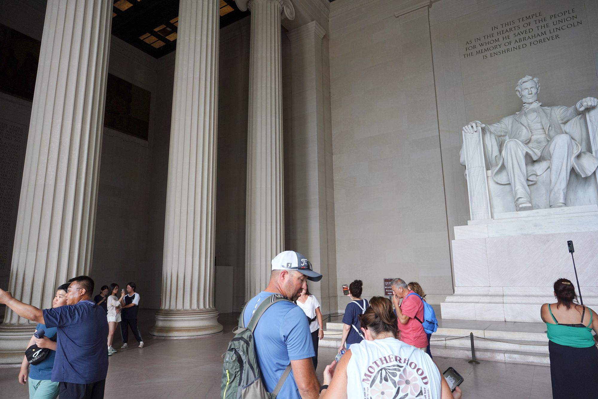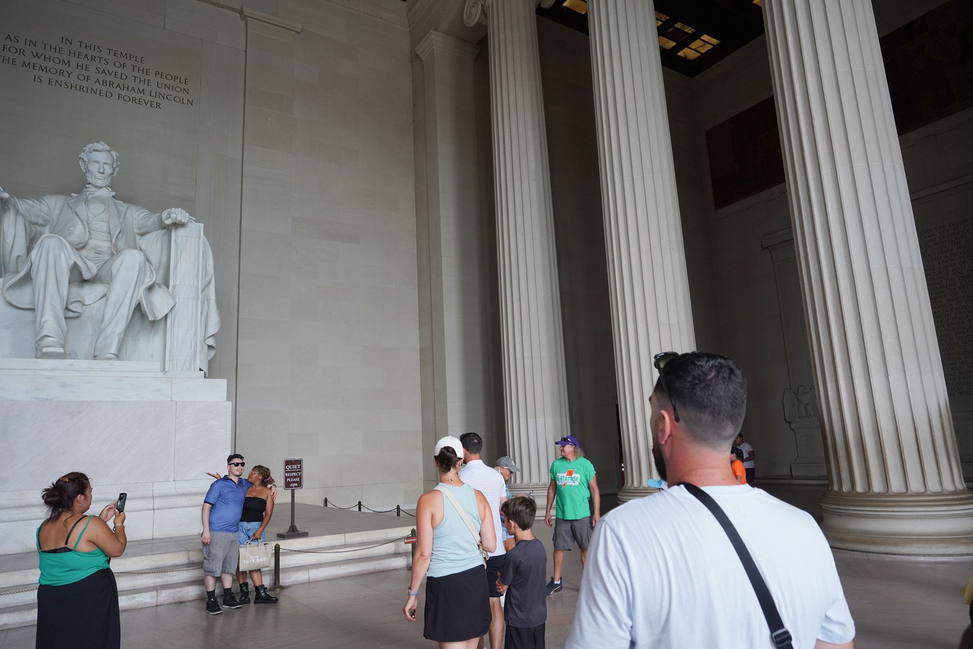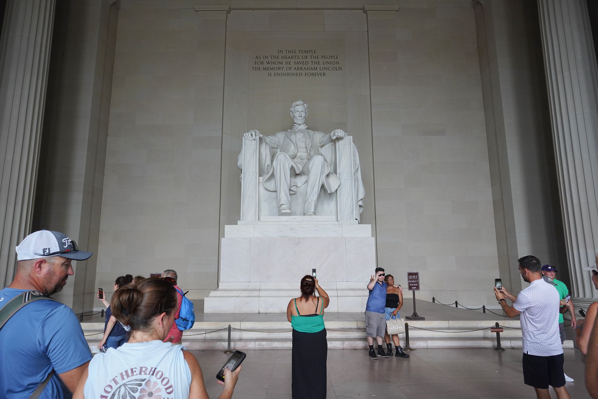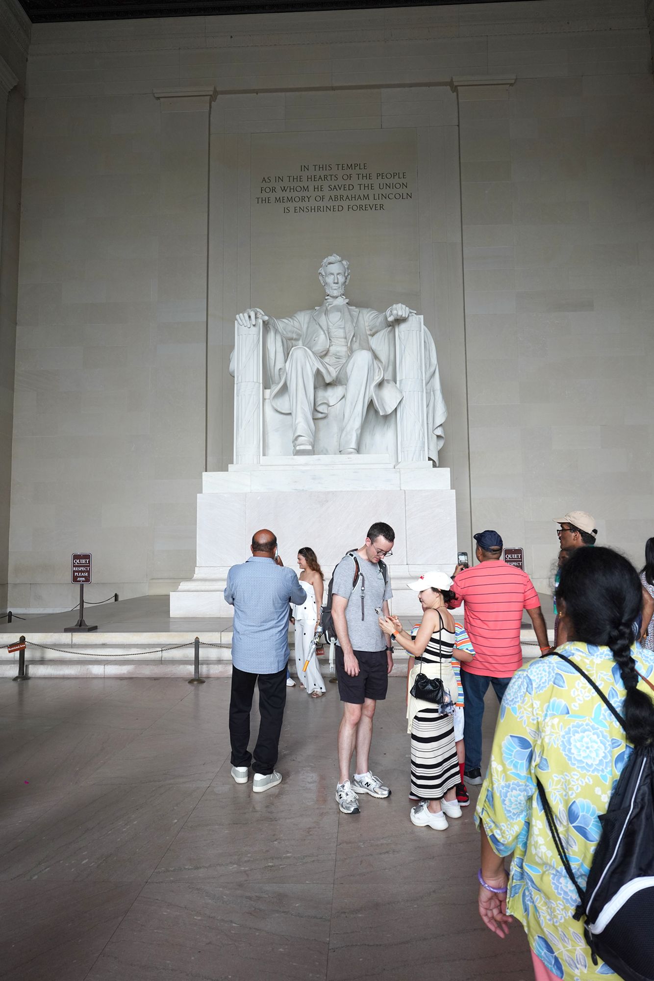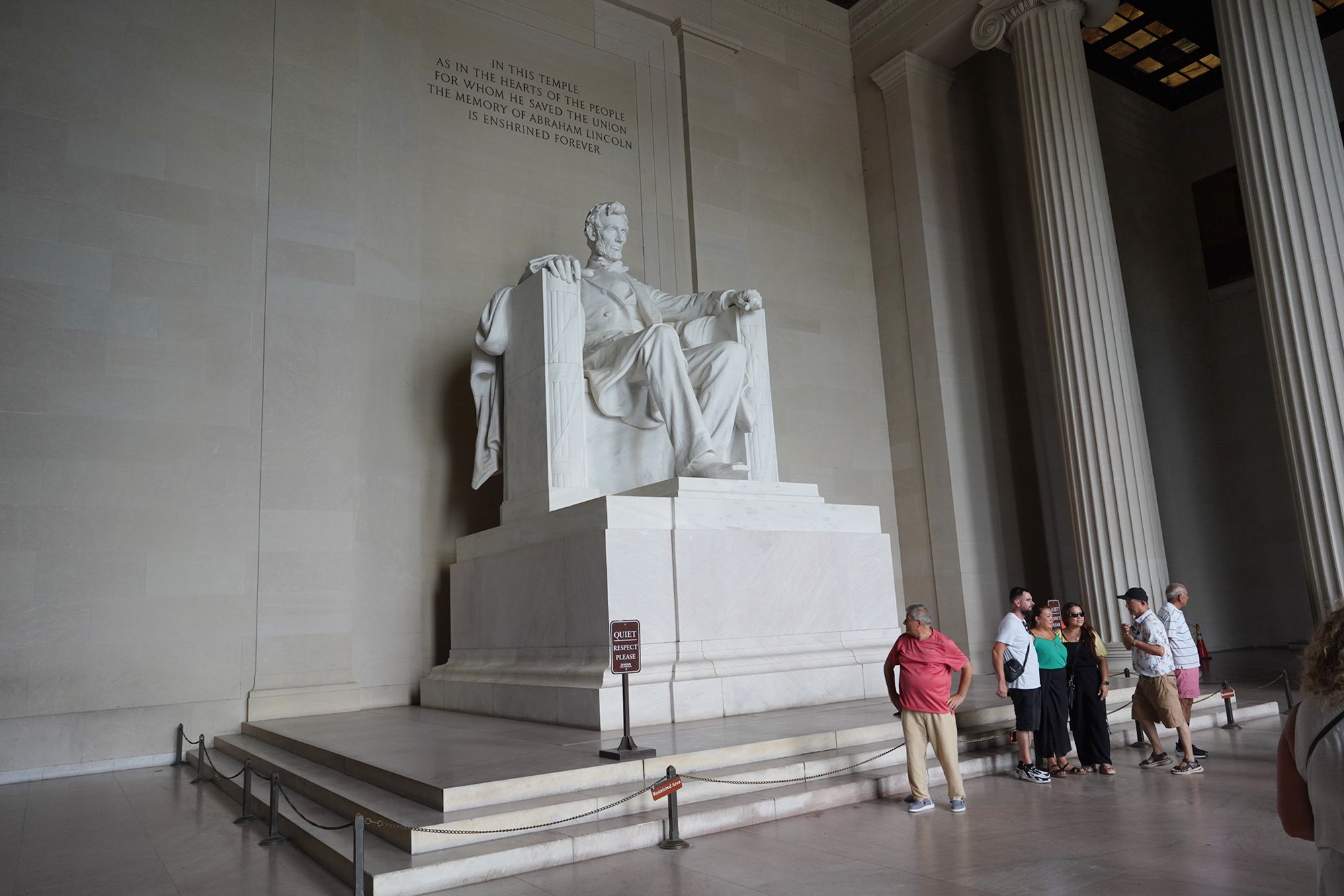 Inside sits the monumental 19-foot marble statue of Lincoln, sculpted by Daniel Chester French, depicting him seated in thought and strength, symbolizing wisdom and resolve.