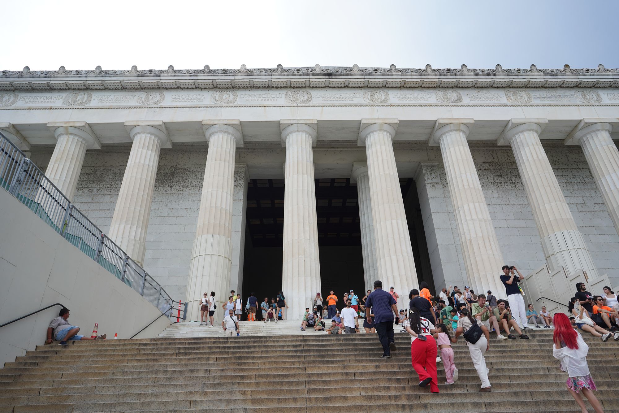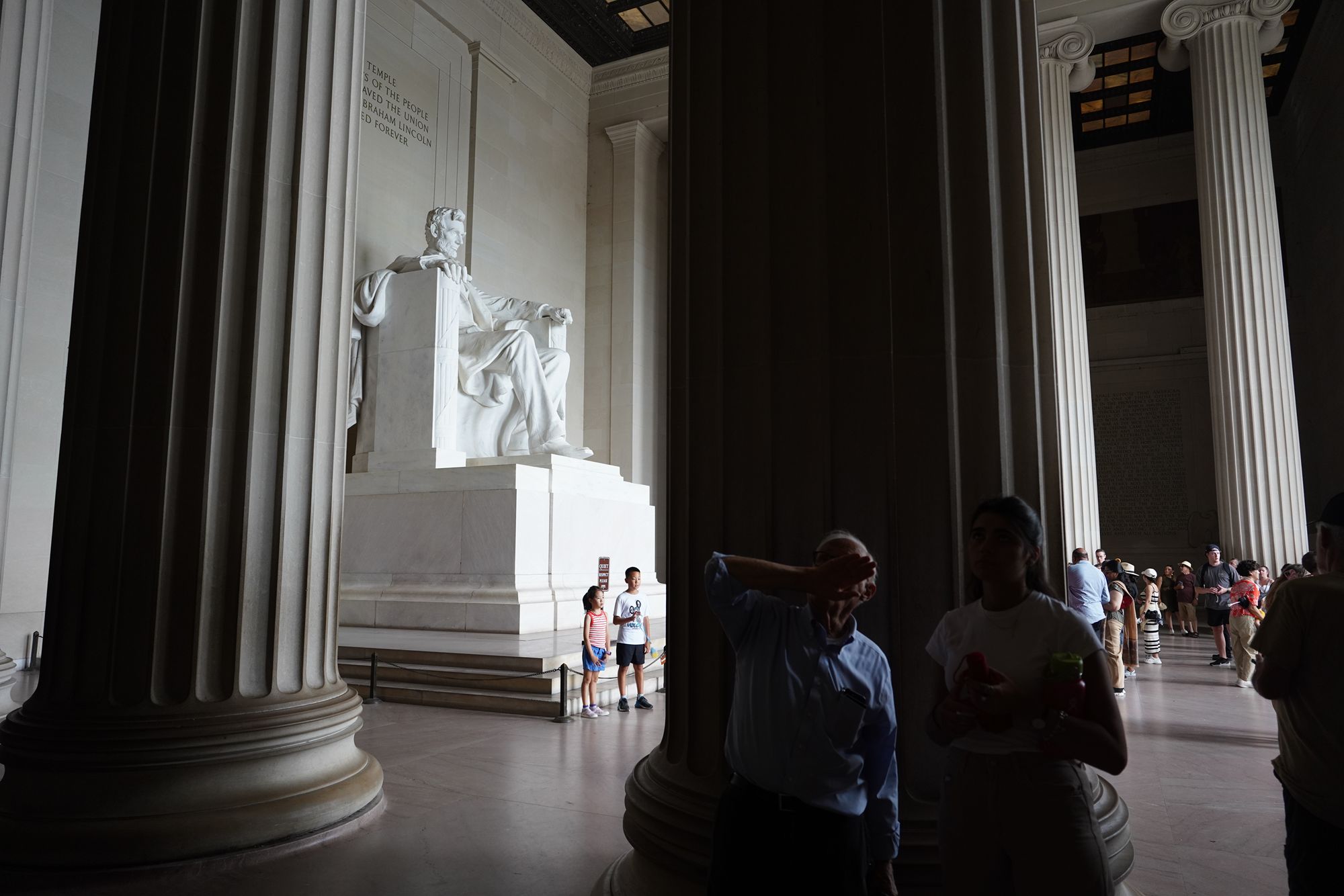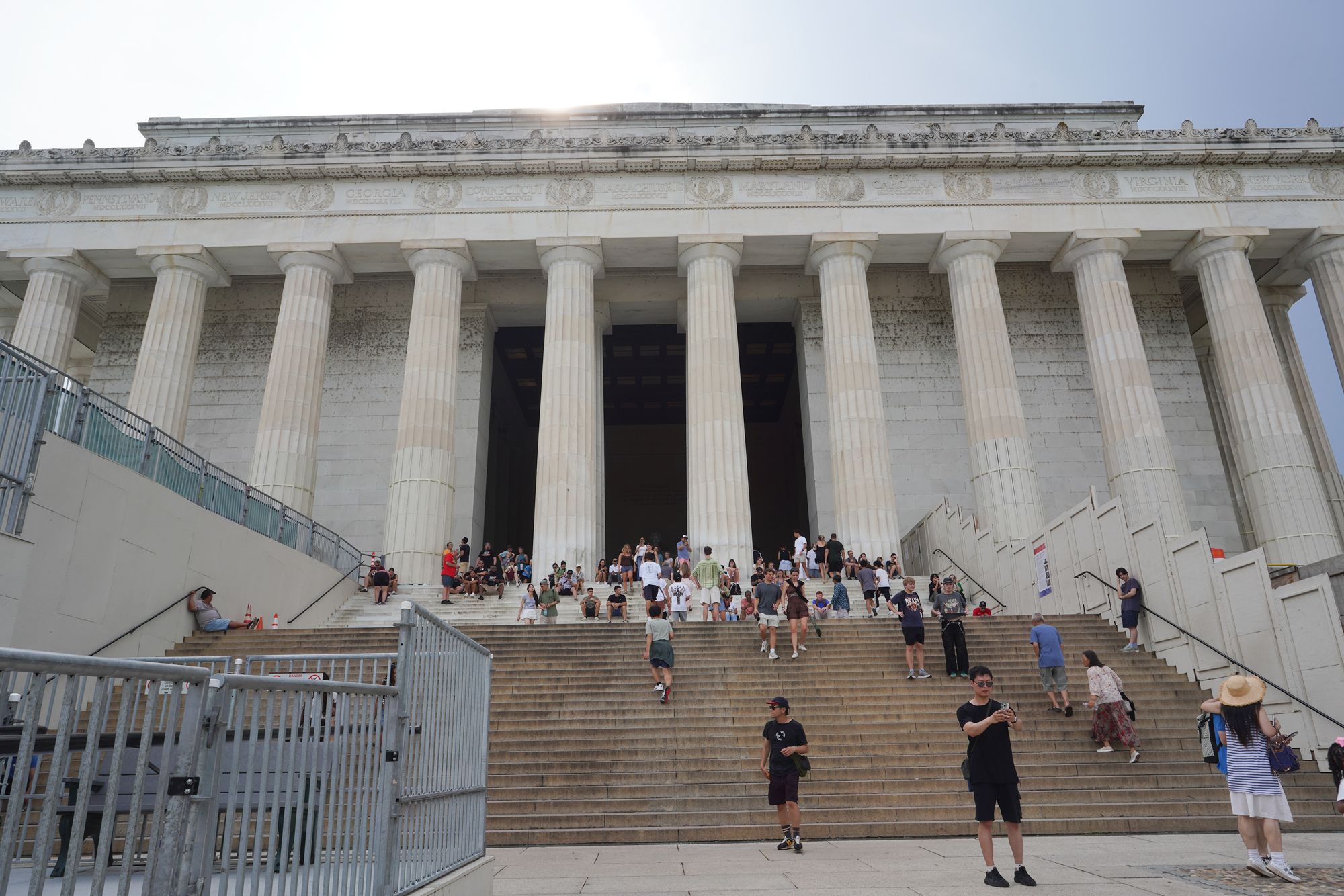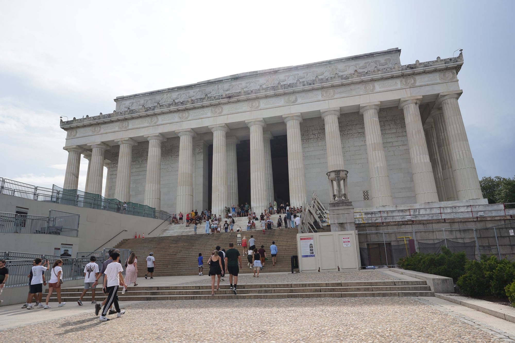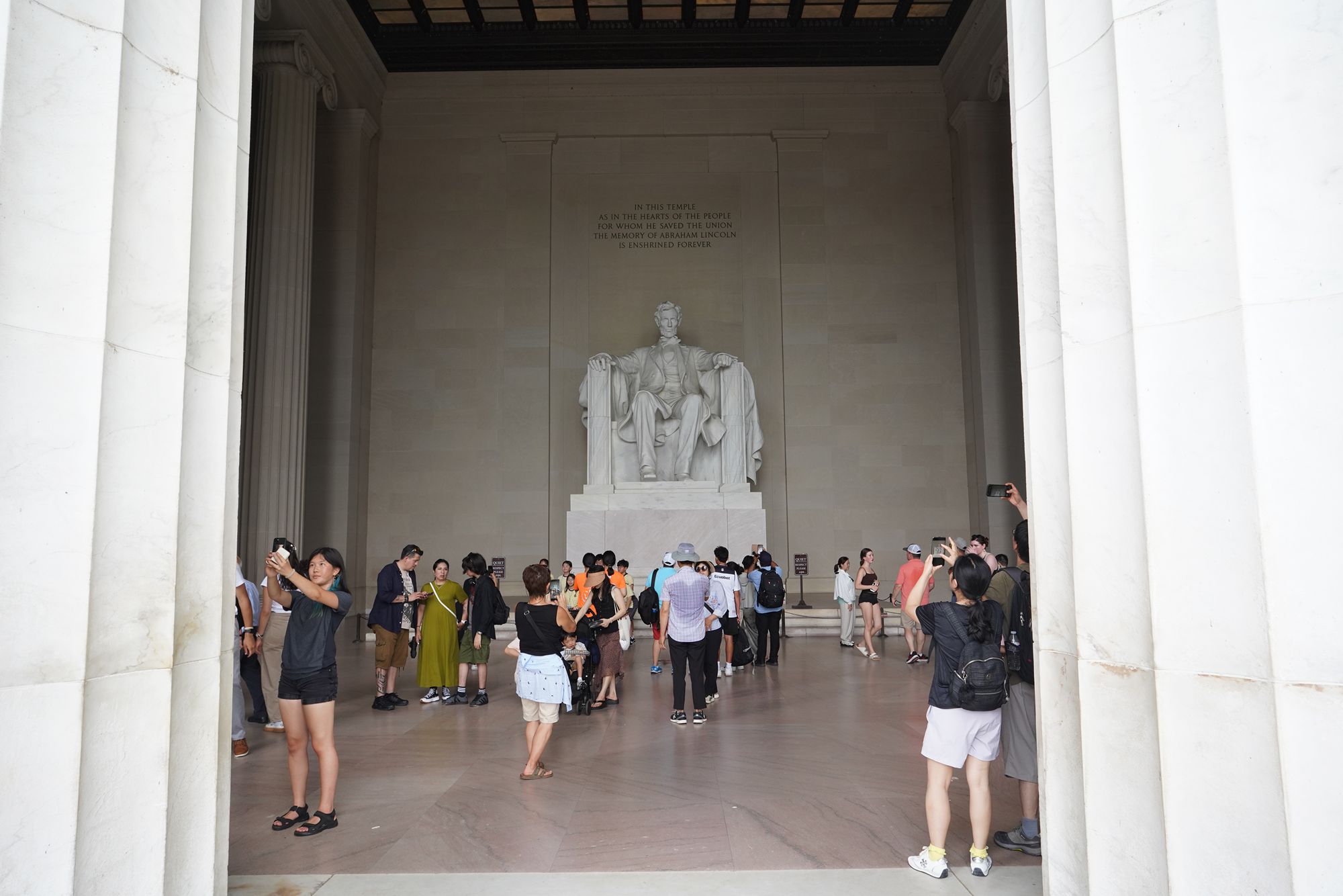 Inside sits the monumental 19-foot marble statue of Lincoln, sculpted by Daniel Chester French, depicting him seated in thought and strength, symbolizing wisdom and resolve.