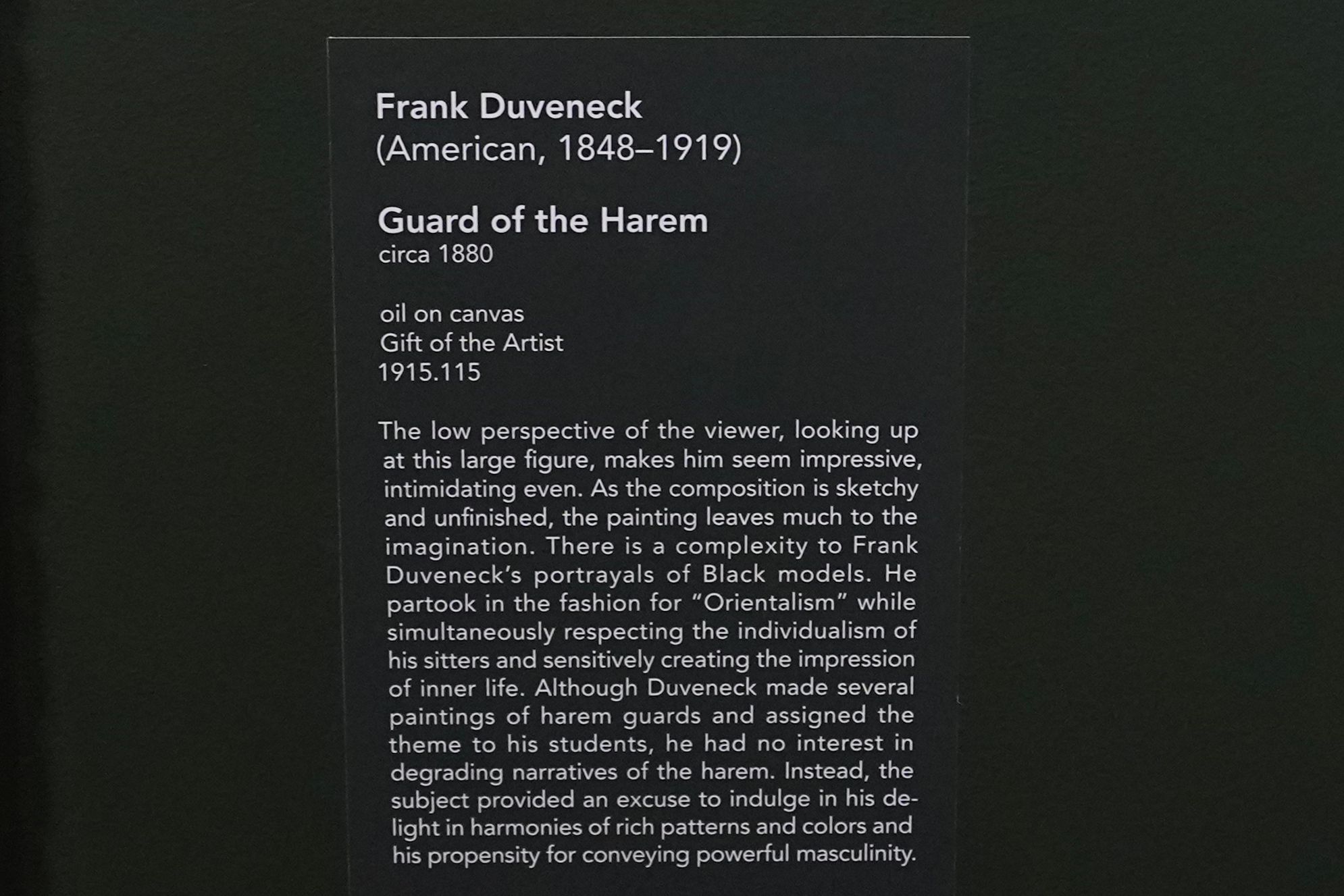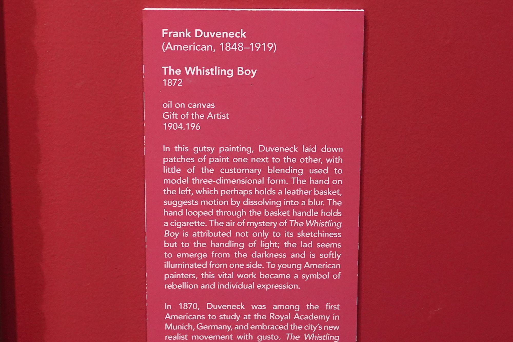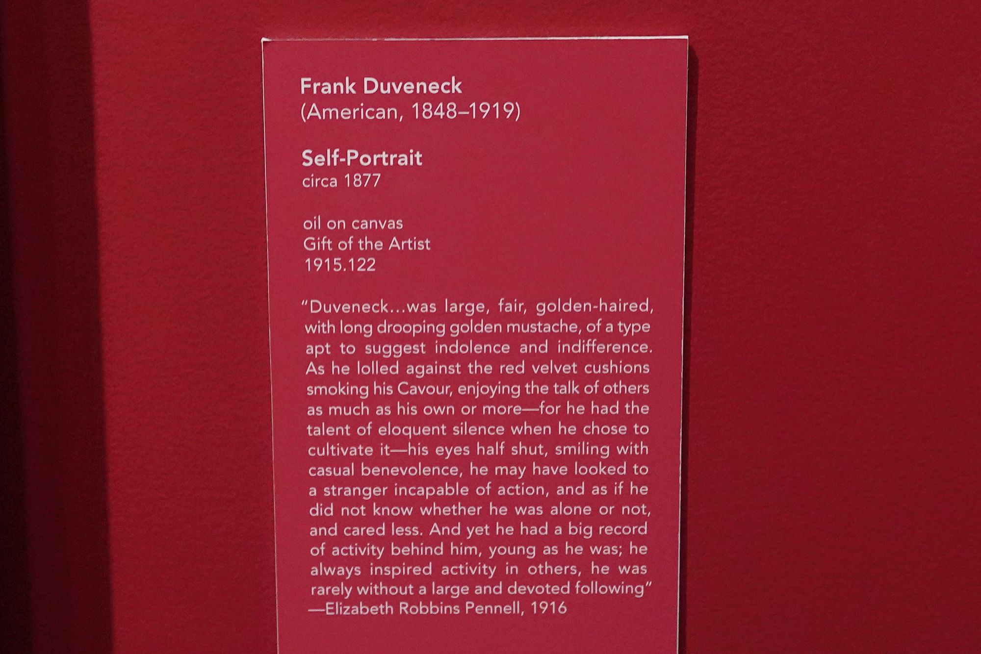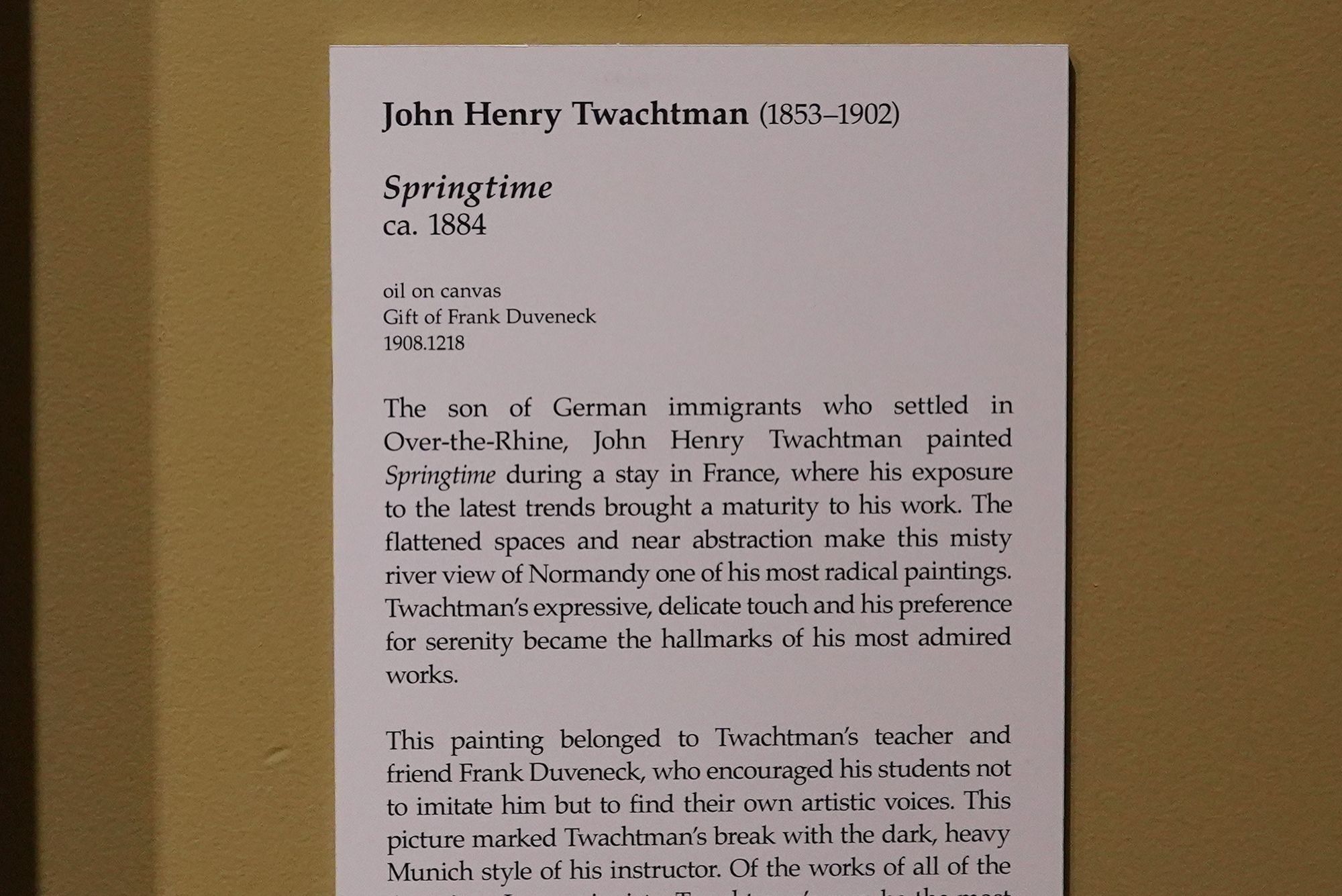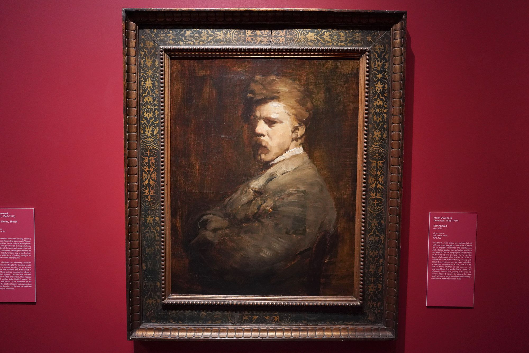 Trained in Munich, he became known for bold, expressive portraits and teaching. Duveneck influenced a generation of American artists and played a key role in establishing Cincinnati as an important center for late-19th-century American art.