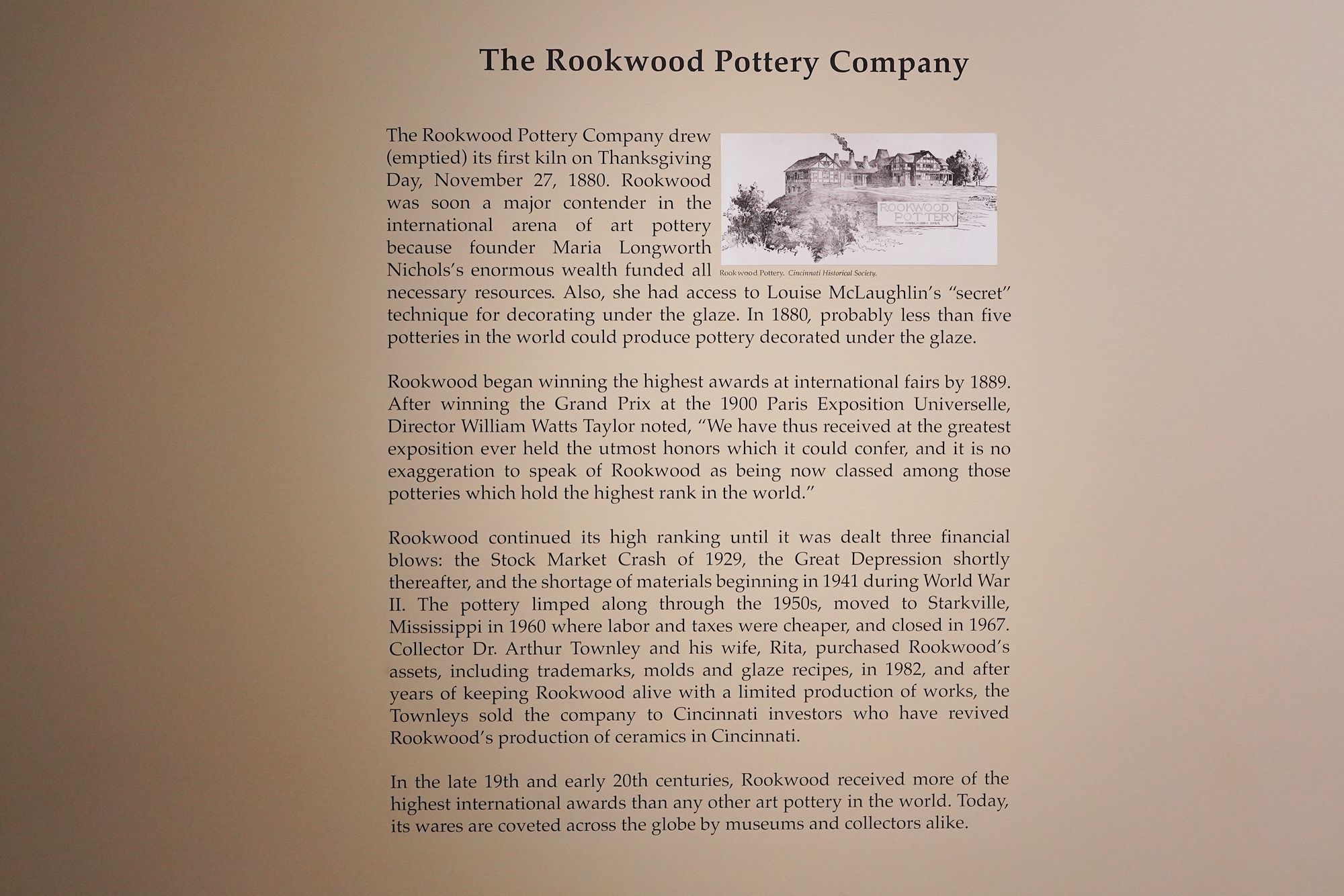 Known for high-quality hand-crafted ceramics, innovative glazes, and artistic design, Rookwood became internationally famous and helped establish Cincinnati as a center of American decorative arts in the late 19th and early 20th centuries.