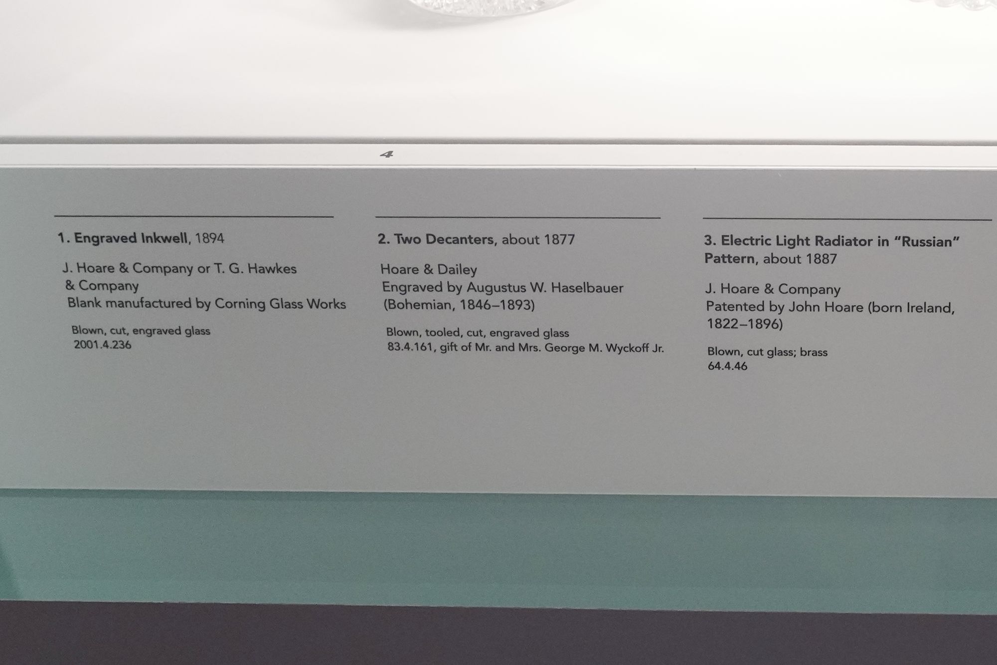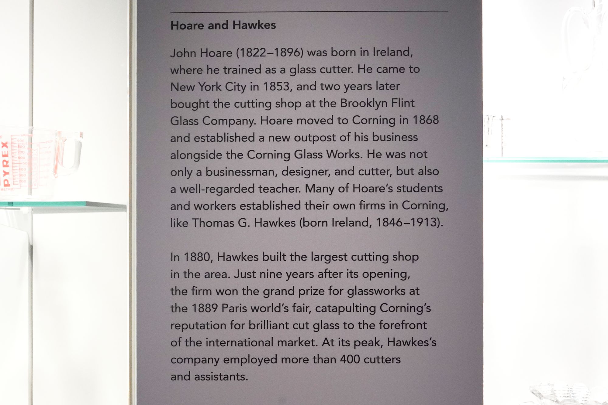 Hoare & Company and T. G. Hawkes & Company played major roles in American glass-cutting heritage. Hoare & Company was an early, prominent glass-cutting firm in Brooklyn and later Corning, NY.
