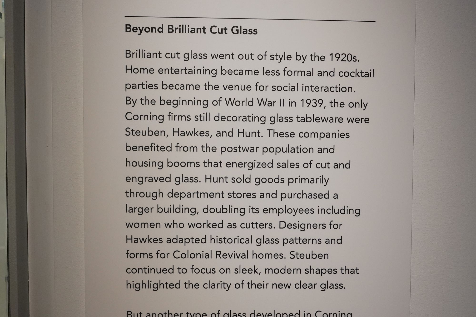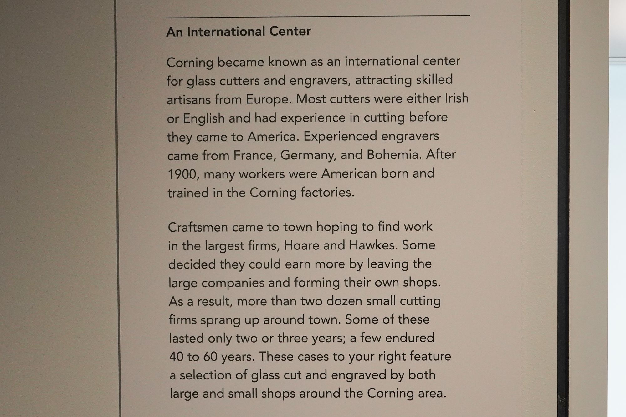 Skilled glassworkers from Europe arrived in Corning during the late 19th century, bringing cutting techniques and artistry that helped the region flourish. Hoare & Company and later T. G. Hawkes & Company became leading producers of brilliant cut glass. Many trained craftsmen eventually opened their own shops, expanding Corning into a thriving glassmaking community.