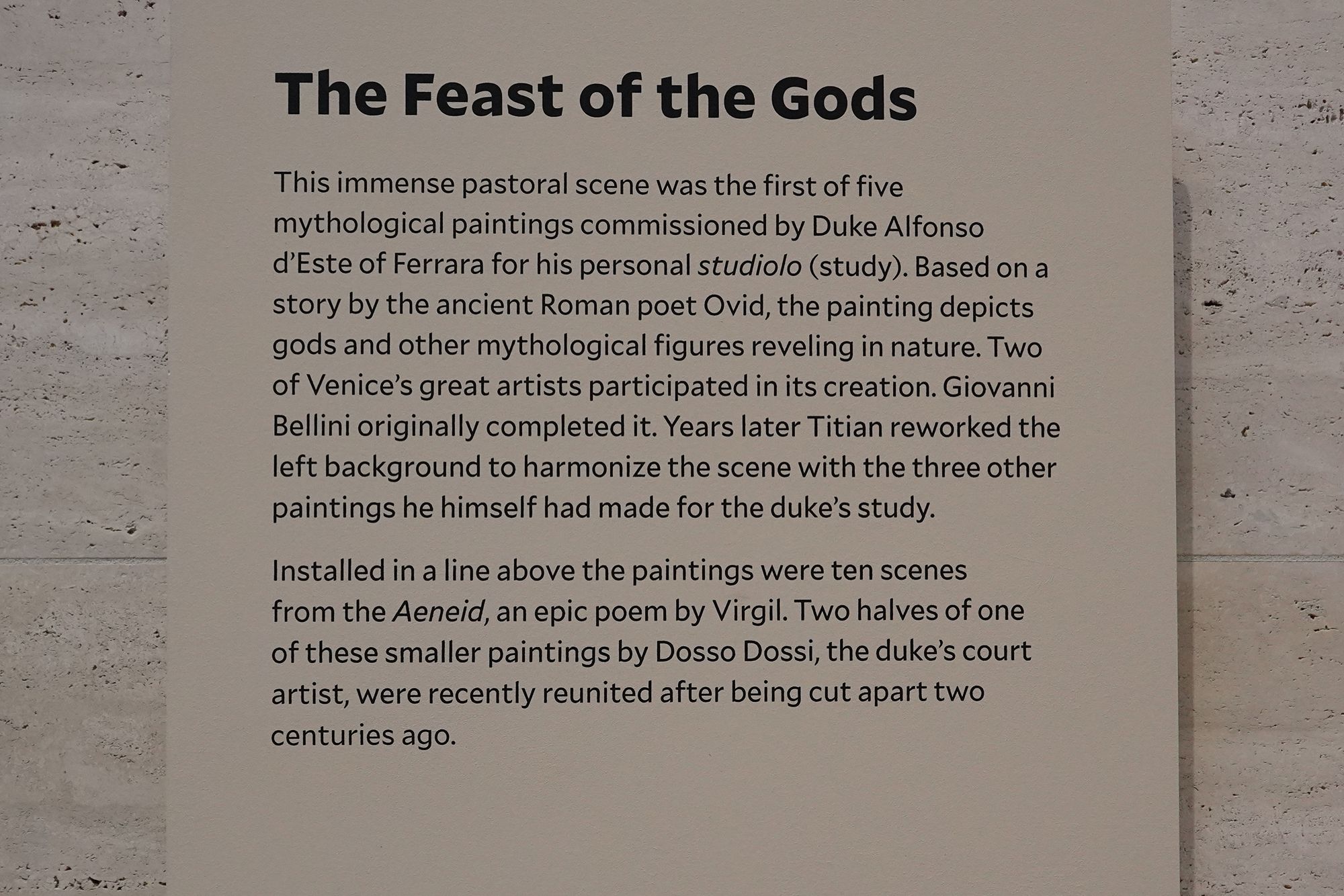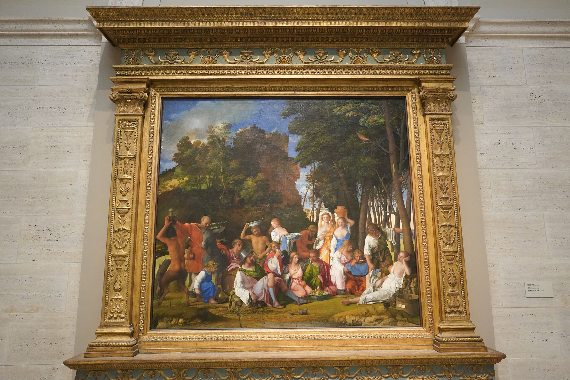 The work depicts a mythological banquet of the gods—including Bacchus, Neptune, Mercury, and Jupiter—feasting and drinking in a wooded landscape. The scene is based on Ovid’s Fasti and represents one of the earliest large-scale mythological paintings of the Venetian Renaissance.
