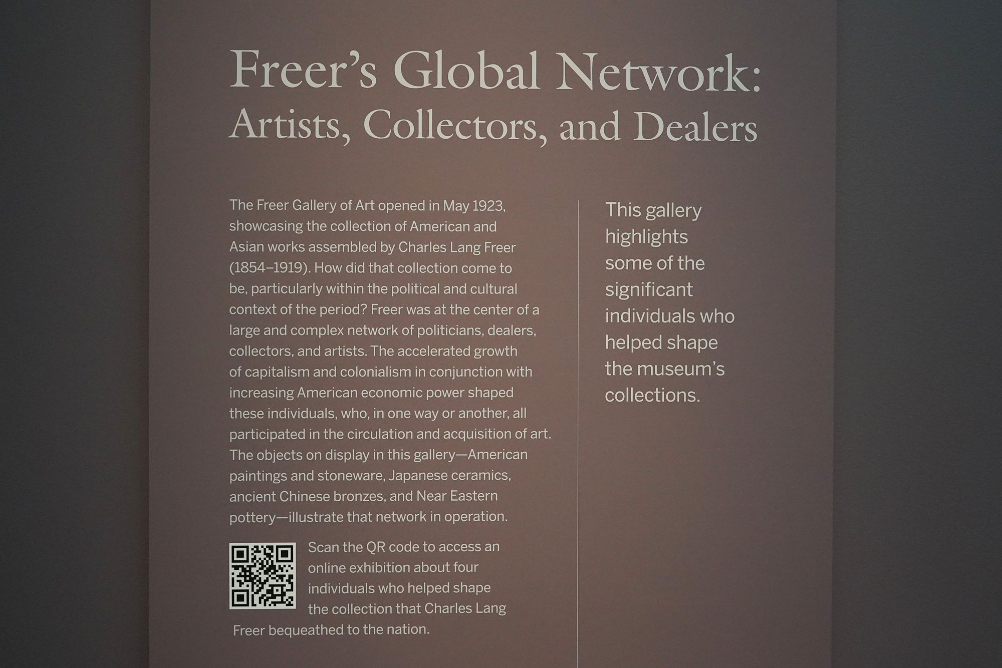 Freer formed close relationships with artists such as James McNeill Whistler and gathered one of the most important collections of Chinese, Japanese, Korean, and American art of his time. He donated his entire collection, along with funds to build and maintain the museum, to the Smithsonian, creating the first national art museum dedicated to Asian art in the United States.