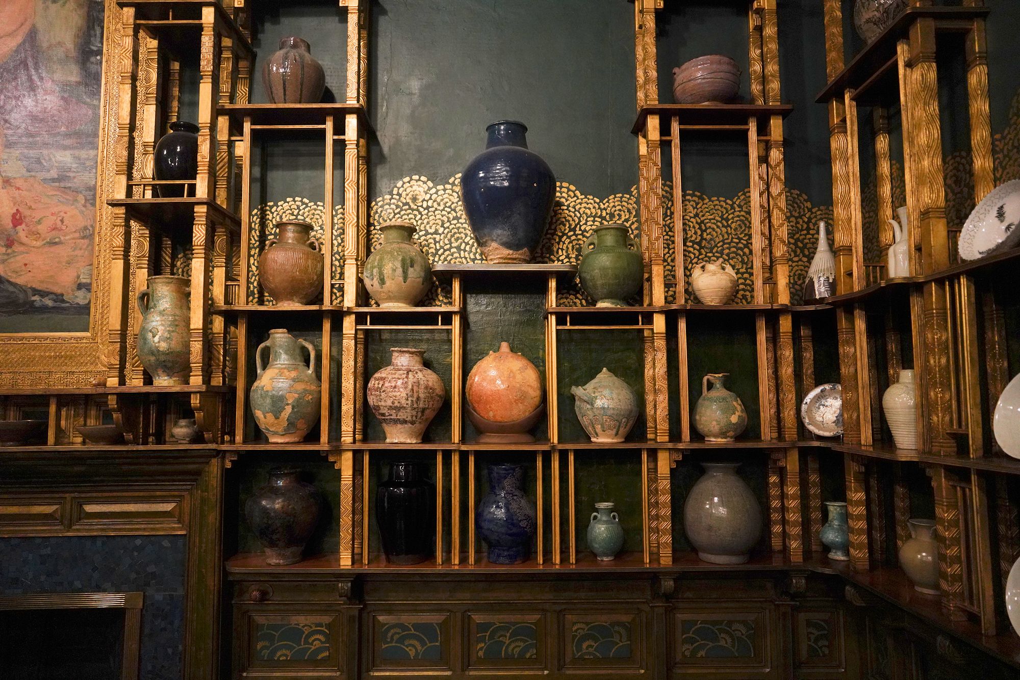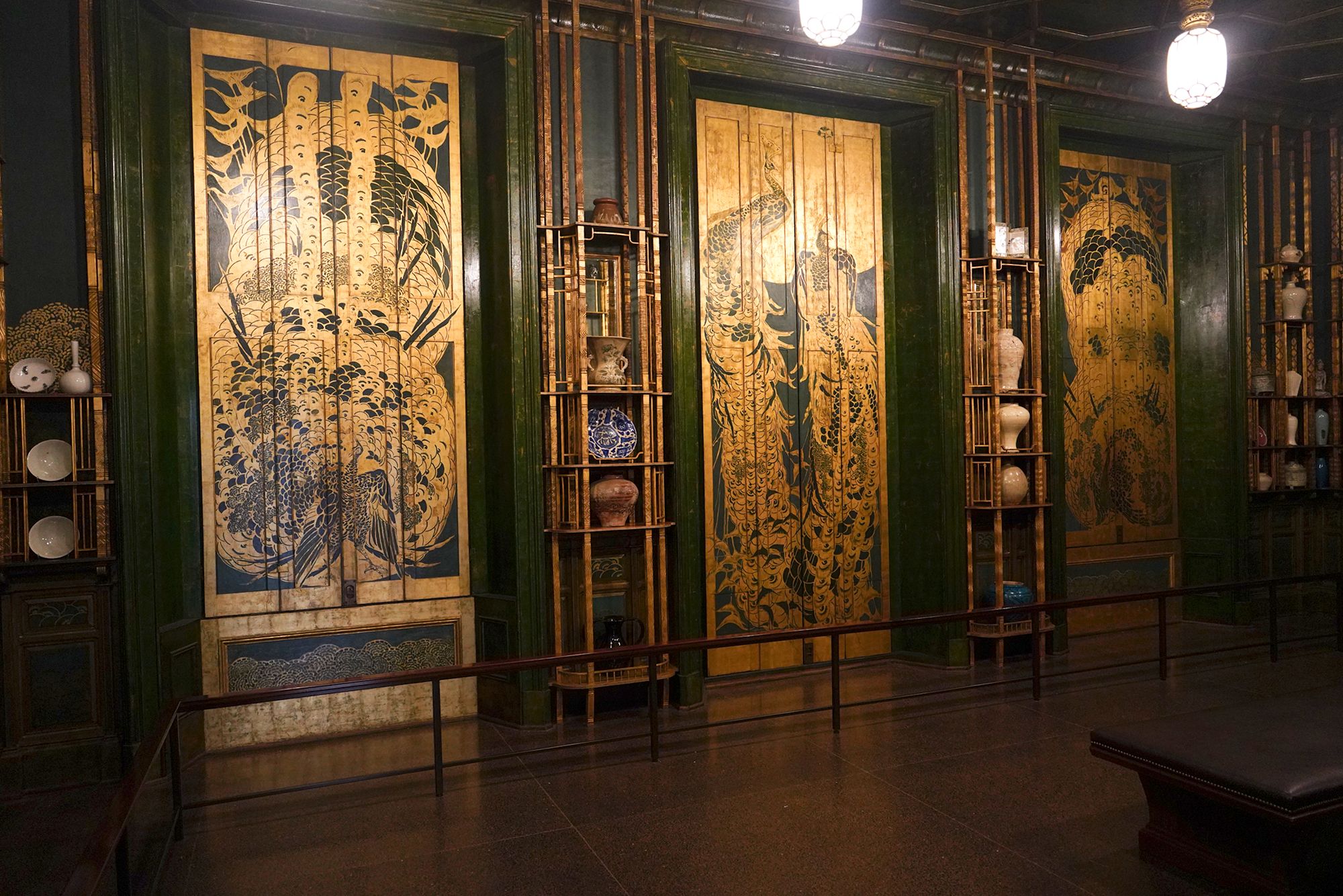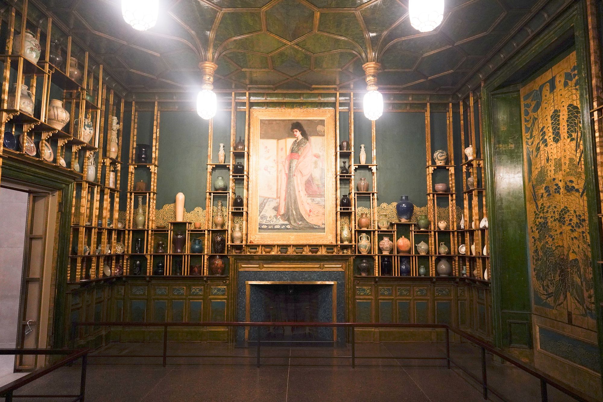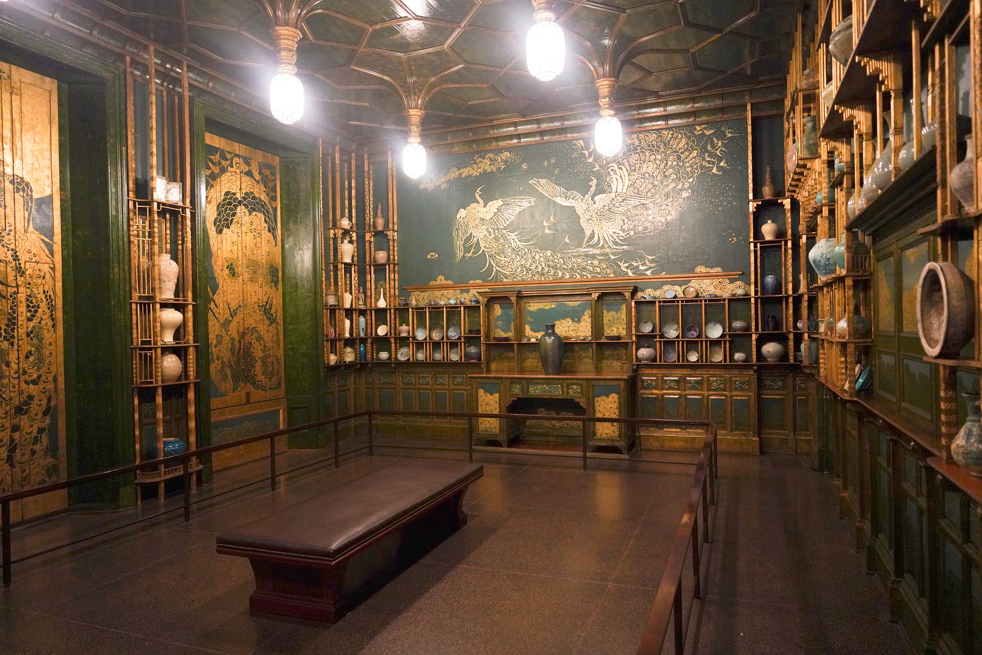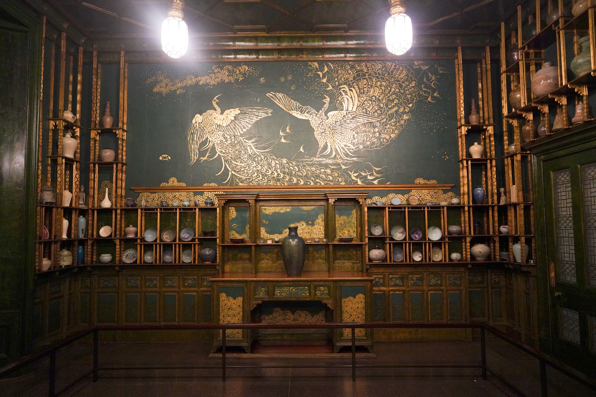 Peacock Room. The Peacock Room is a richly decorated interior designed by artist James McNeill Whistler in the 1870s. Originally created for a London home, the room features elaborate blue-green walls, gold-painted peacock motifs, and shelves for displaying ceramics. Charles Lang Freer later acquired the room and installed it in his Detroit home before giving it to the Freer Gallery, where it is now preserved as a complete work of art combining painting, architecture, and design.