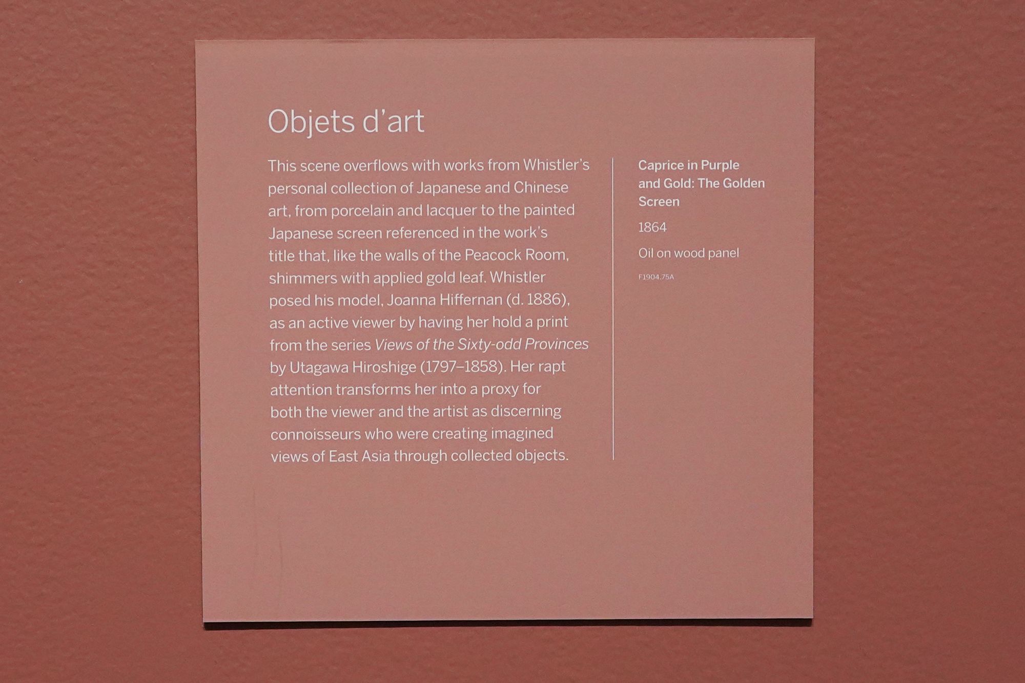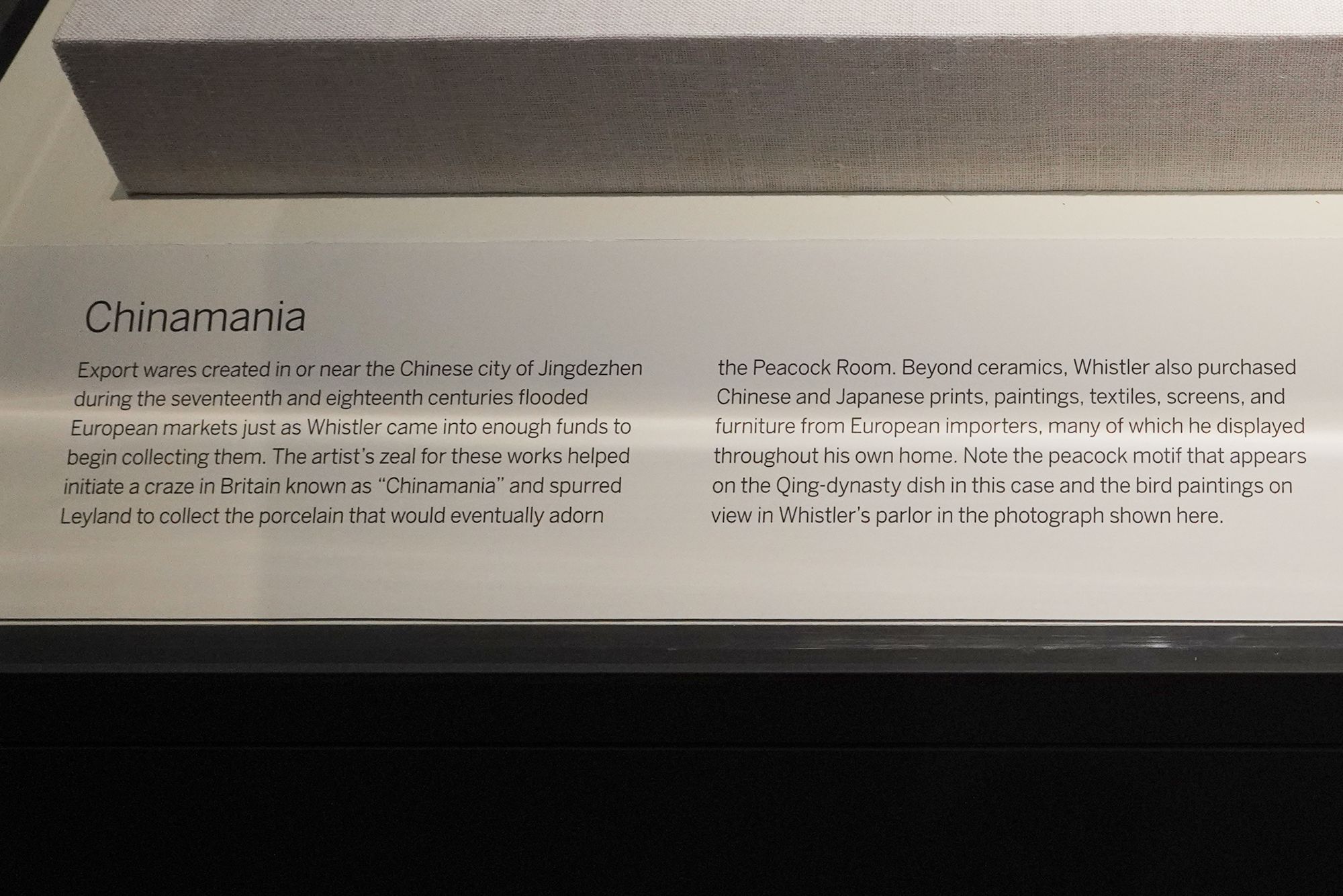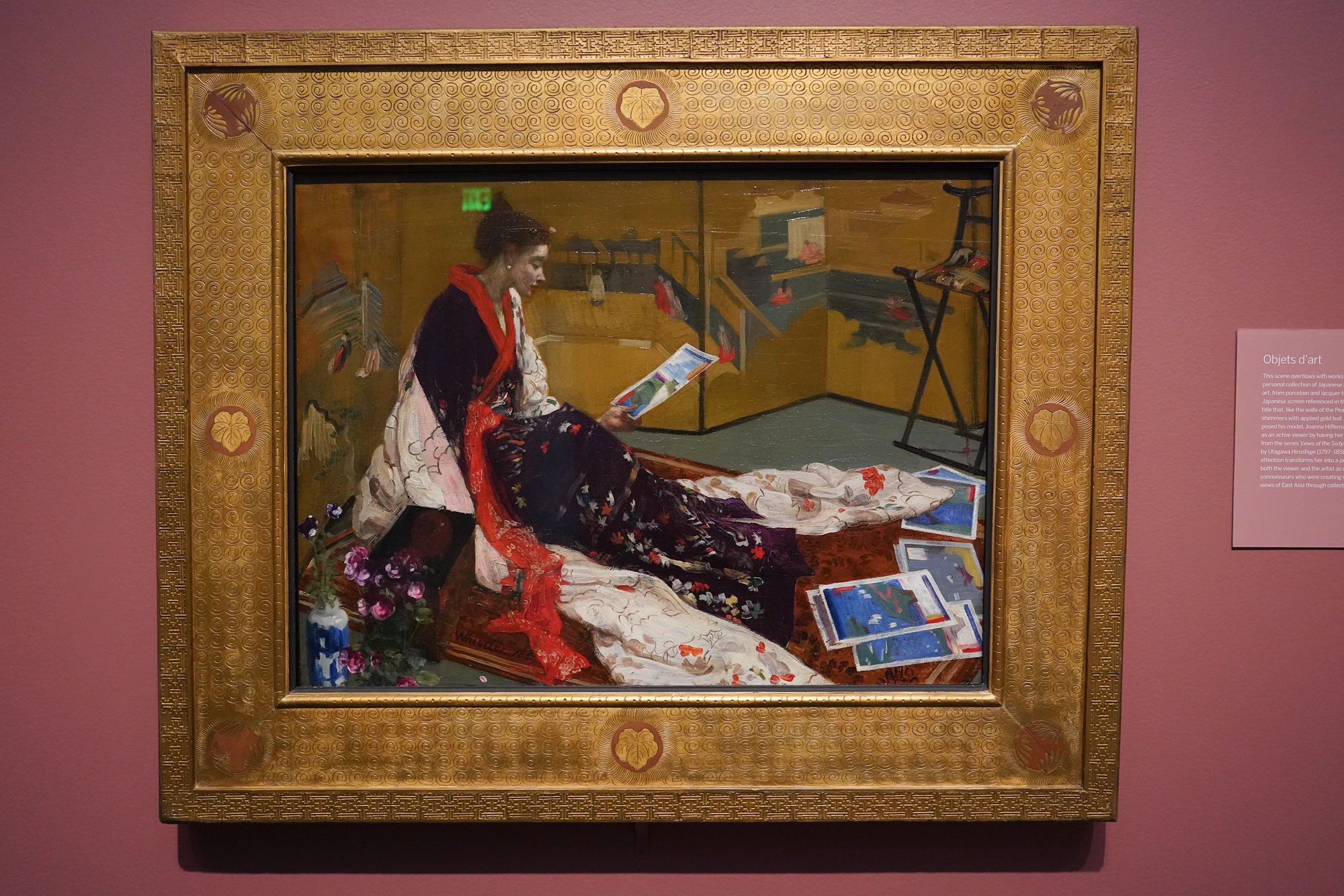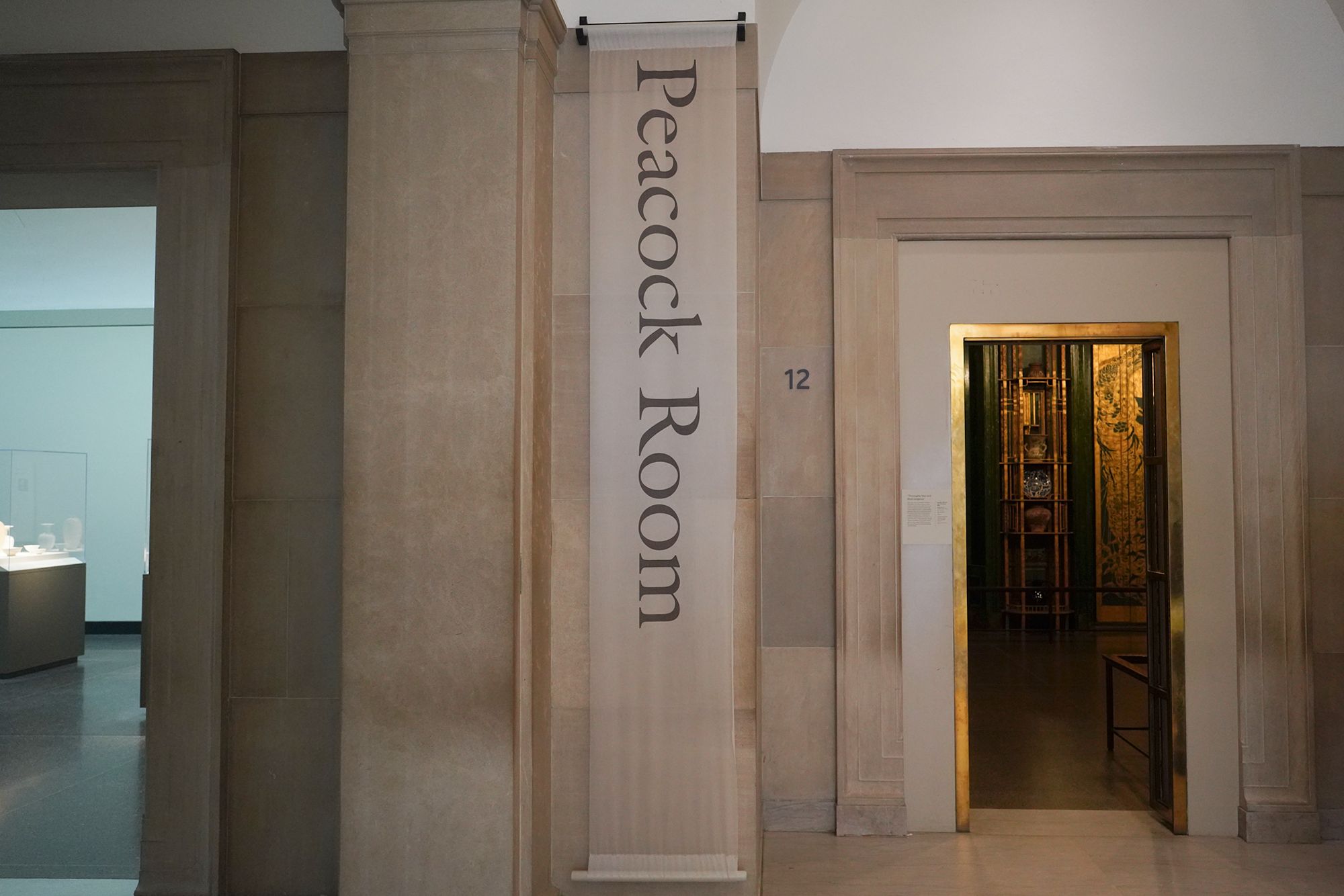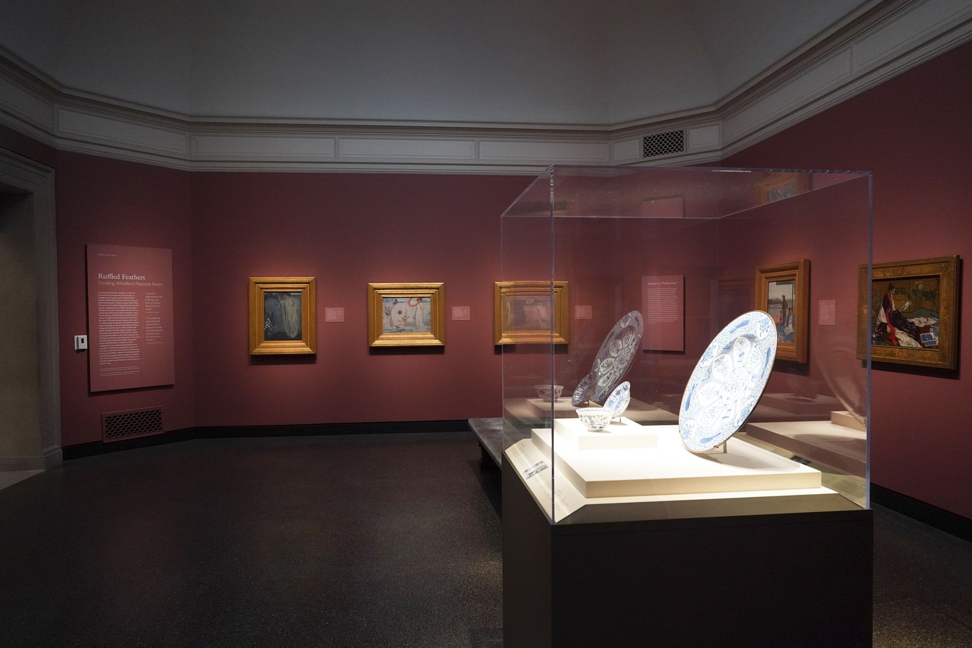 Peacock Room. The Peacock Room is a richly decorated interior designed by artist James McNeill Whistler in the 1870s. Originally created for a London home, the room features elaborate blue-green walls, gold-painted peacock motifs, and shelves for displaying ceramics. Charles Lang Freer later acquired the room and installed it in his Detroit home before giving it to the Freer Gallery, where it is now preserved as a complete work of art combining painting, architecture, and design.