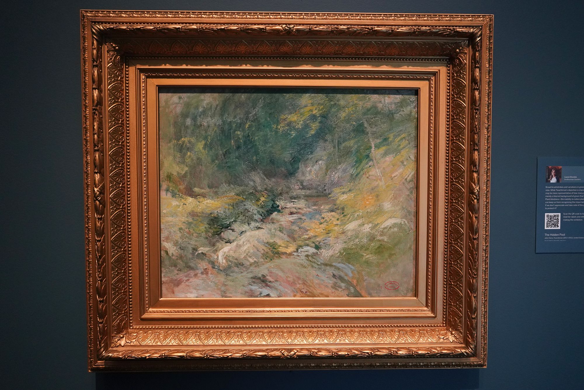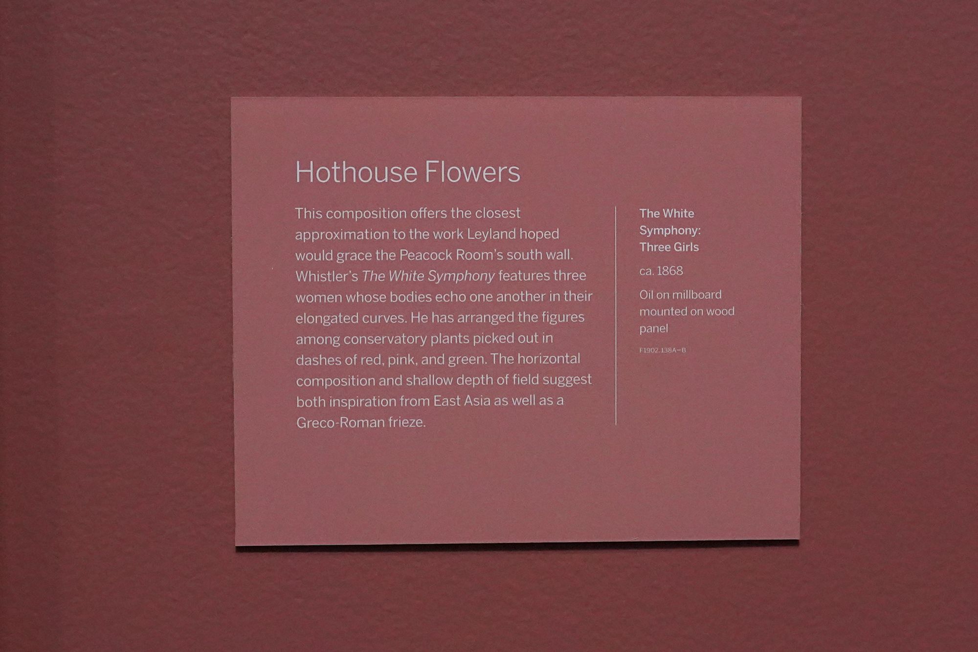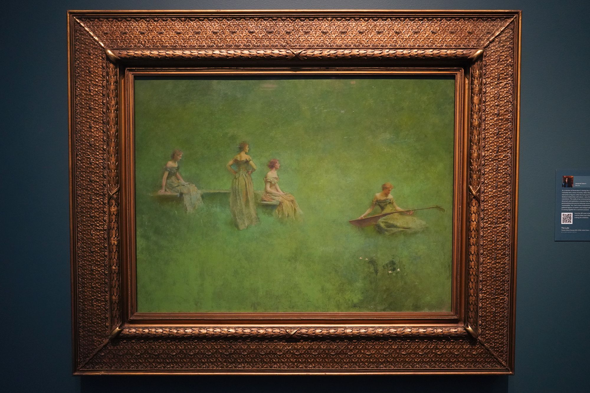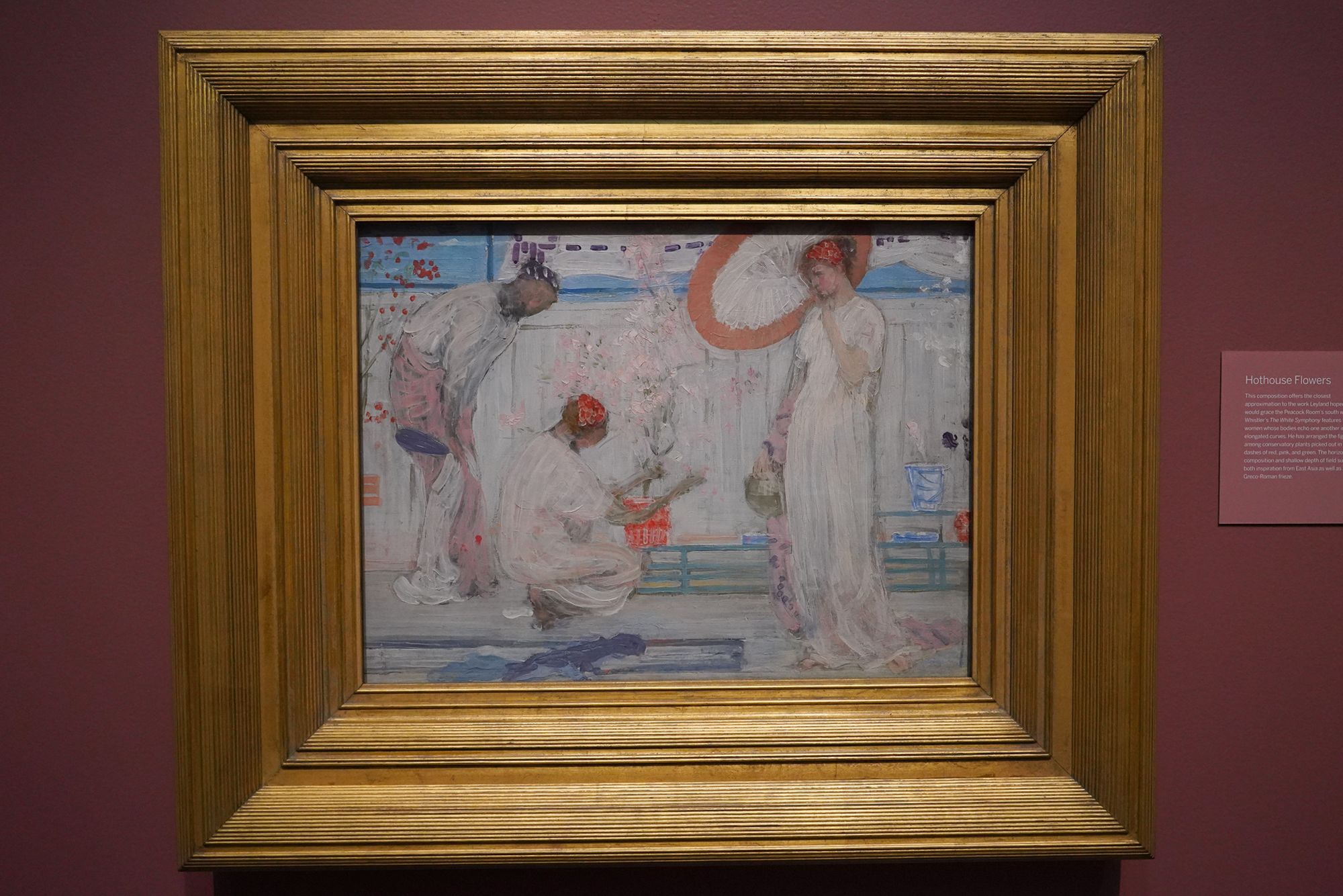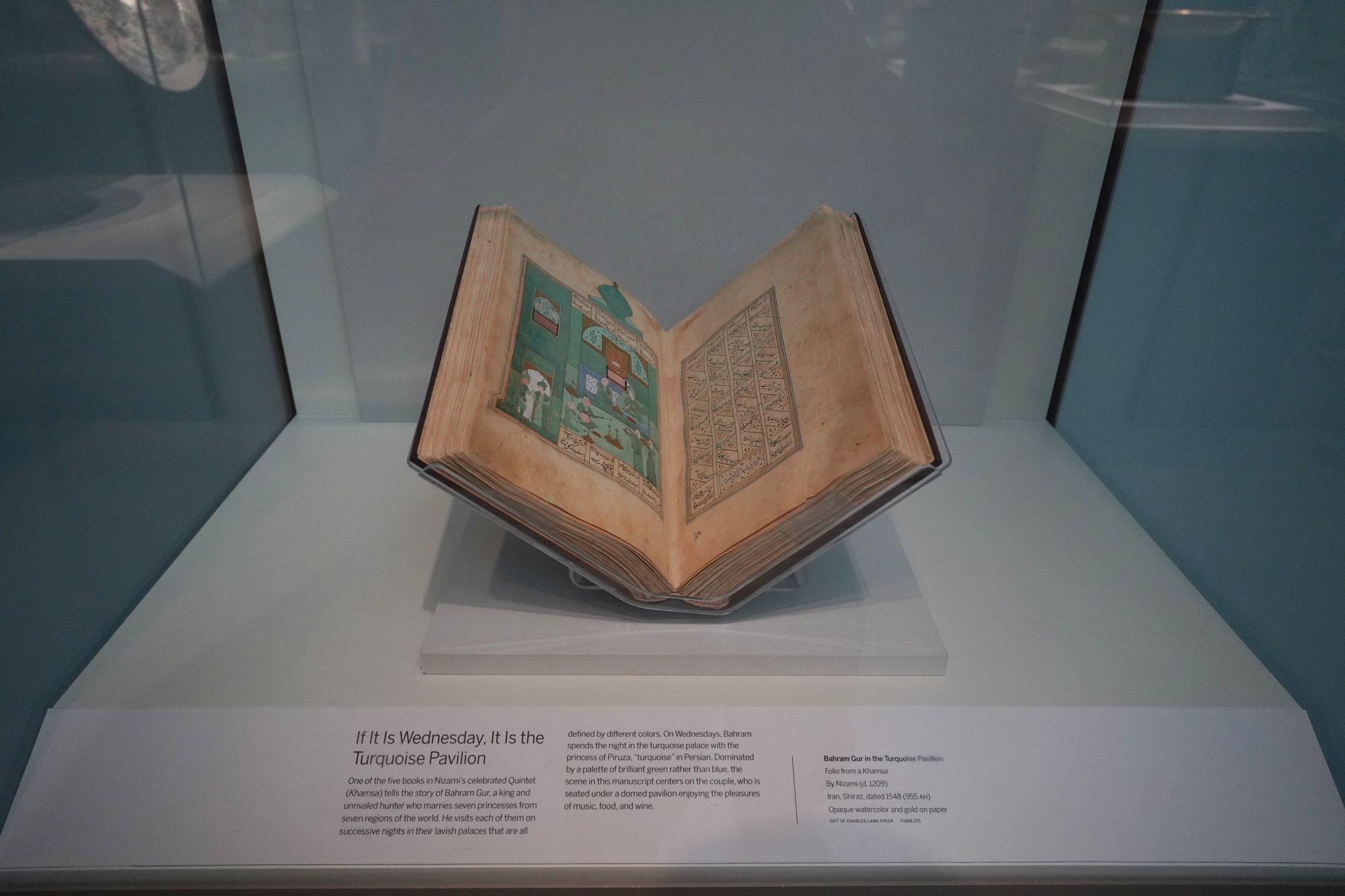 Peacock Room. The Peacock Room is a richly decorated interior designed by artist James McNeill Whistler in the 1870s. Originally created for a London home, the room features elaborate blue-green walls, gold-painted peacock motifs, and shelves for displaying ceramics. Charles Lang Freer later acquired the room and installed it in his Detroit home before giving it to the Freer Gallery, where it is now preserved as a complete work of art combining painting, architecture, and design.