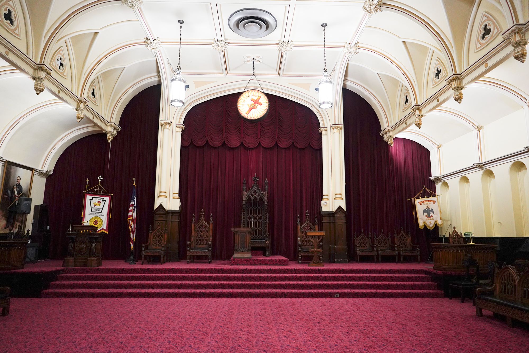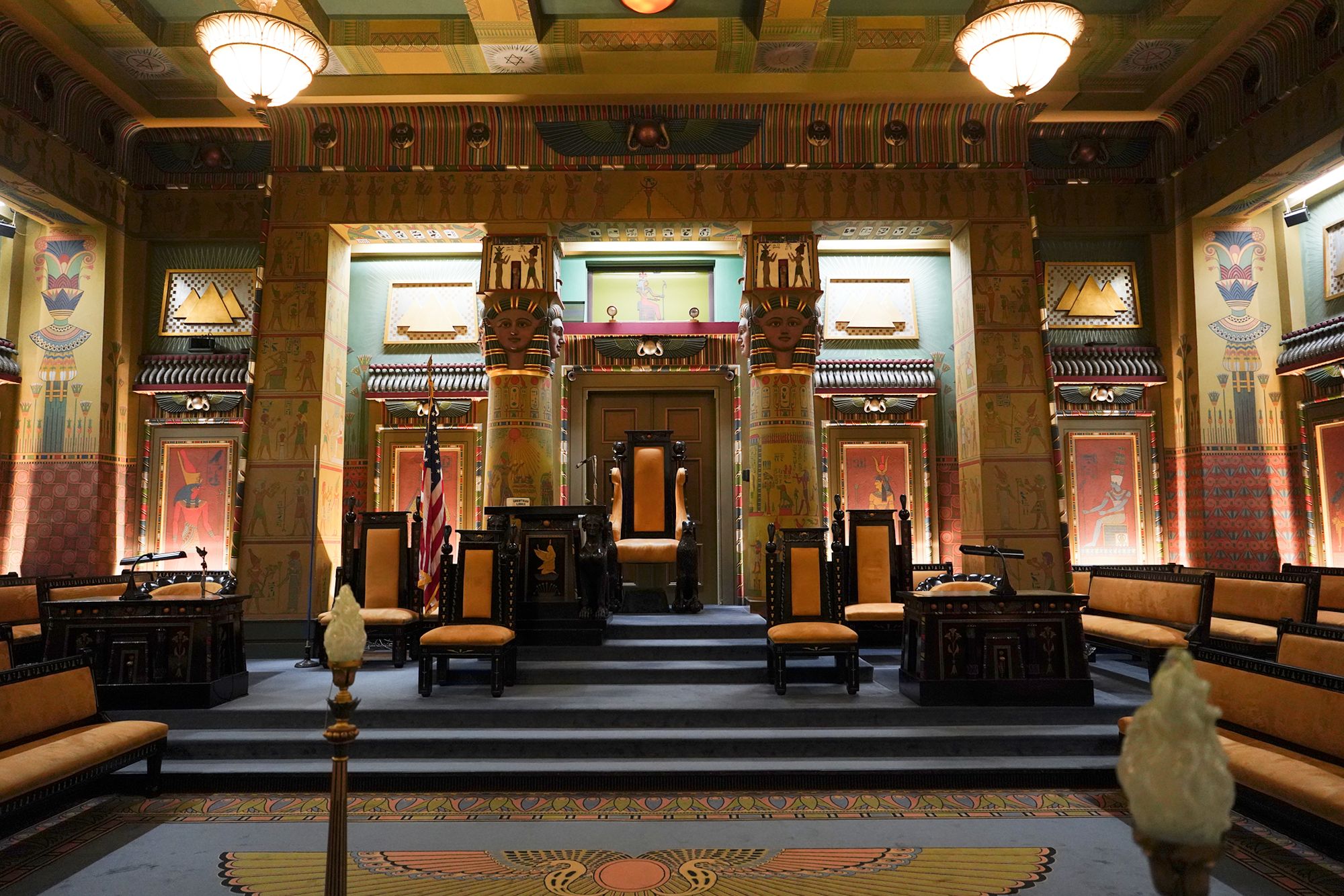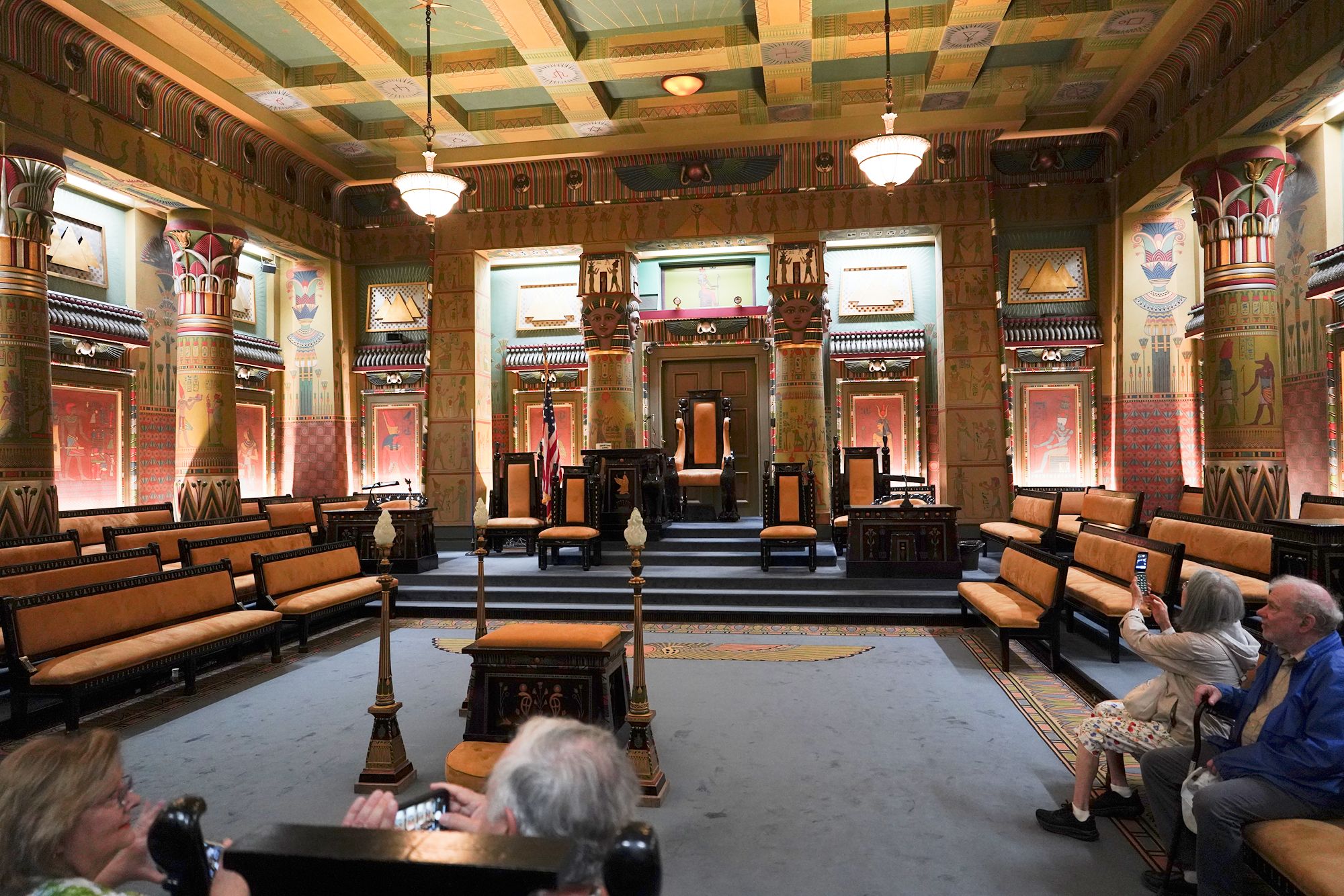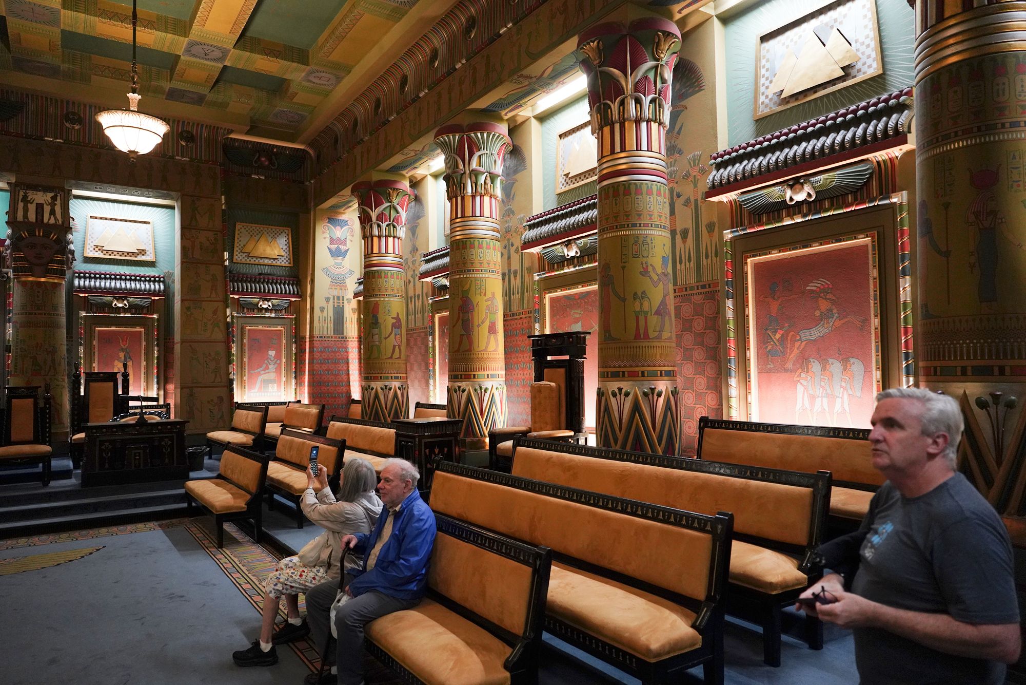 Inside the Masonic Temple are seven main lodge halls, each designed in a completely different artistic style. One hall is built in an Egyptian theme with sphinxes and hieroglyphs, while others reflect Gothic, Norman, Renaissance, Ionic, and Corinthian influences. Walking through the building feels like moving through several architectural worlds in one place.