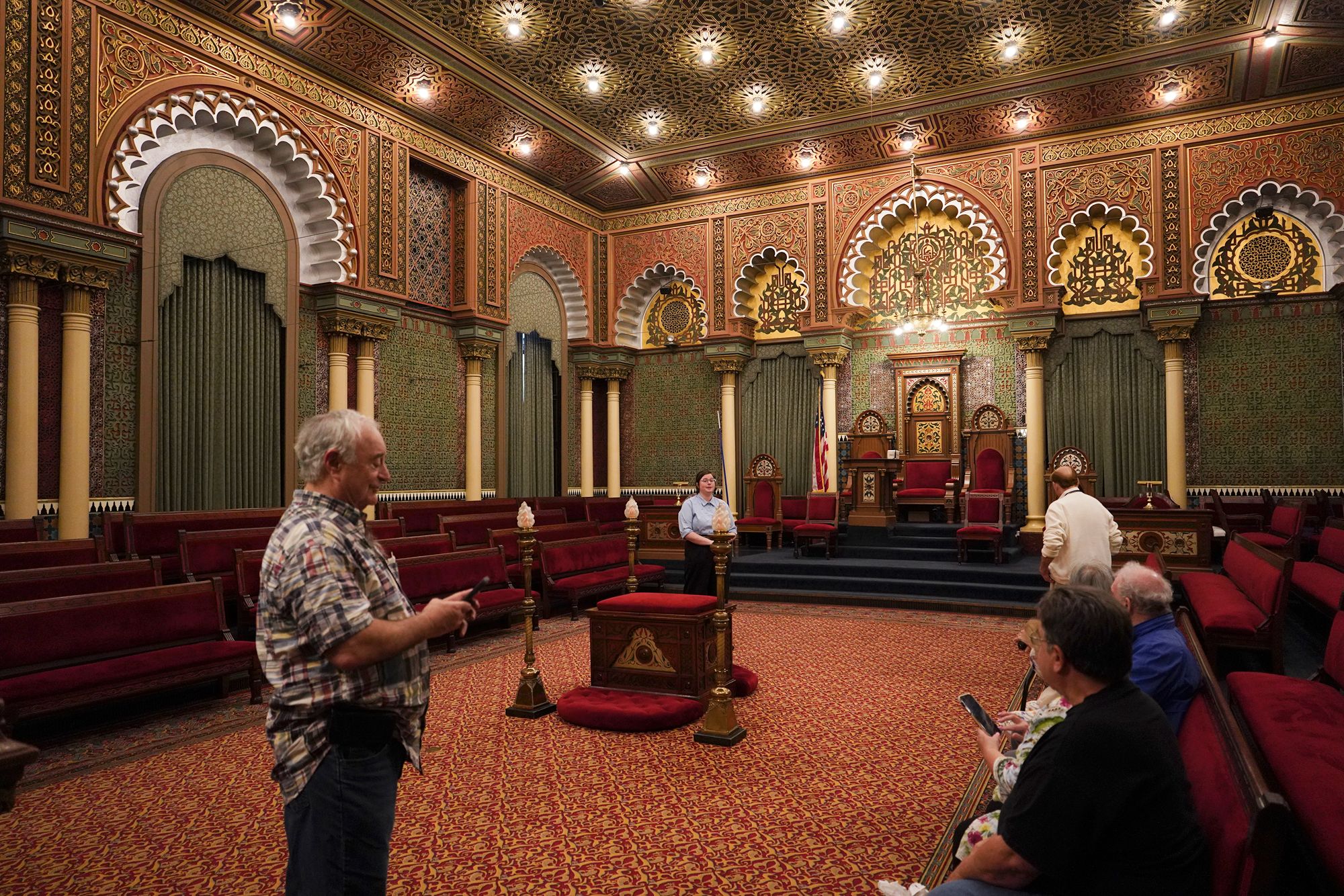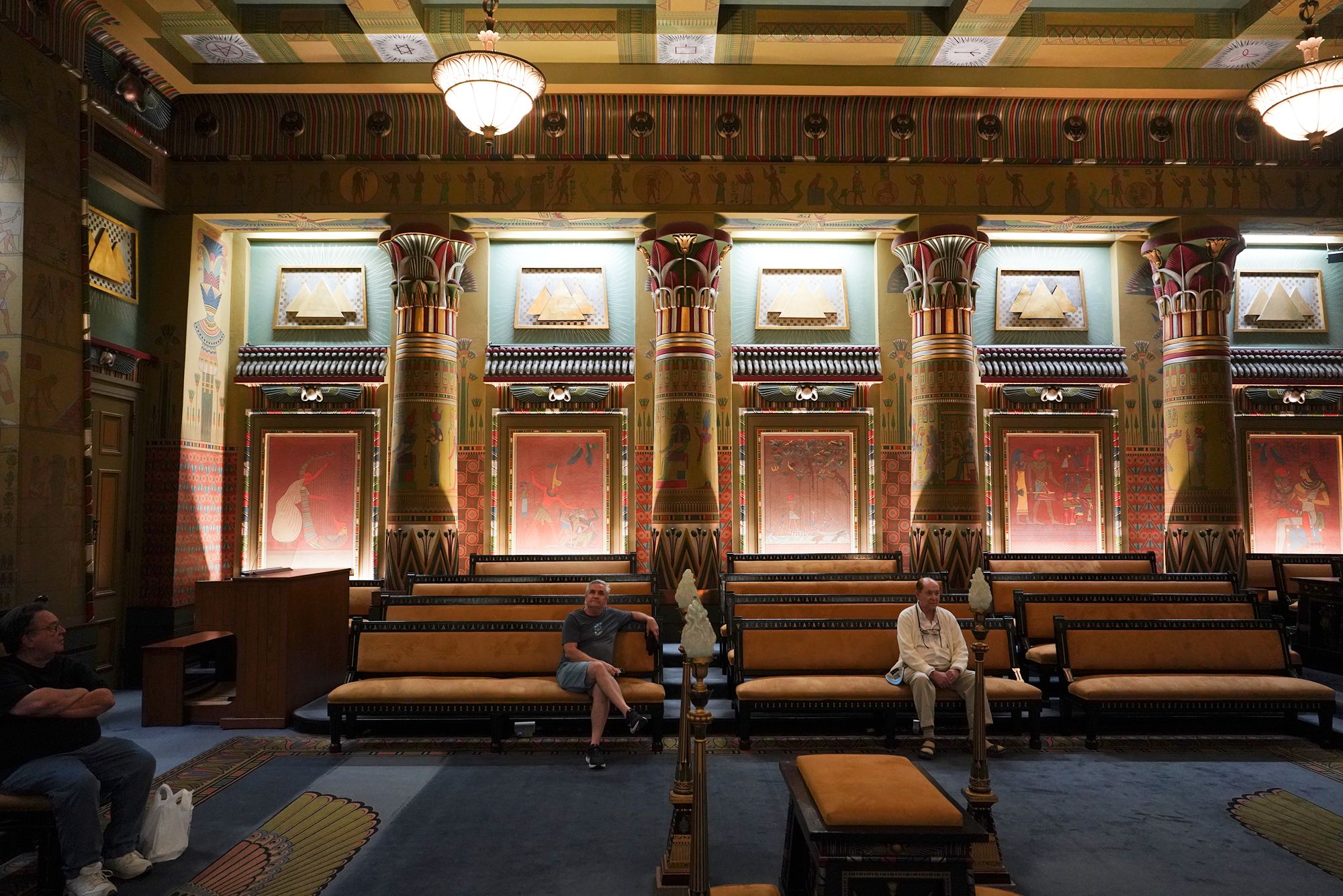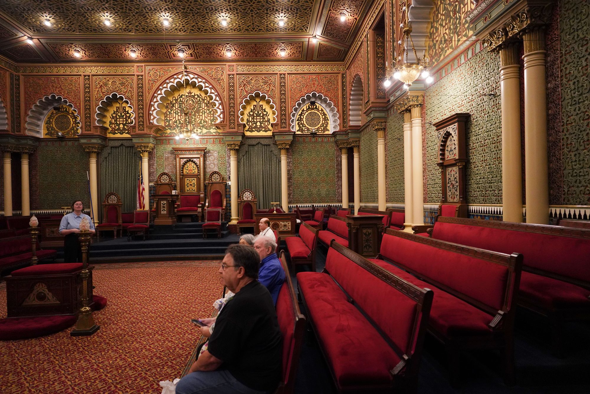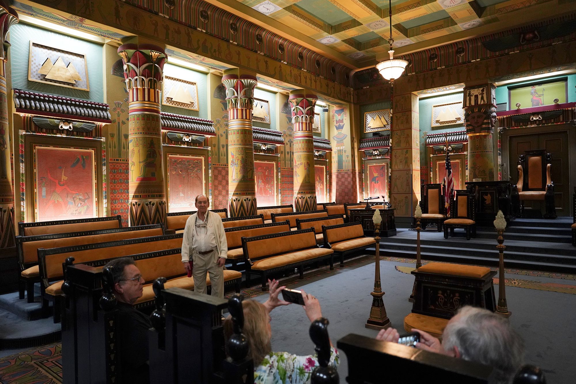 Inside the Masonic Temple are seven main lodge halls, each designed in a completely different artistic style. One hall is built in an Egyptian theme with sphinxes and hieroglyphs, while others reflect Gothic, Norman, Renaissance, Ionic, and Corinthian influences. Walking through the building feels like moving through several architectural worlds in one place.