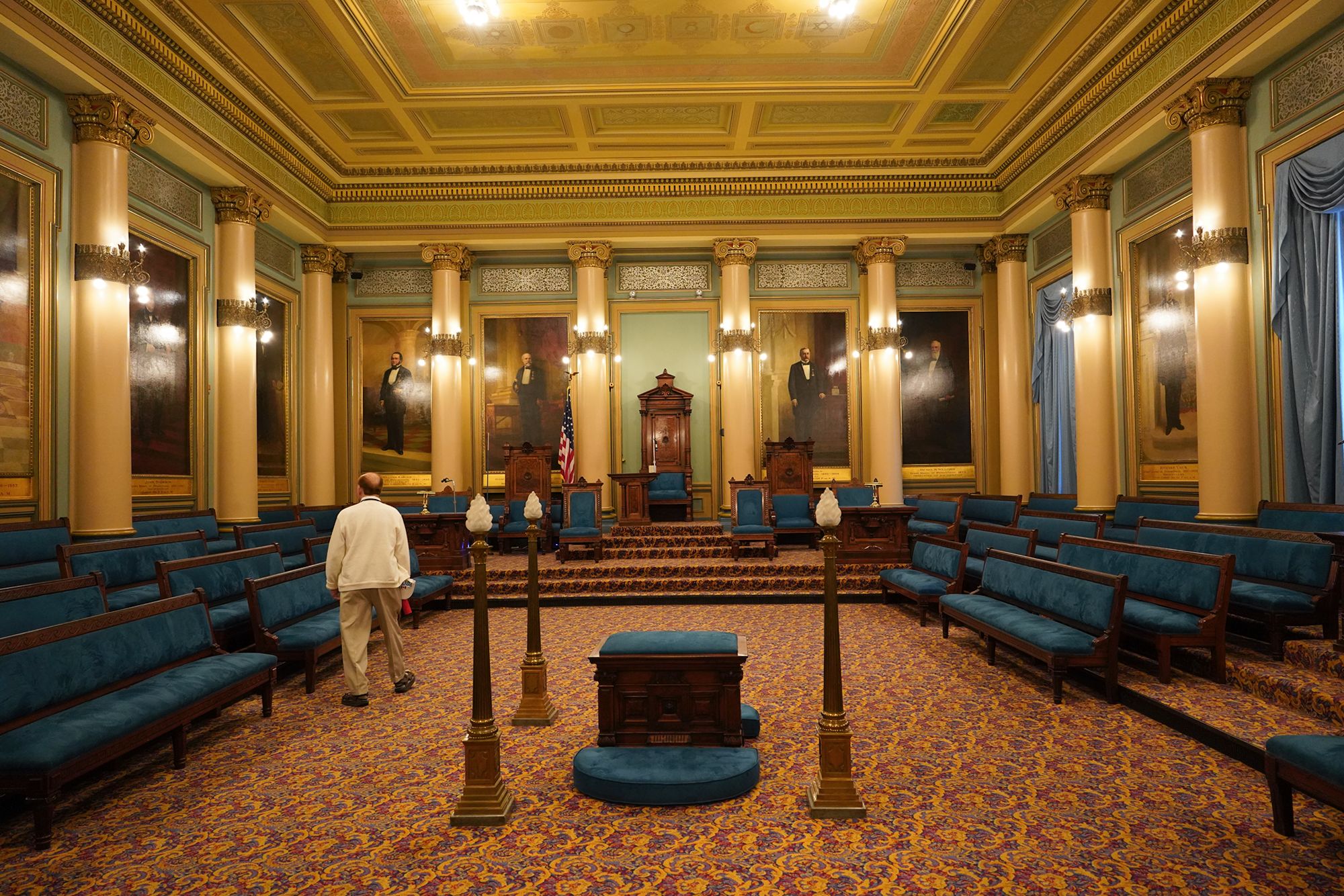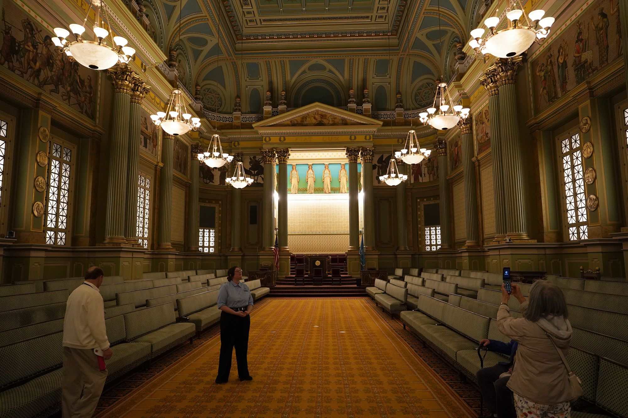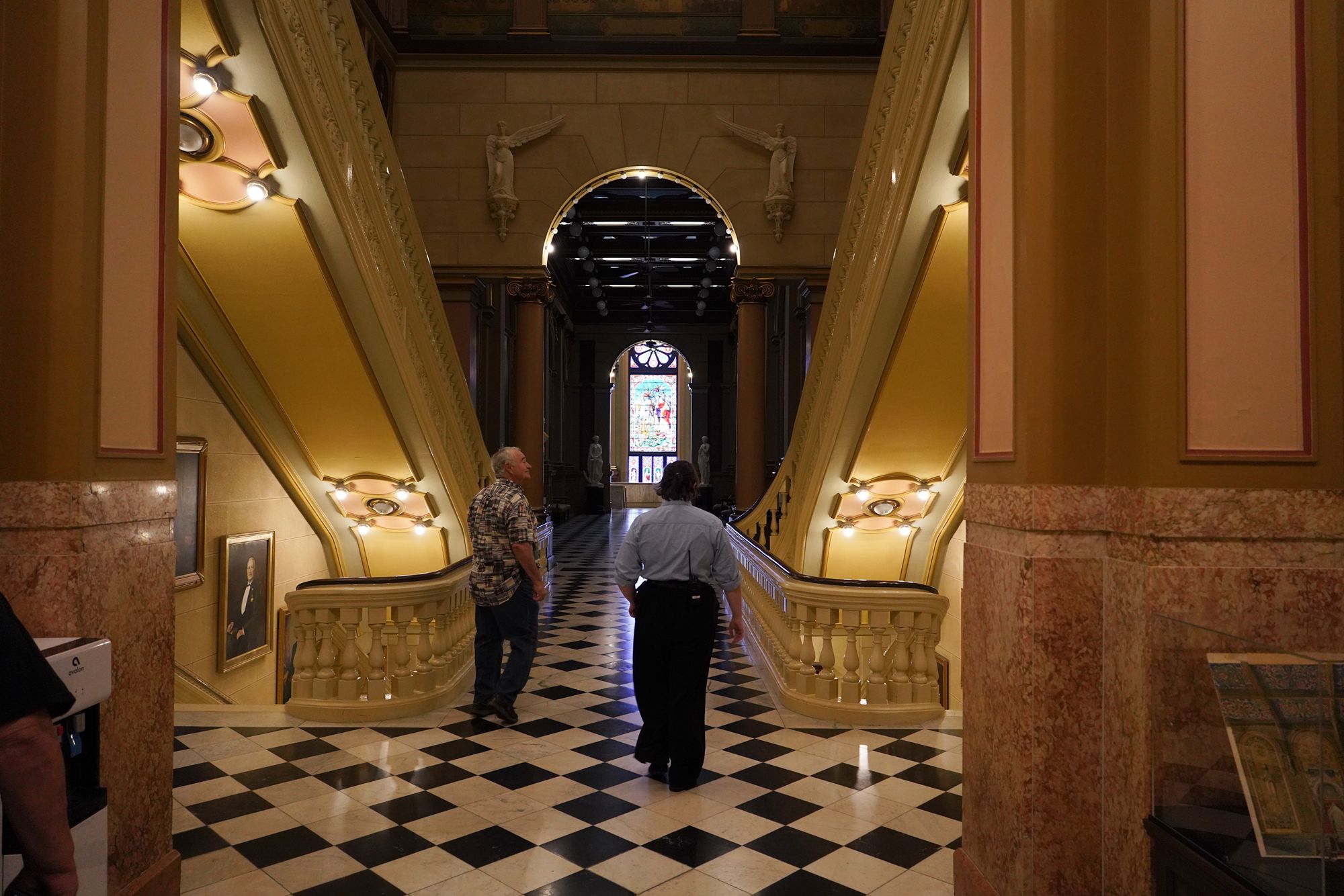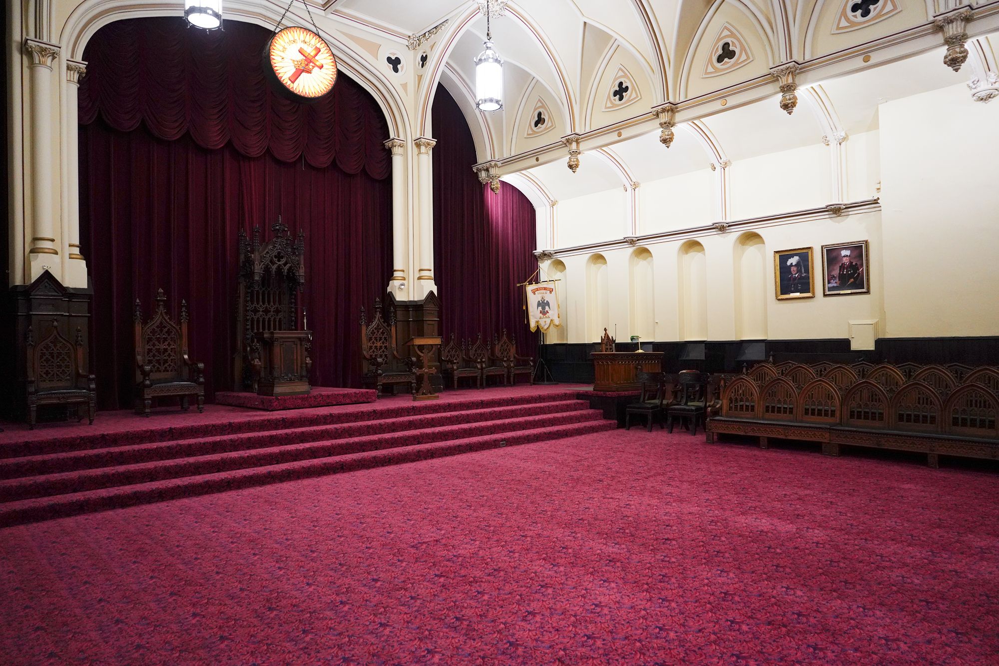 Inside the Masonic Temple are seven main lodge halls, each designed in a completely different artistic style. One hall is built in an Egyptian theme with sphinxes and hieroglyphs, while others reflect Gothic, Norman, Renaissance, Ionic, and Corinthian influences. Walking through the building feels like moving through several architectural worlds in one place.