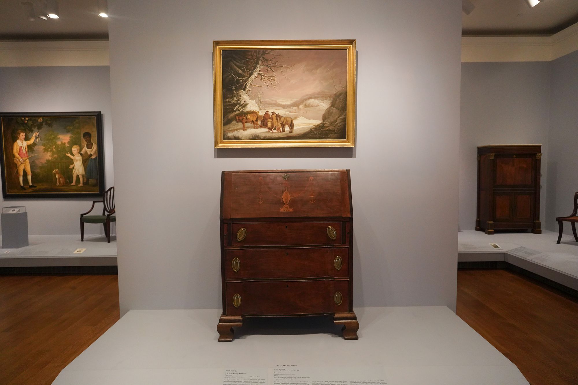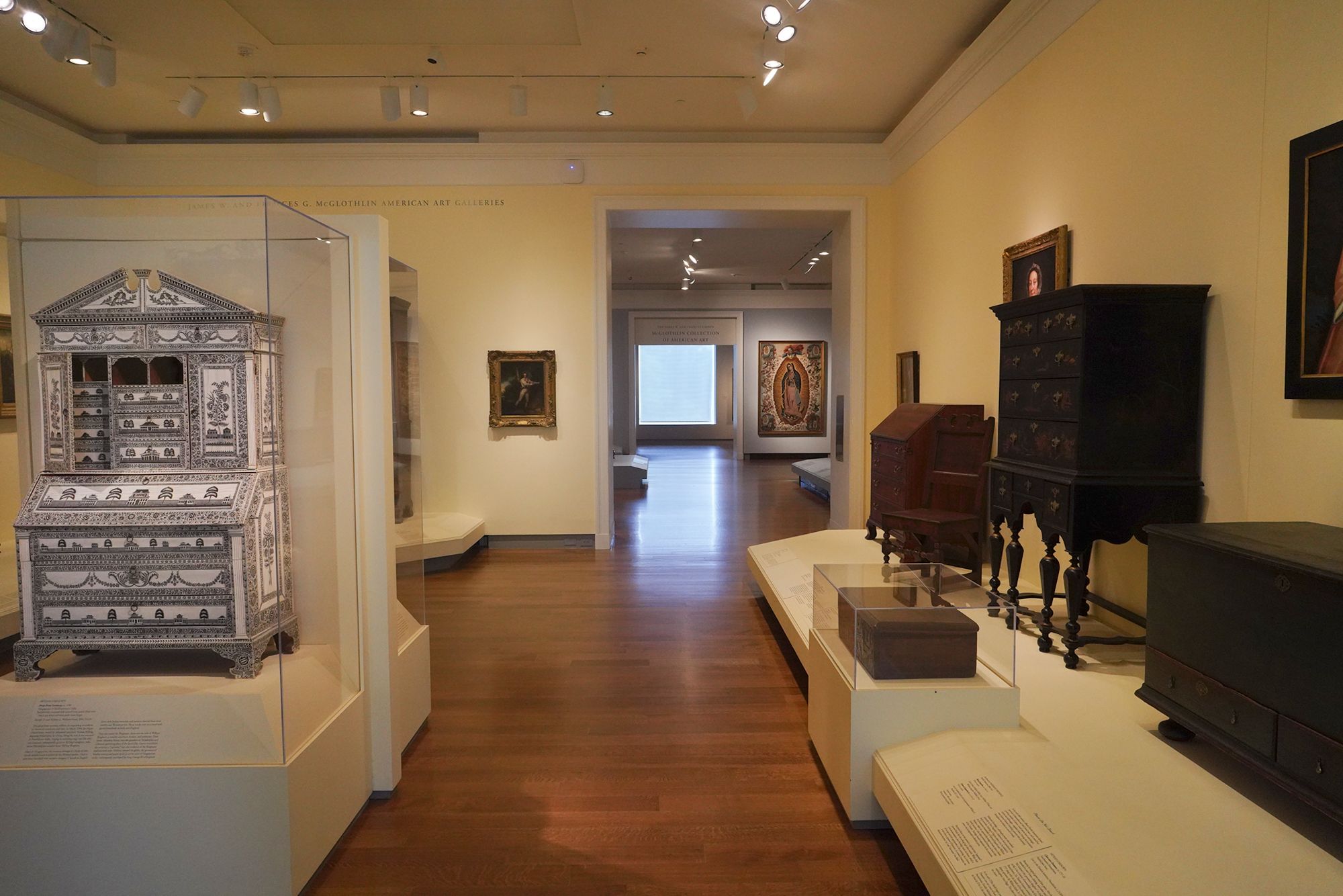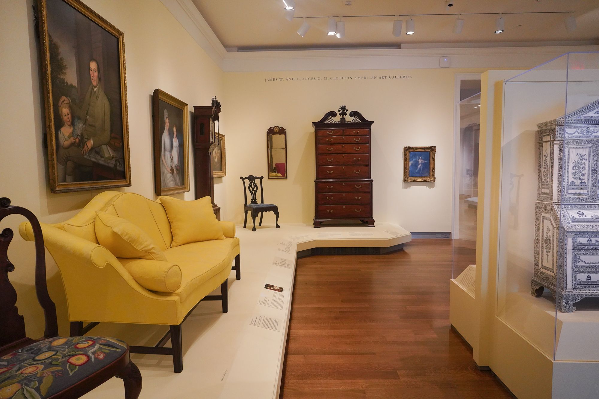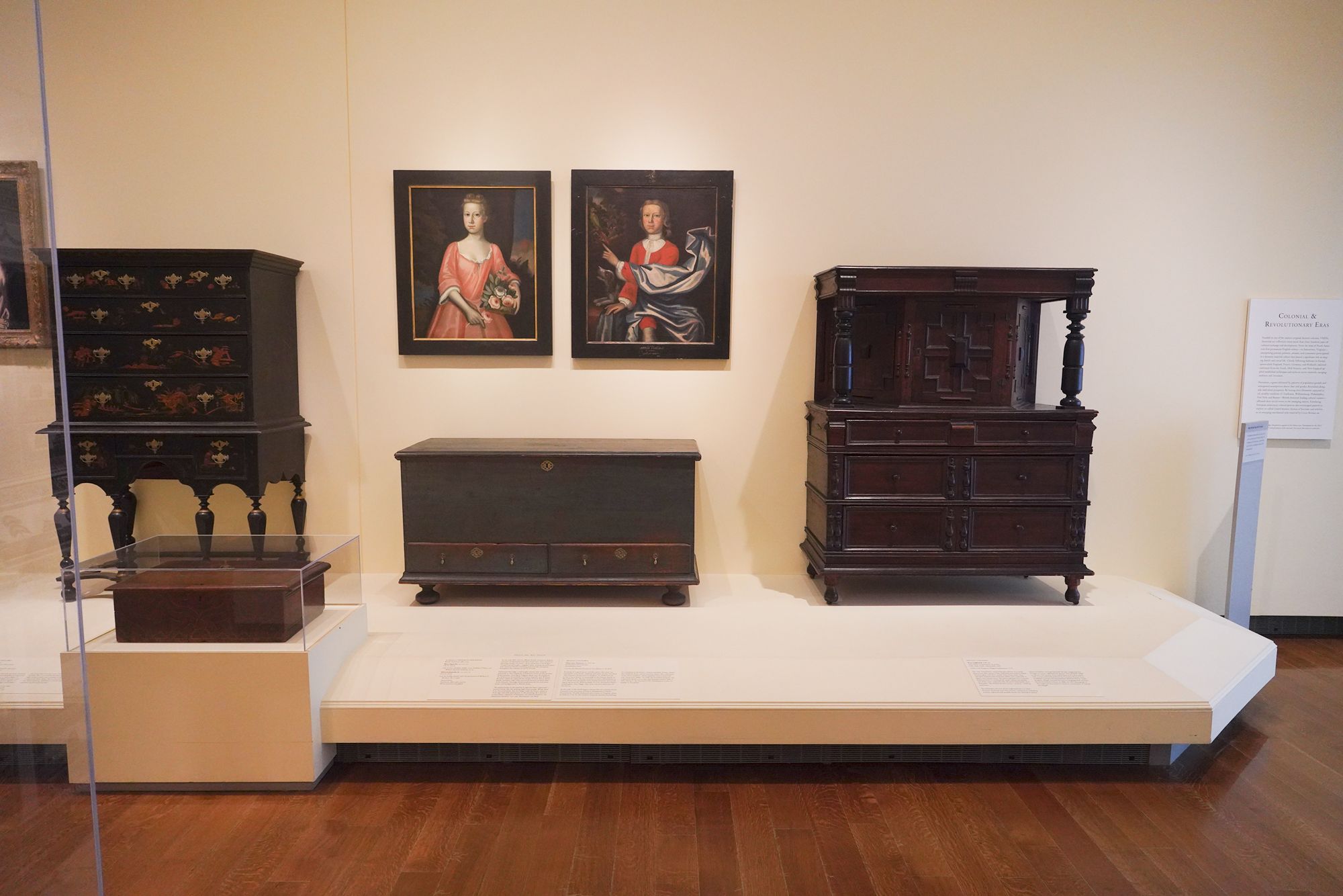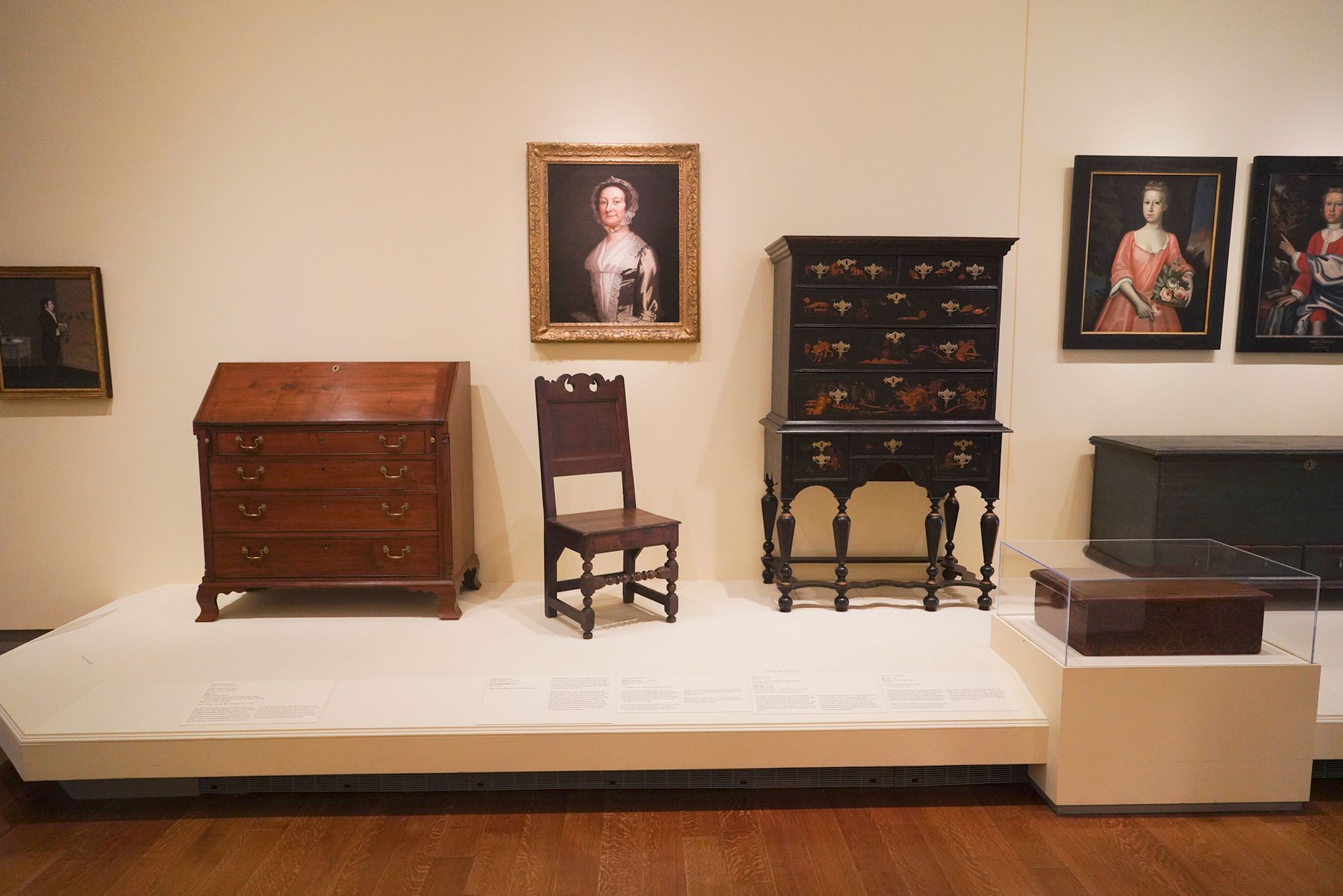 The museum displays Colonial and Revolutionary-era American furniture that highlights the craftsmanship and elegance of the 18th century. These pieces—such as finely carved chairs, high chests, and writing desks—reflect regional styles from places like Philadelphia, Boston, and Williamsburg, featuring mahogany, walnut, and intricate inlays.