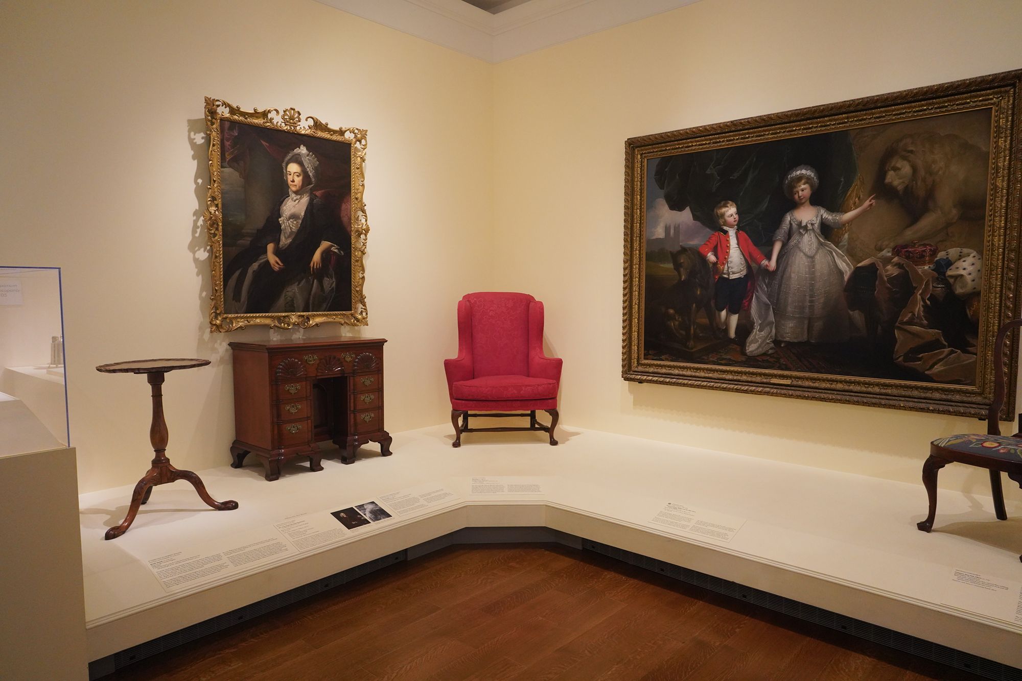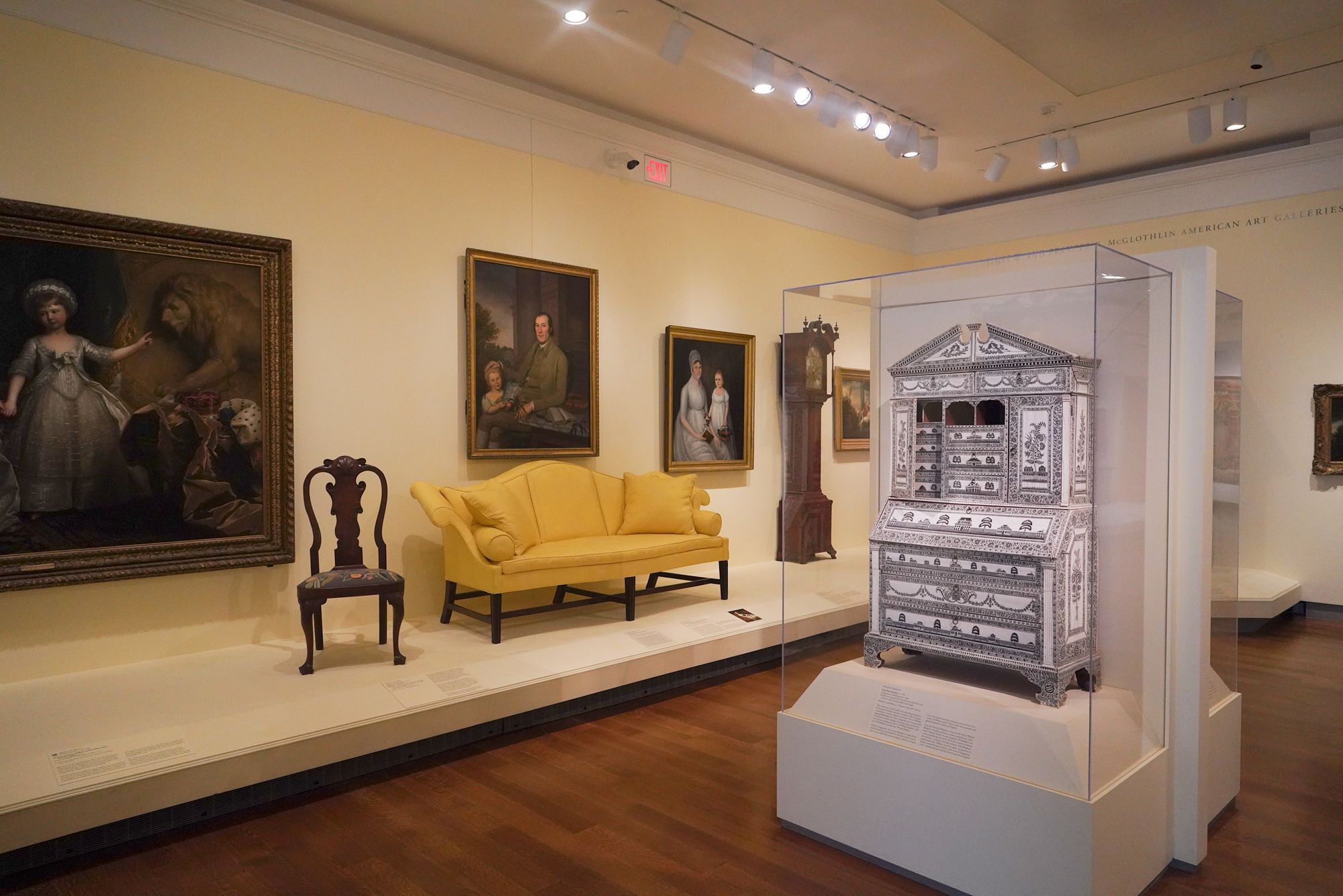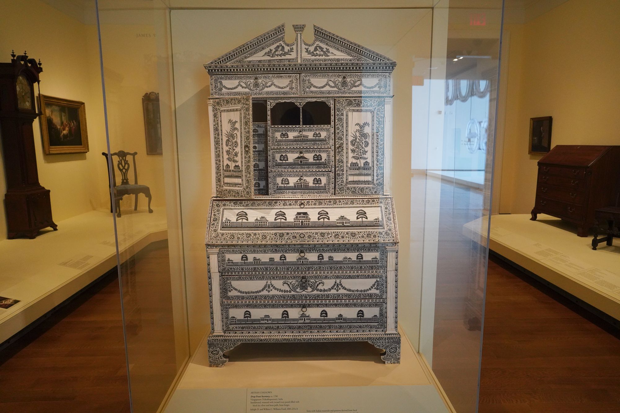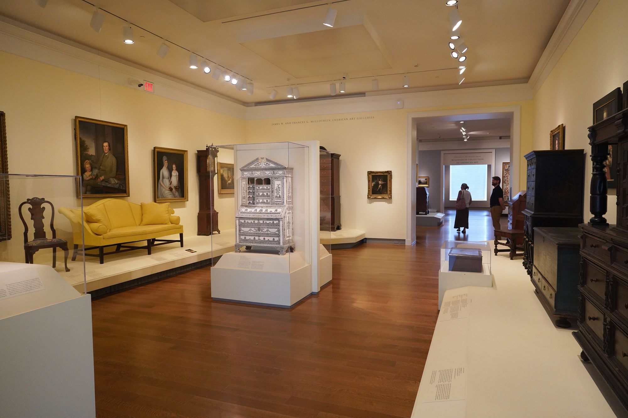 The museum displays Colonial and Revolutionary-era American furniture that highlights the craftsmanship and elegance of the 18th century. These pieces—such as finely carved chairs, high chests, and writing desks—reflect regional styles from places like Philadelphia, Boston, and Williamsburg, featuring mahogany, walnut, and intricate inlays.