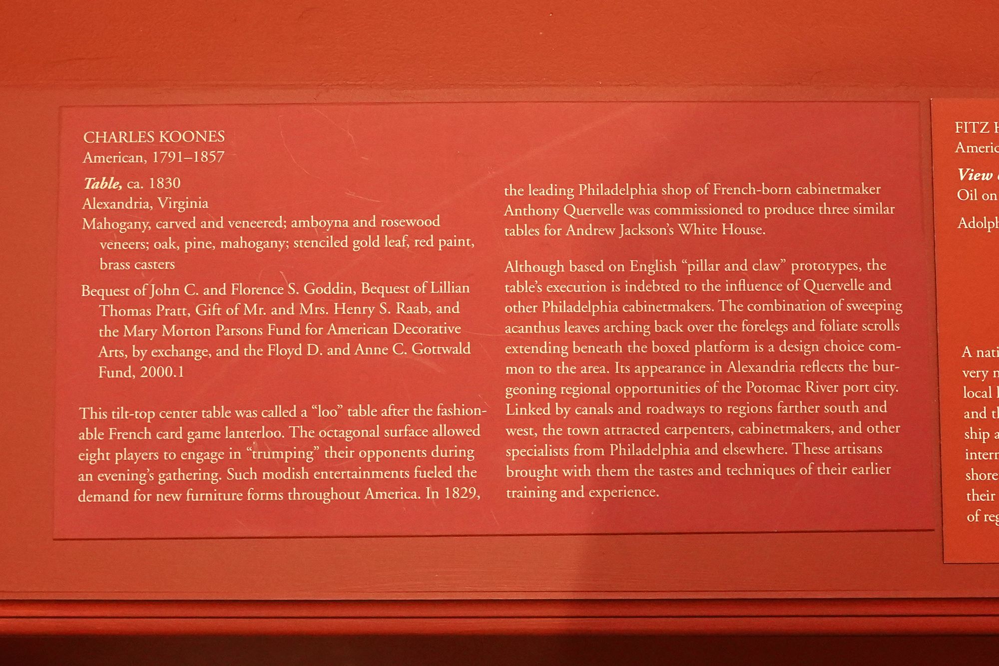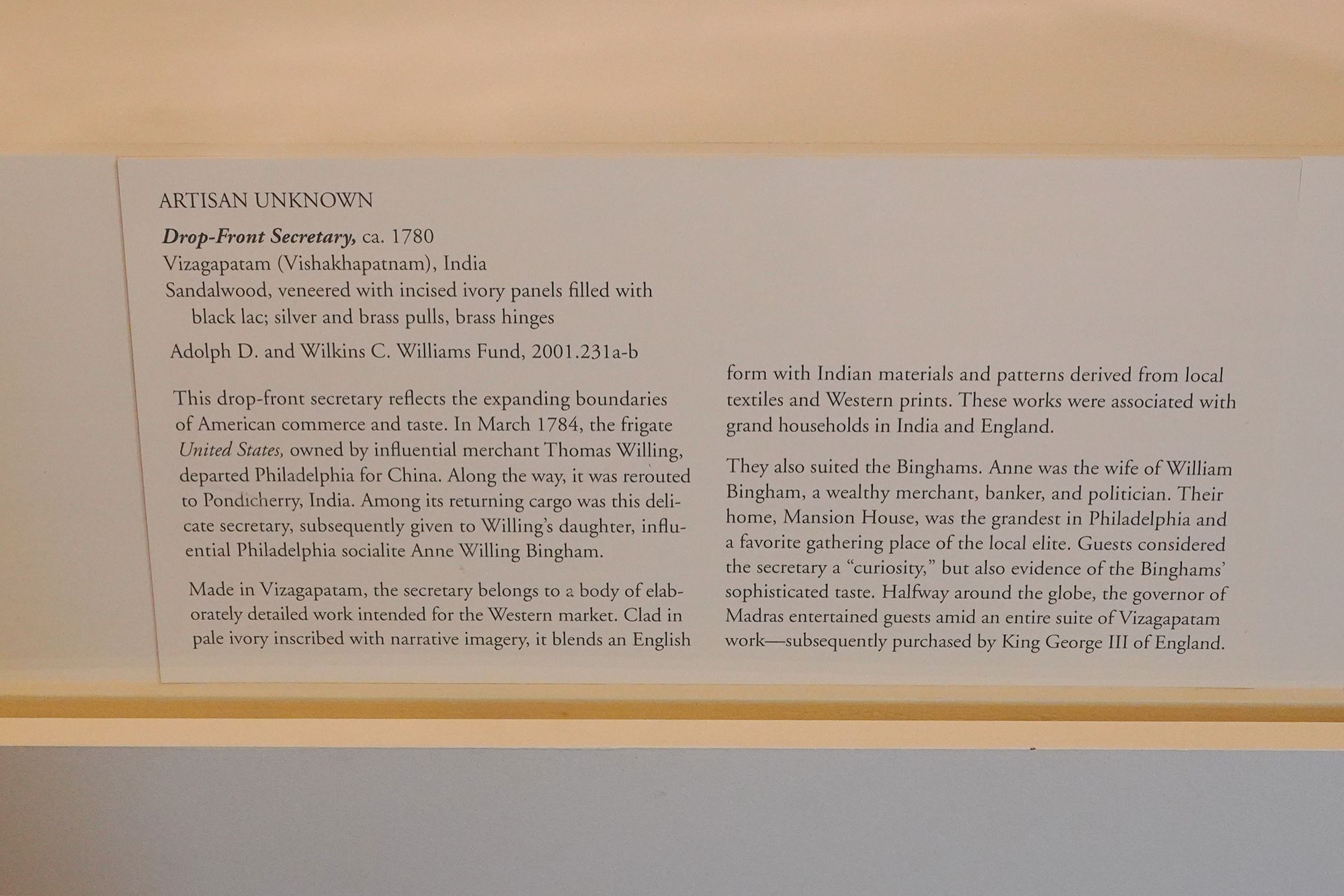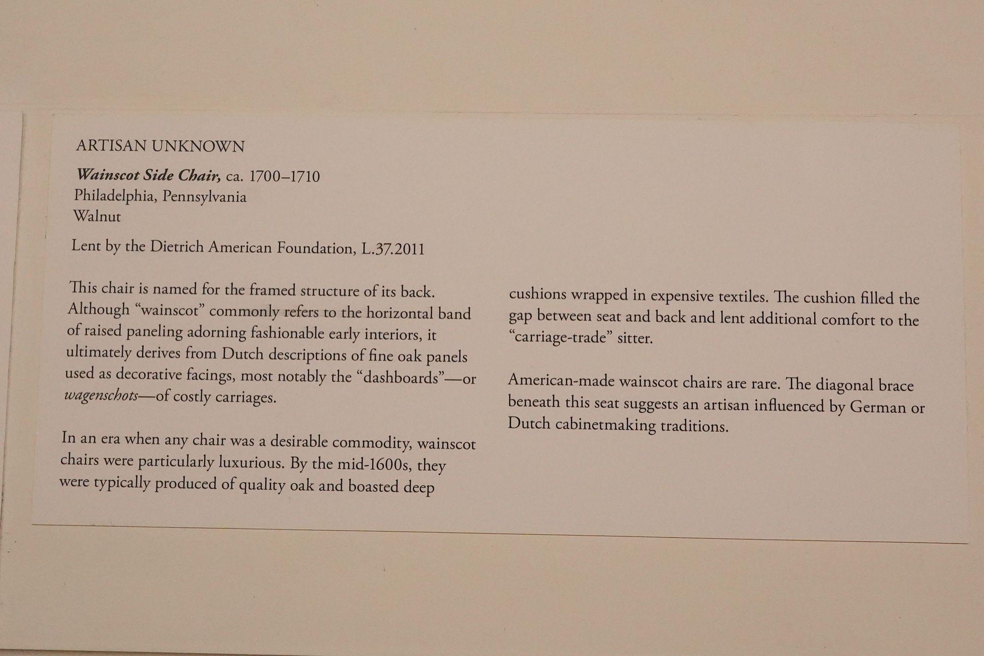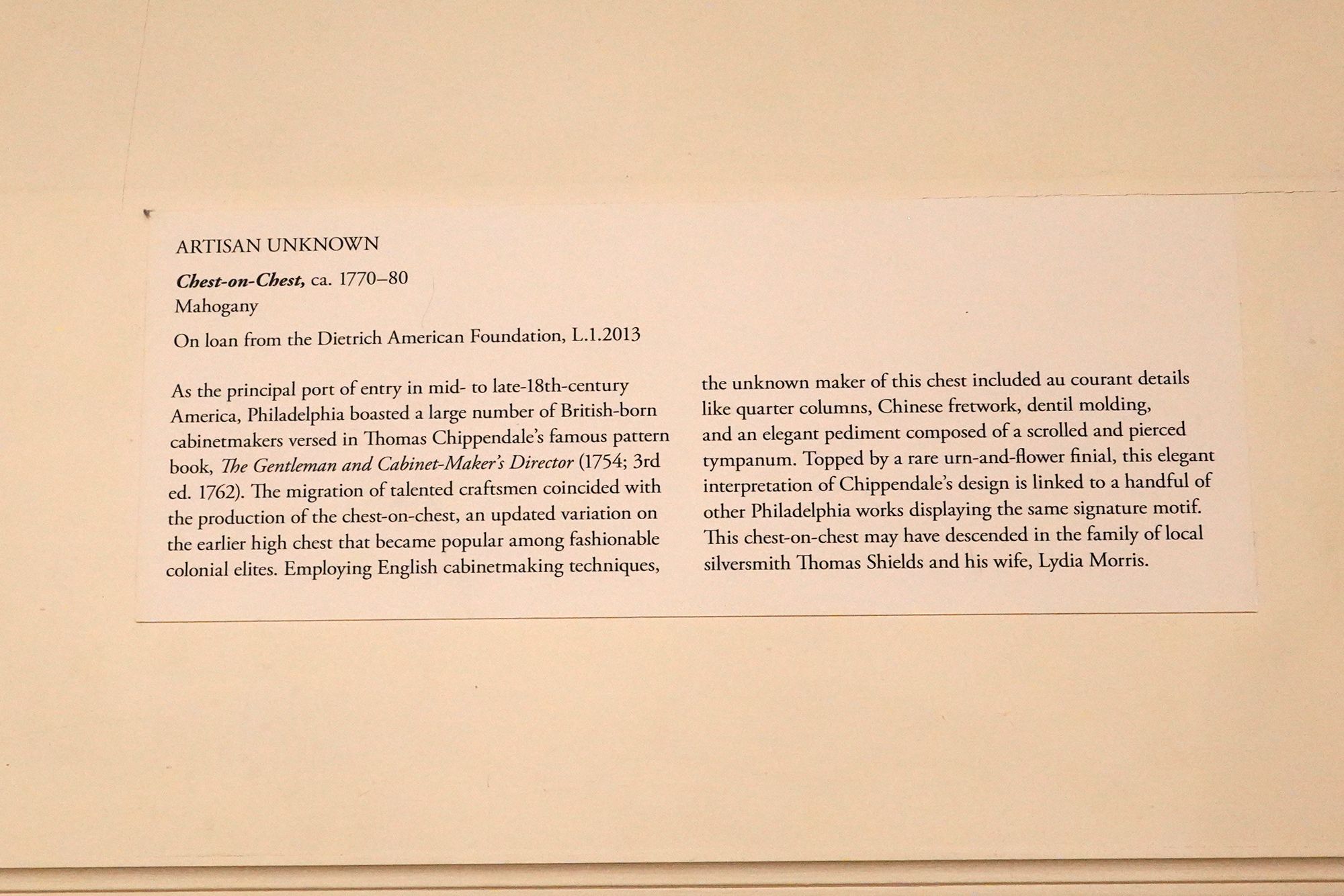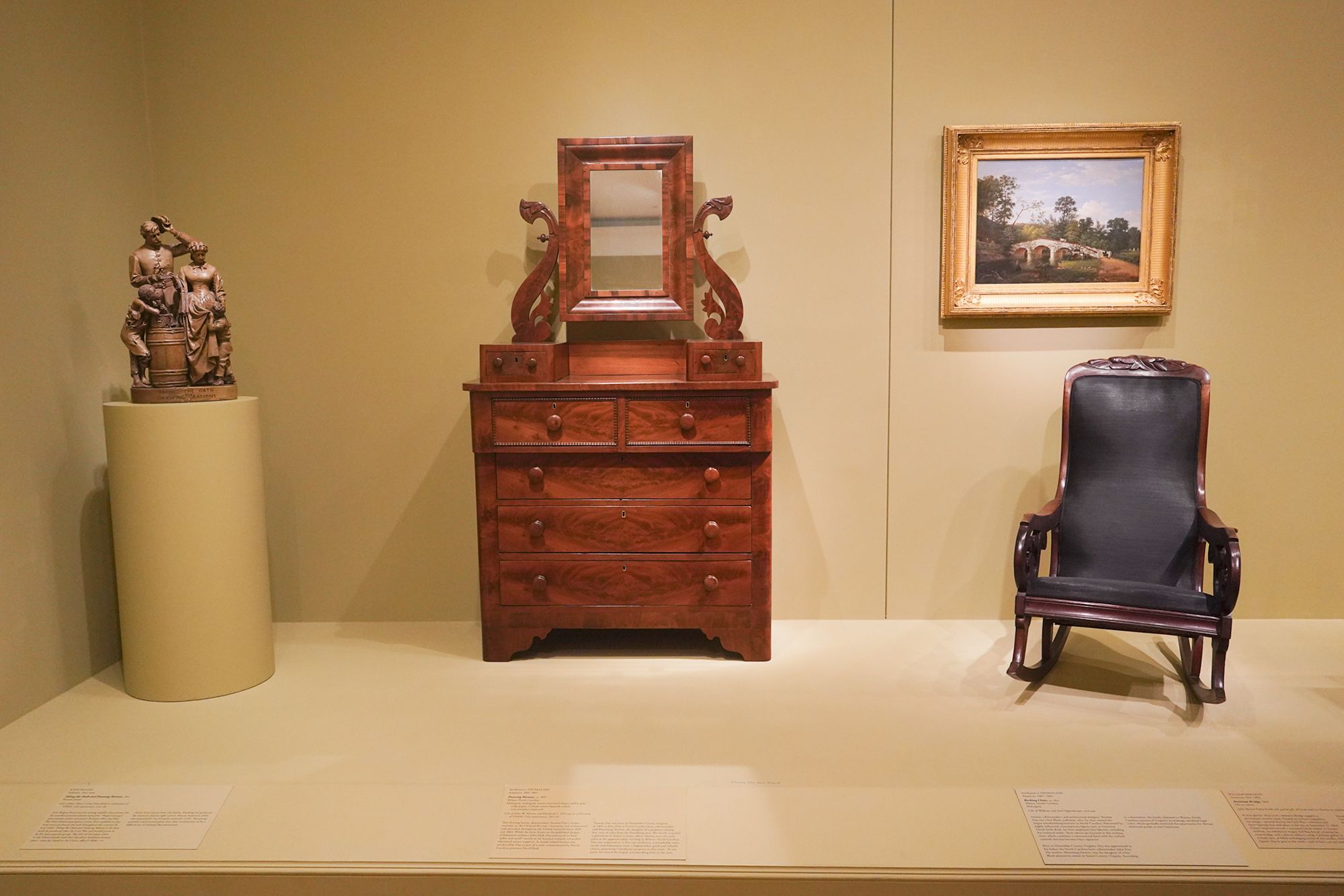 The museum displays Colonial and Revolutionary-era American furniture that highlights the craftsmanship and elegance of the 18th century. These pieces—such as finely carved chairs, high chests, and writing desks—reflect regional styles from places like Philadelphia, Boston, and Williamsburg, featuring mahogany, walnut, and intricate inlays.