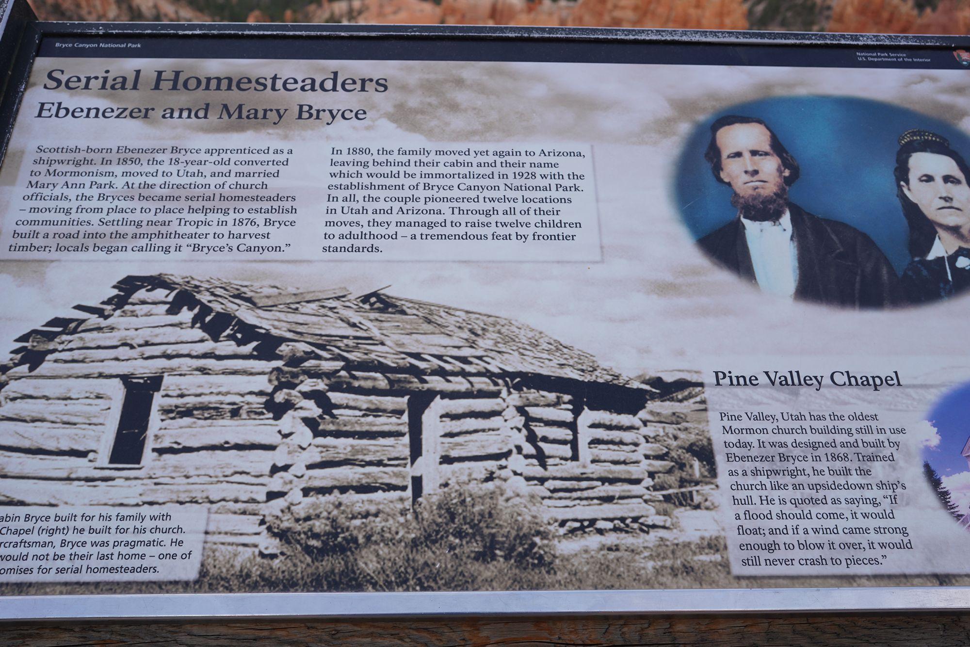 Bryce Canyon was named for early homesteaders Ebenezer and Mary Bryce, who made their home near these dramatic cliffs.