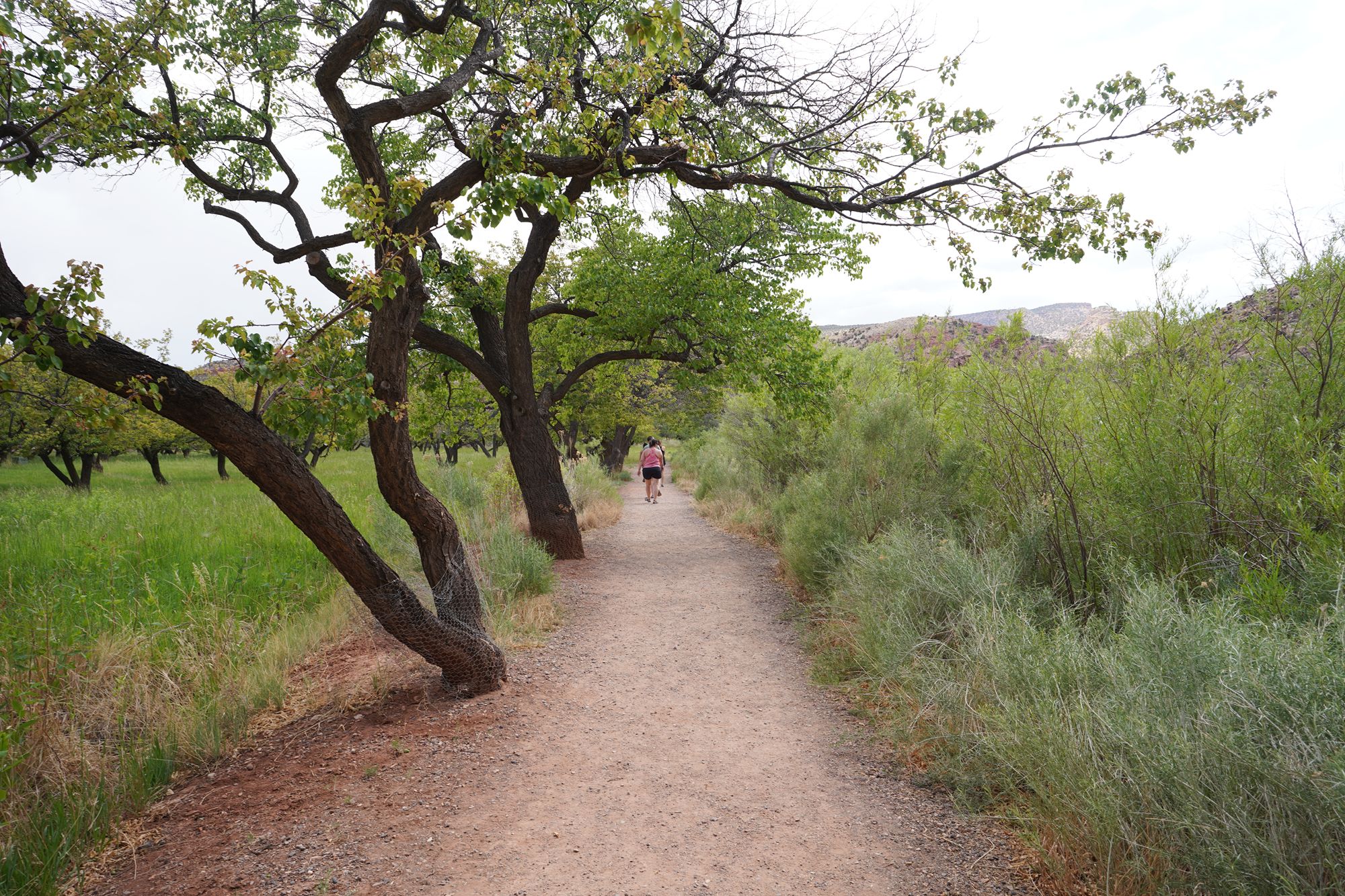 Fremont River Trail follows the Fremont River through a narrow valley, with cottonwood trees, colorful sandstone walls, and a gradual climb to an overlook of the town and orchards below.