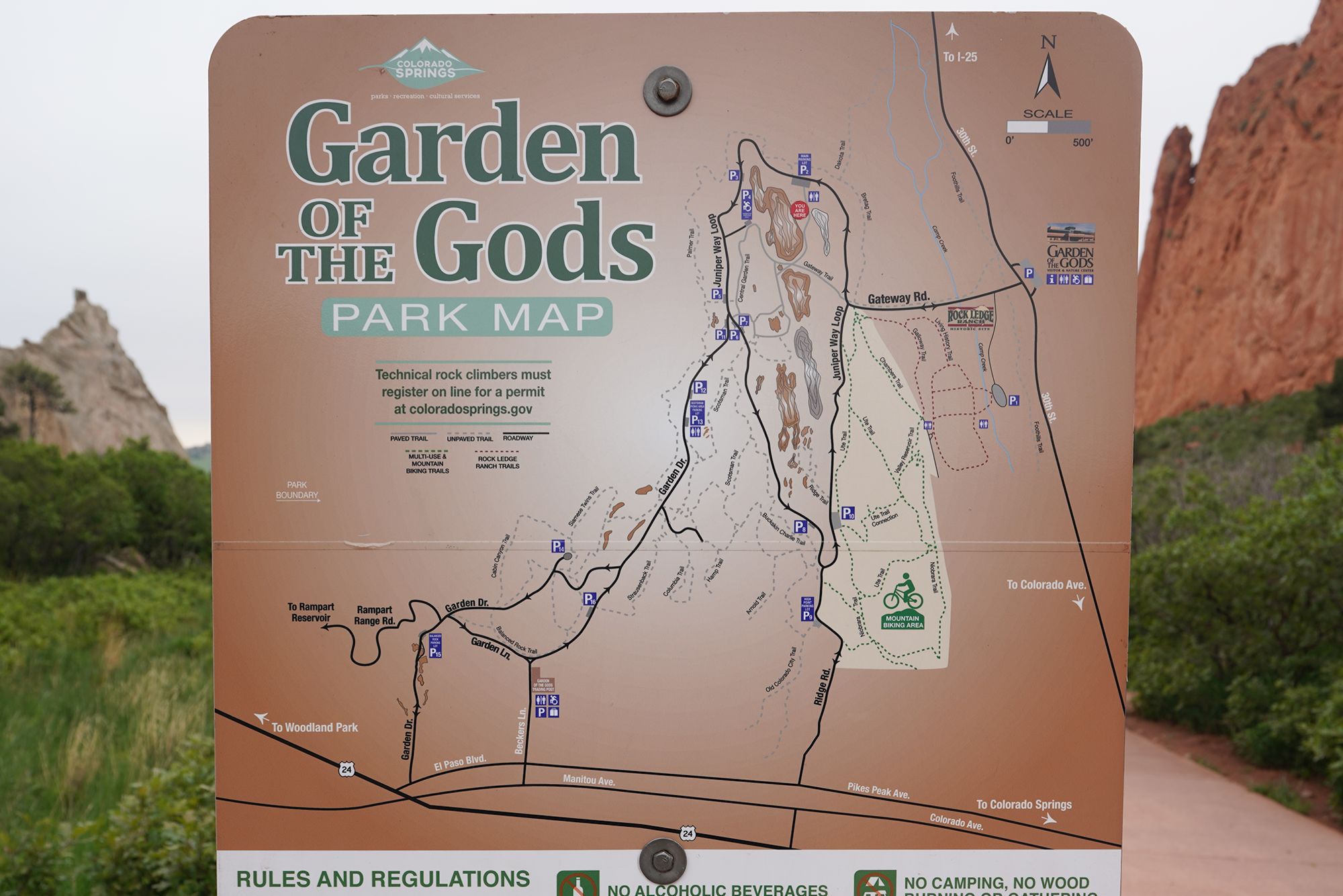 A city near Pikes Peak with red rock formations and beautiful mountain views. 1071