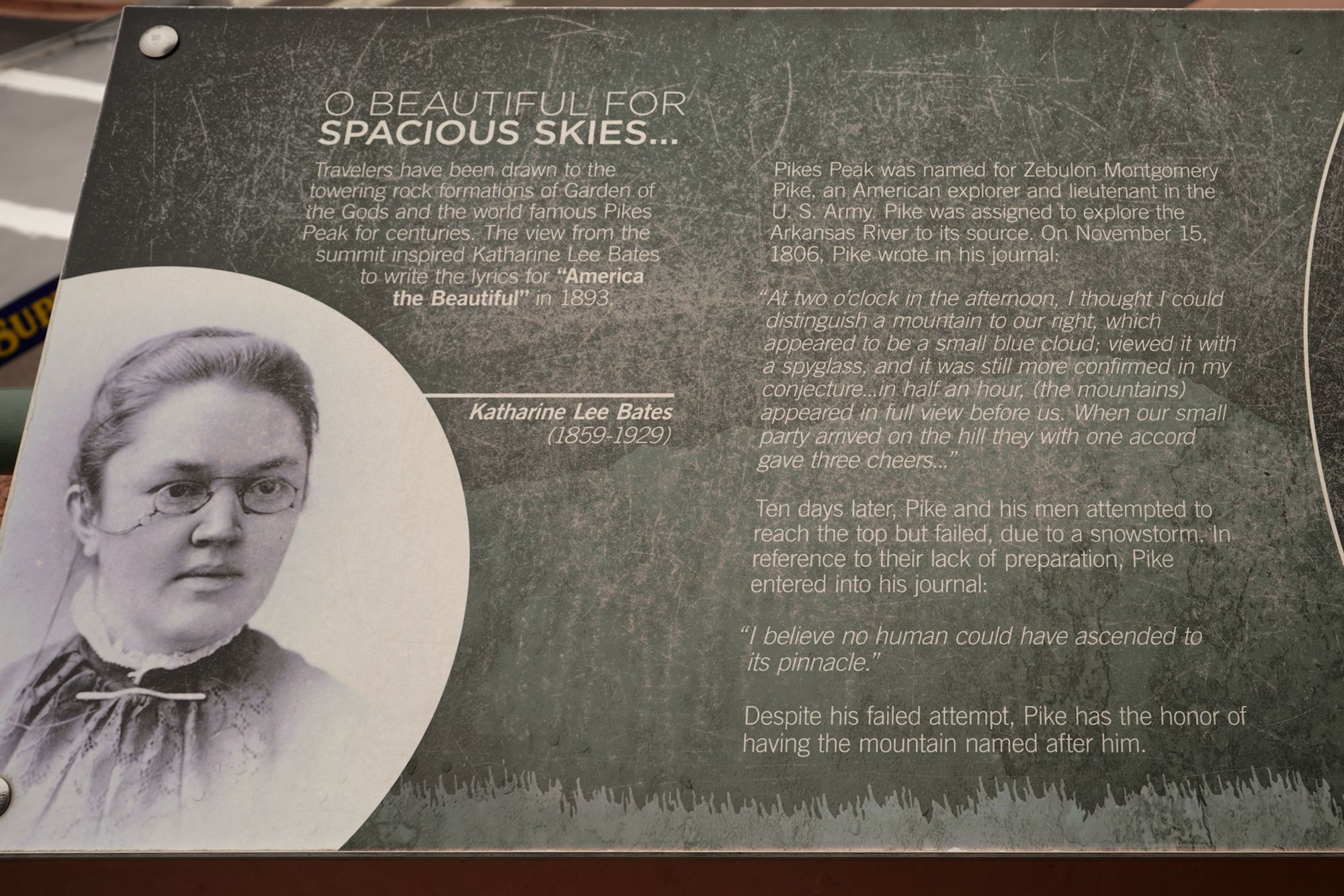 In 1893, while visiting Colorado Springs, Bates traveled up to the summit of Pikes Peak. The sweeping views of the mountains, plains, and skies inspired her to write the poem that later became the patriotic song “America the Beautiful.”