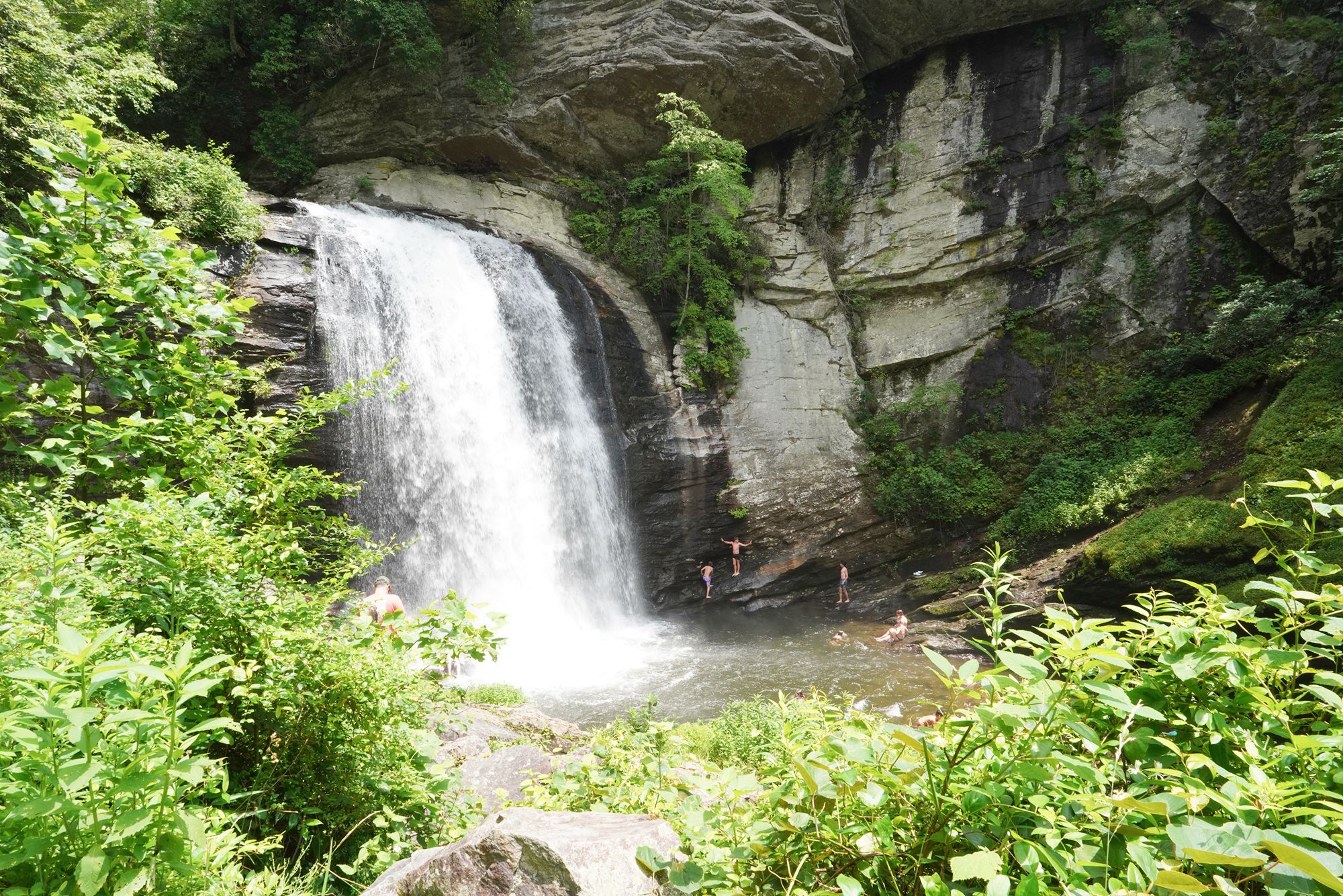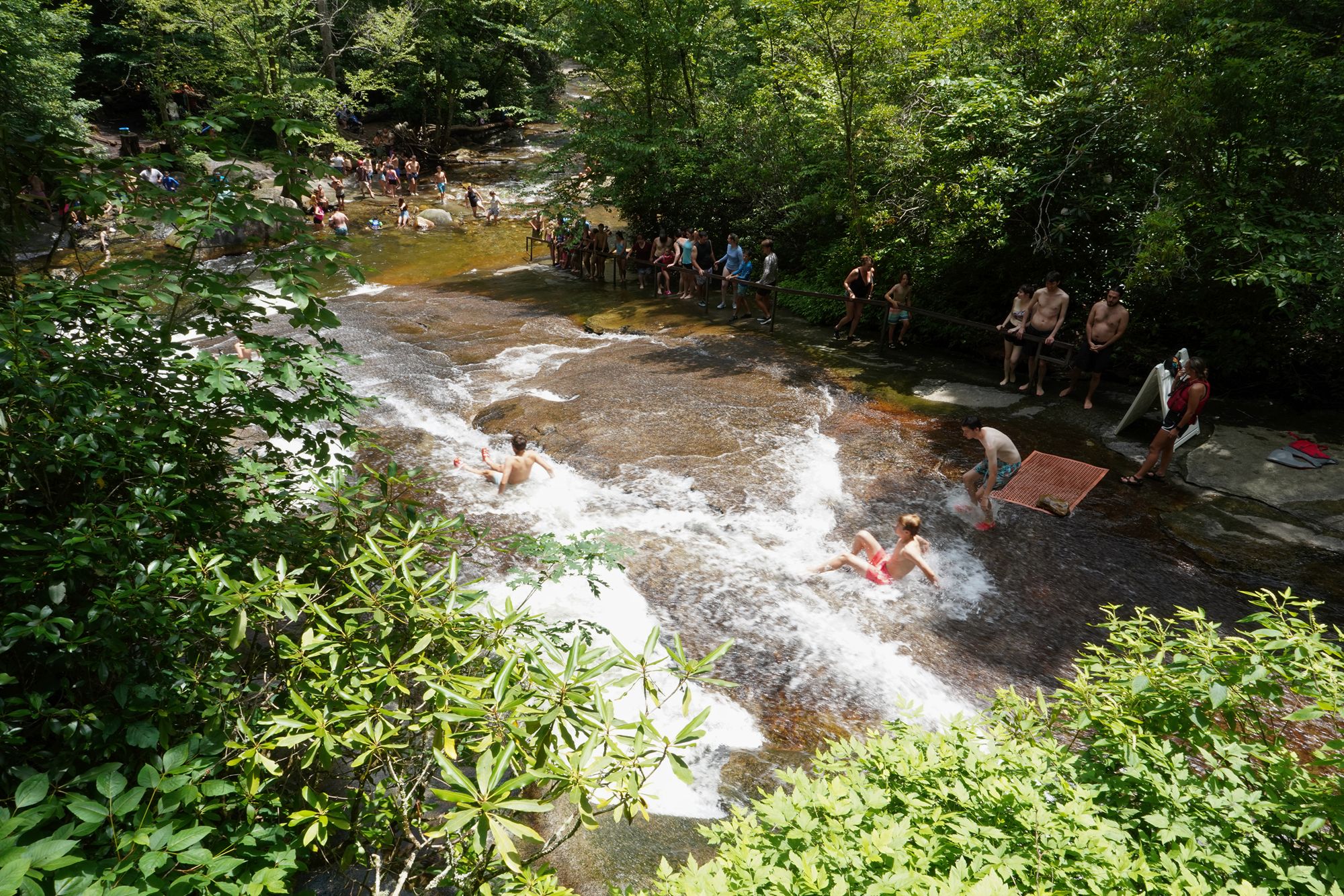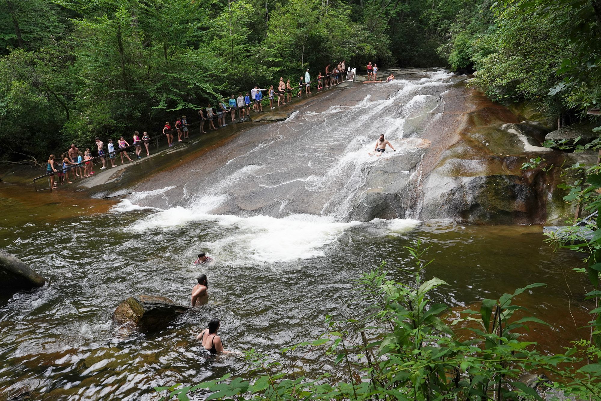 Sliding Rock is a natural 60-foot sloping waterfall in Pisgah National Forest where visitors can slide down the smooth rock face into a cool plunge pool at the bottom. In summer, lifeguards are on duty and the spot becomes a popular, family-friendly swimming and sliding attraction.