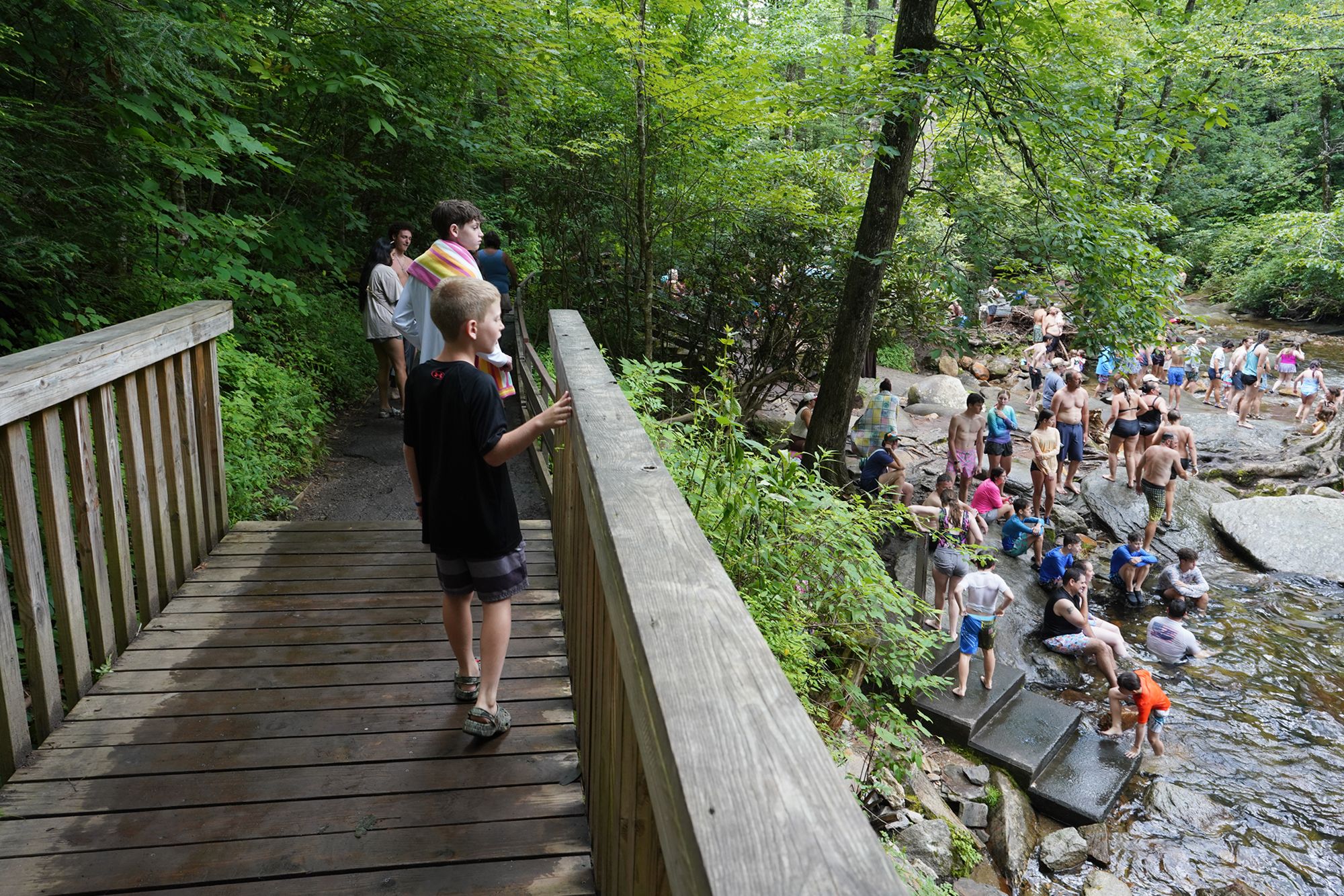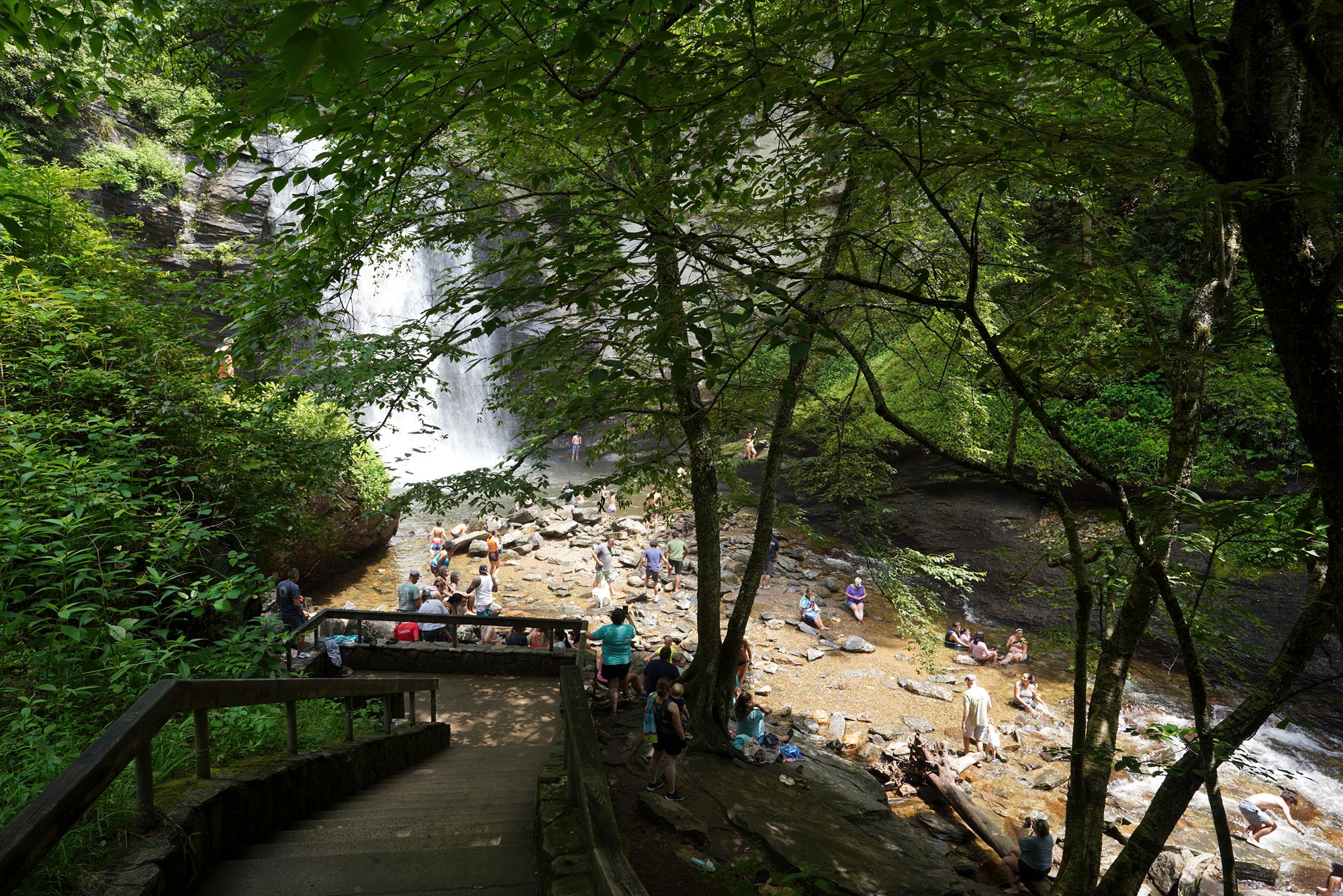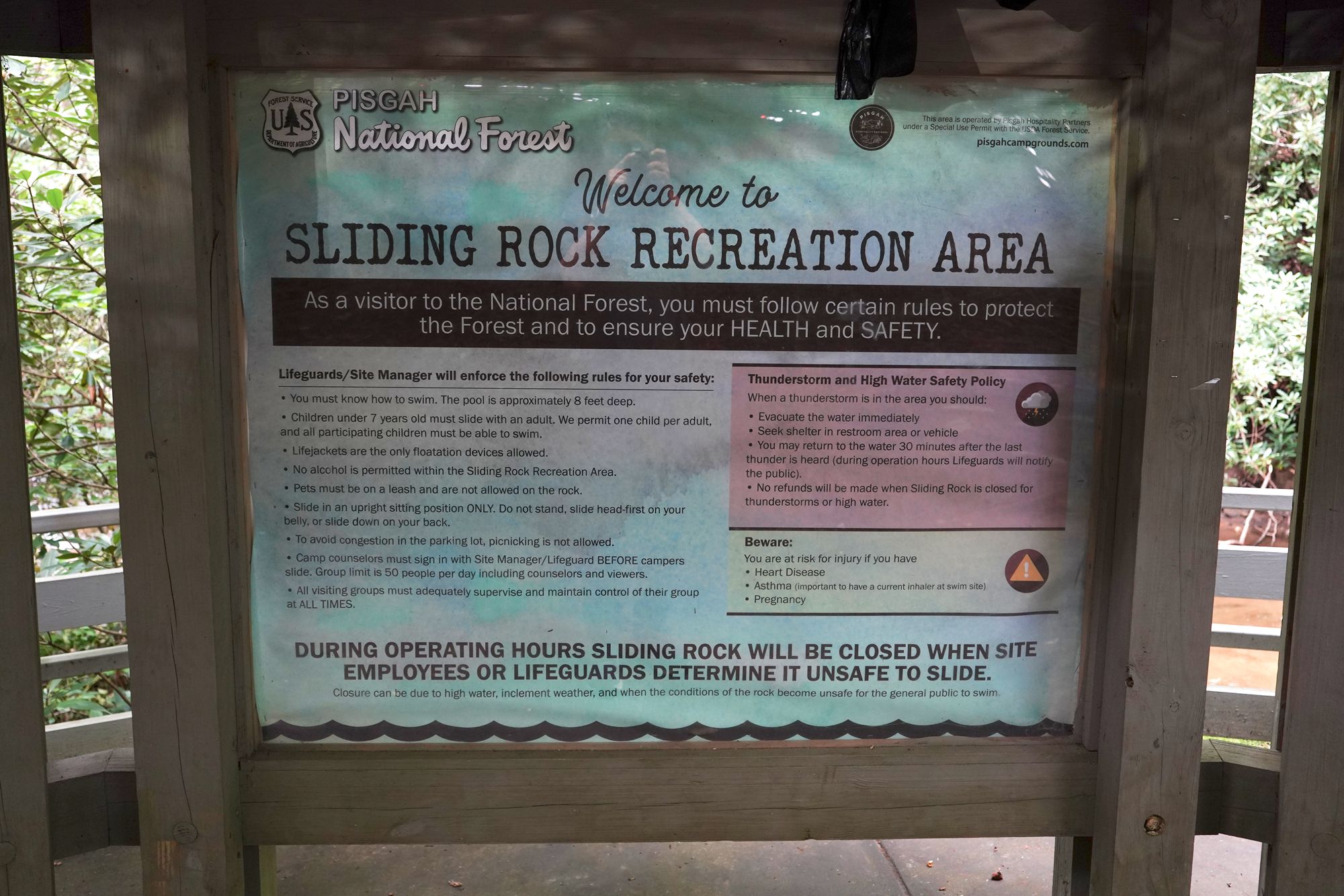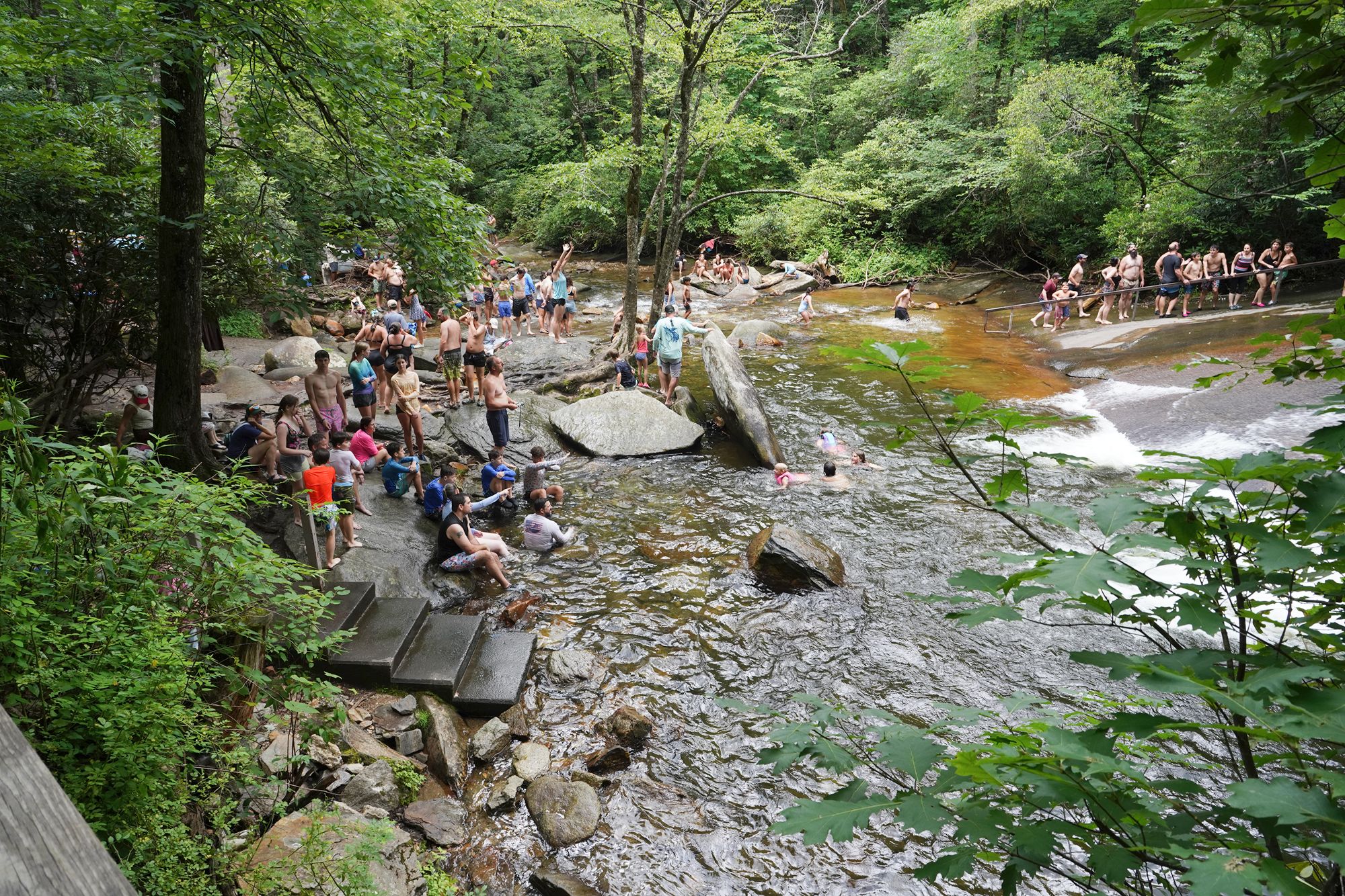 Sliding Rock is a natural 60-foot sloping waterfall in Pisgah National Forest where visitors can slide down the smooth rock face into a cool plunge pool at the bottom. In summer, lifeguards are on duty and the spot becomes a popular, family-friendly swimming and sliding attraction.
