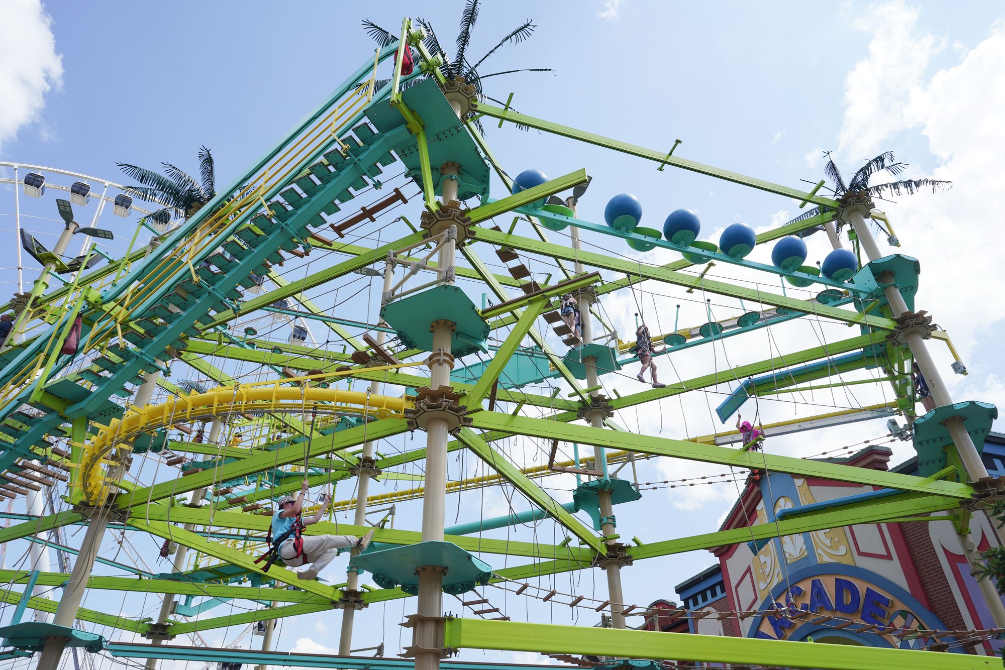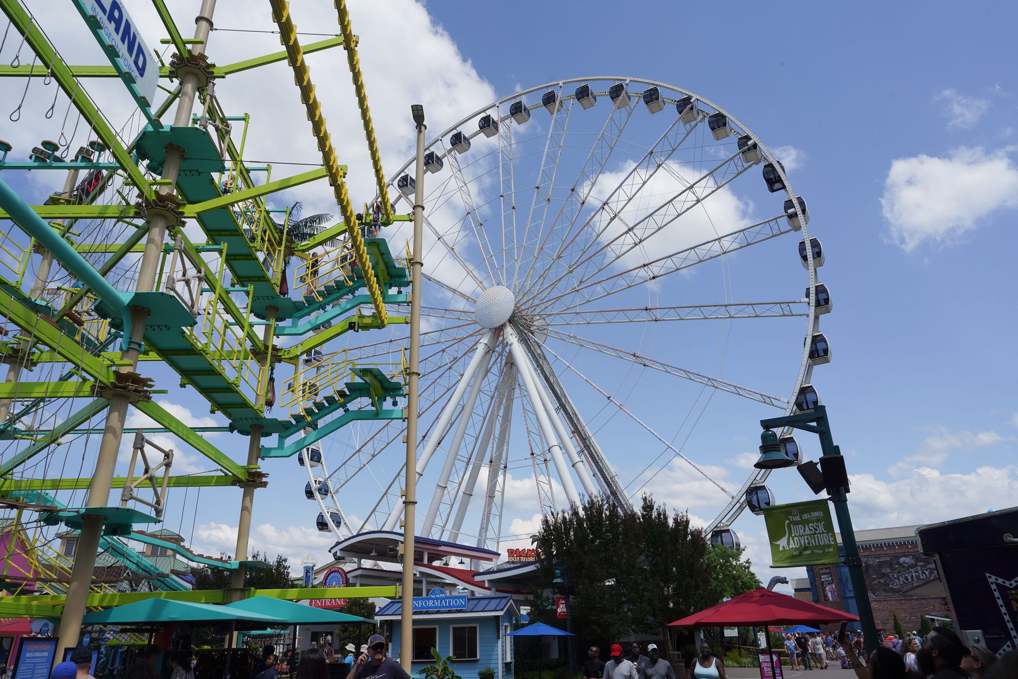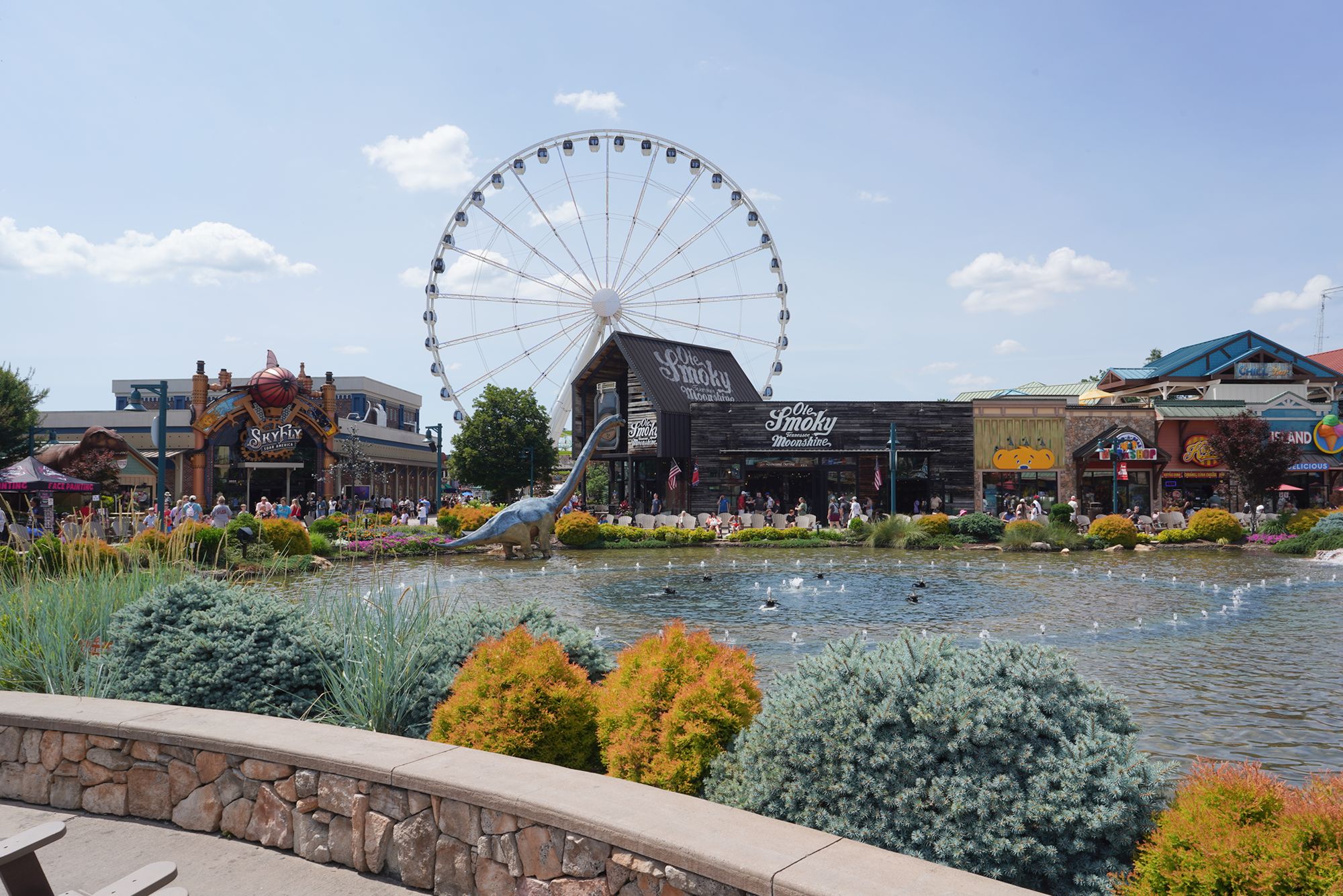 Its most recognizable feature is the Great Smoky Mountain Wheel, a tall observation Ferris wheel that lights up at night and offers broad views of the surrounding mountains and the busy parkway below.